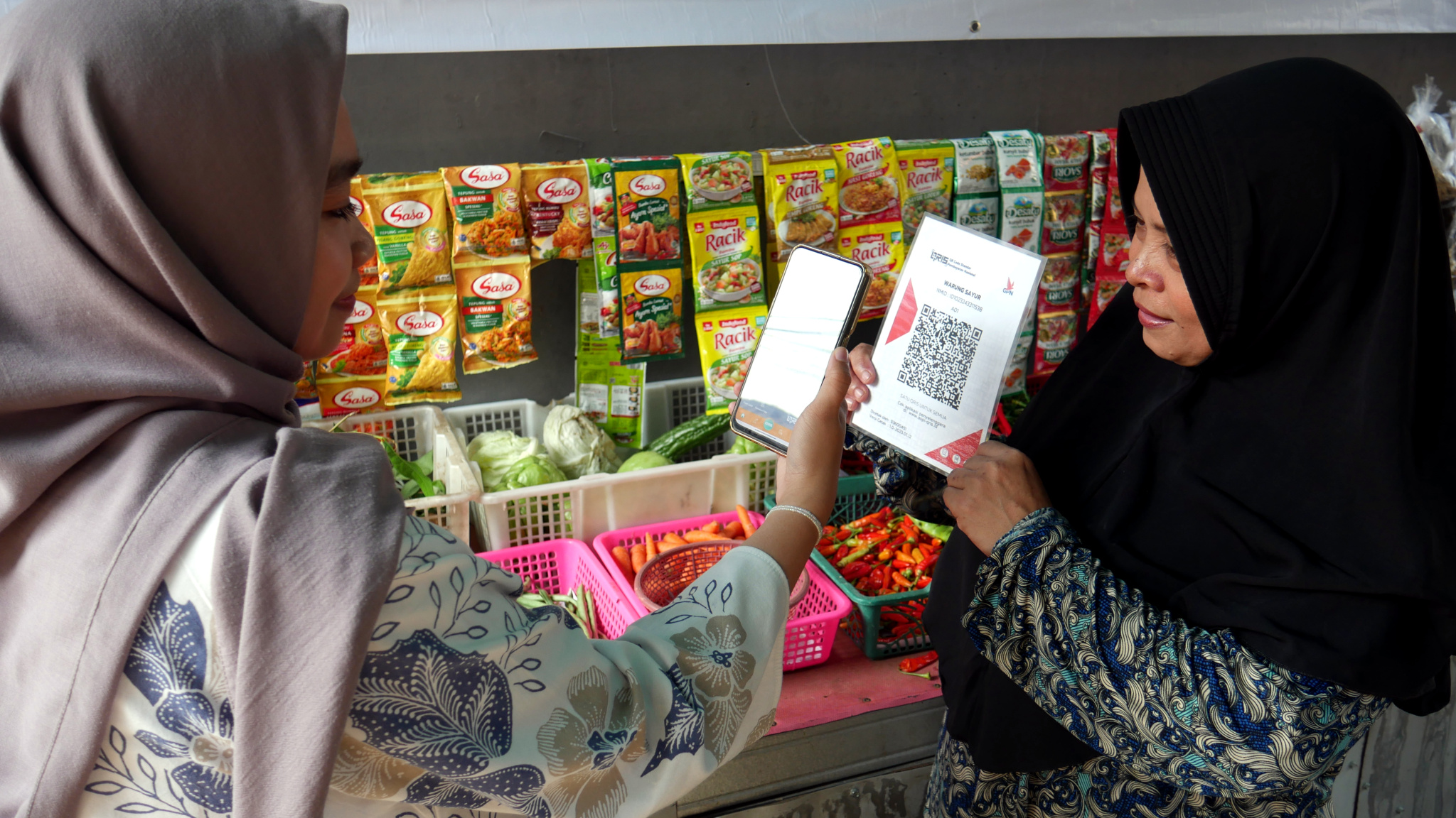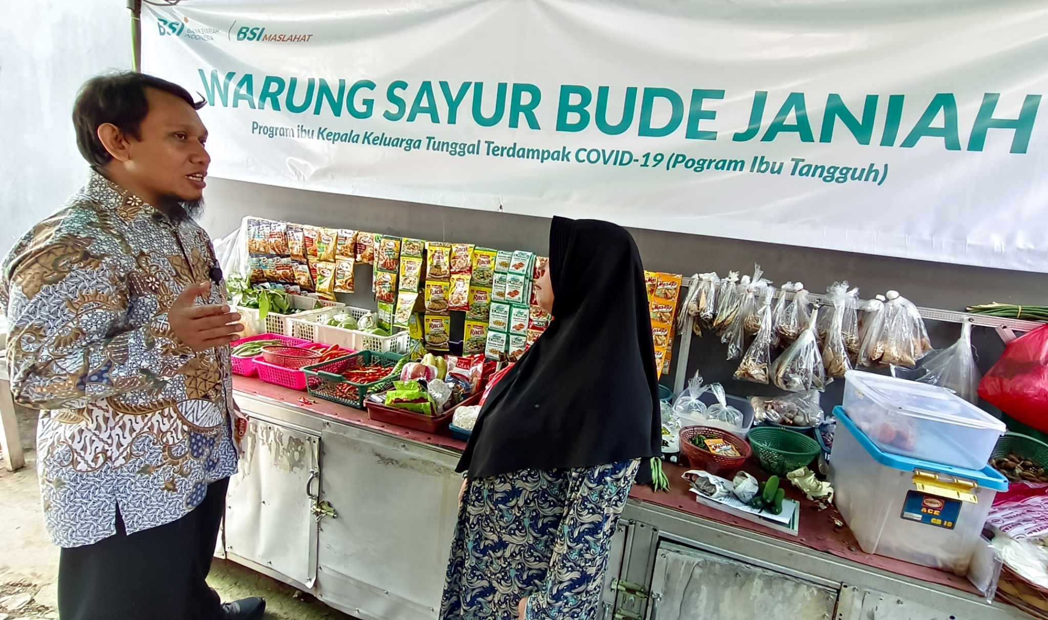 (Kanan ke kiri) Direktur Care Program BSI Maslahat, Ilham Syahputra bersama dengan Penerima manfaat program Ibu Tangguh / Kepala Keluarga Tunggal Terdampak Covid-19, Ibu Janiah ketika ditemui di lokasi usaha, di Bakti Jaya, Sukma Jaya, Depok, Senin (17/7).