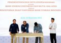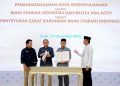 Direktur Utama BSI Hery Gunardi (kiri pertama) saat menyaksikan penandatanganan nota kesepahaman antara BSI Maslahat dengan Baitul Mal Aceh oleh Direktur Eksekutif BSI Maslahat Sukoriyanto Saputro (kiri kedua) dengan Ketua Badan Baitul Mal Aceh Mohammad Haikal (kanan kedua) yang disaksikan juga oleh Asisten 3 Provinsi Aceh Iskandar (kanan pertama), di acara Topping Off Green Building BSI Aceh, Banda Aceh (15/11).