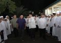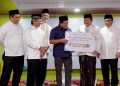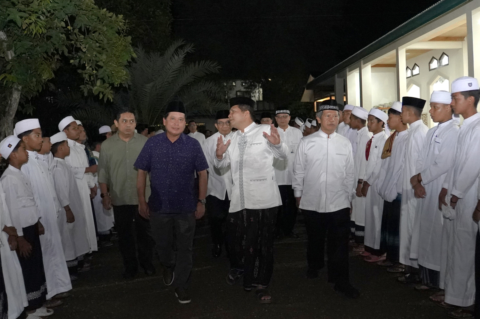 Dari kiri ke kanan: Direktur Penjualan & Distribusi Anton Sukarna, Ketua DPS BSI Dr. KH. Hasanudin, M.Ag, Wakil Komisaris Utama BSI Adiwarman Karim, Direktur Utama BSI Hery Gunardi, Pimpinan YLPI Mahyal Ulum Al-Aziziyah Tengku H Faisal Ali, dan Komisaris Utama BSI Muliaman Hadad saat silaturahmi serta penyerahan bantuan pembangunan fasilitas pendidikan dan pembelajaran bagi para santri senilai Rp 500 juta di YLPI Dayah Mahyal Ulum Al Aziziyah, Kabupaten Aceh Besar, Selasa (14/11).