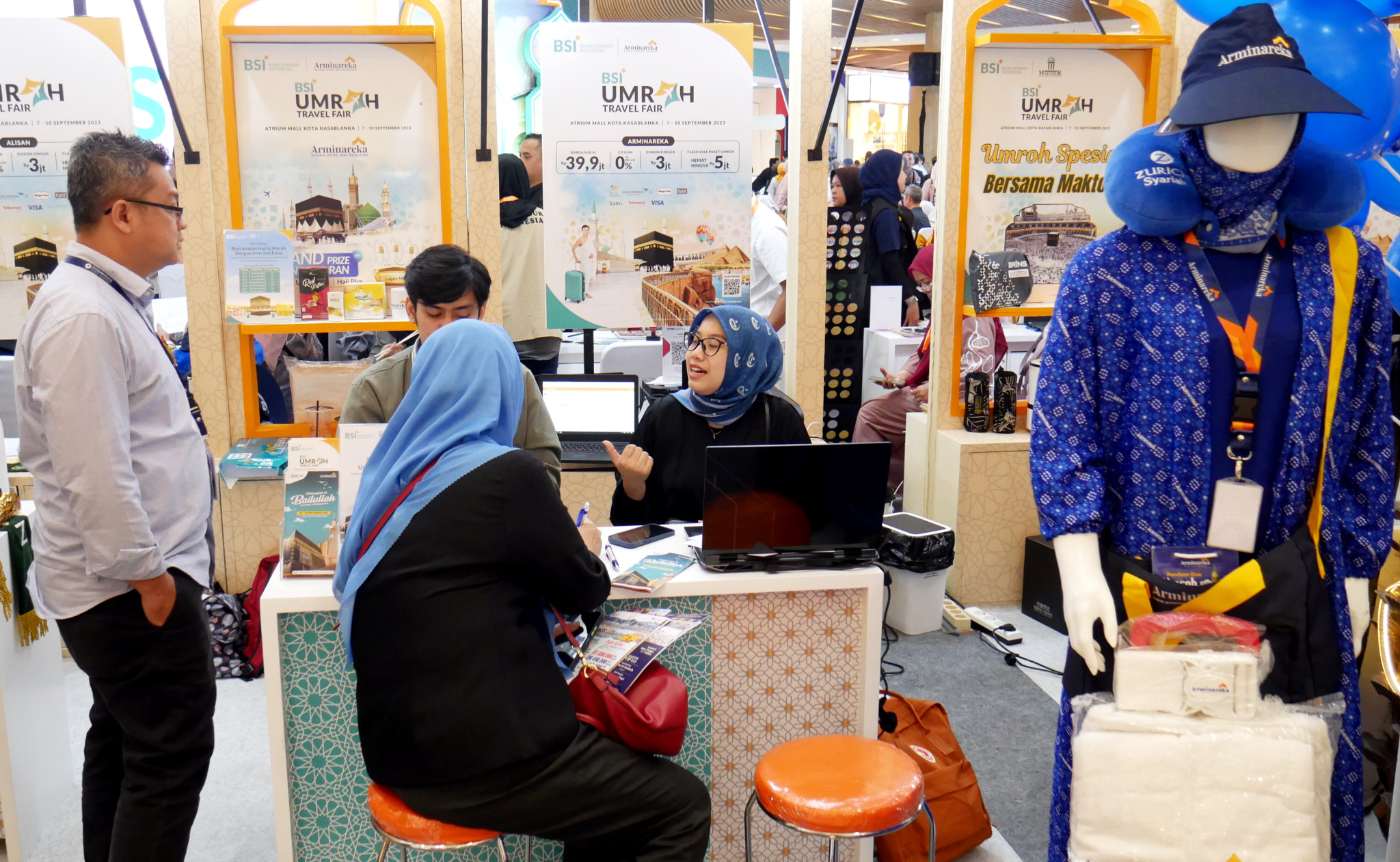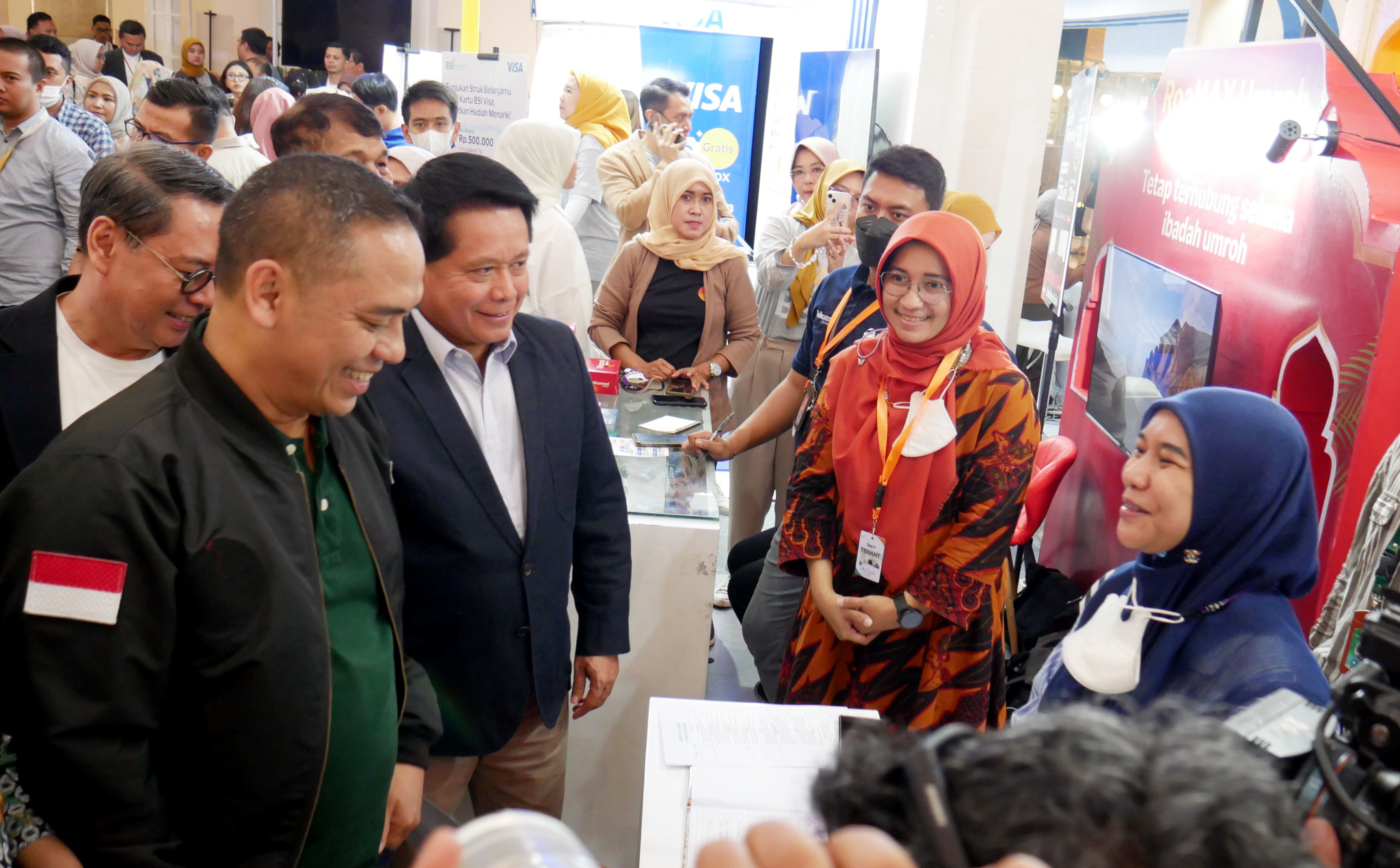 Direktur Utama BSI Hery Gunardi (tengah) bersama Wakil Menteri Agama Republik Indonesia Saiful Rahmat Dasuki (kiri) saat mengunjung salah satu merchant peserta BSI Umrah Travel Fair di Main Atrium Kota Kasablanka, Jakarta (07/09)