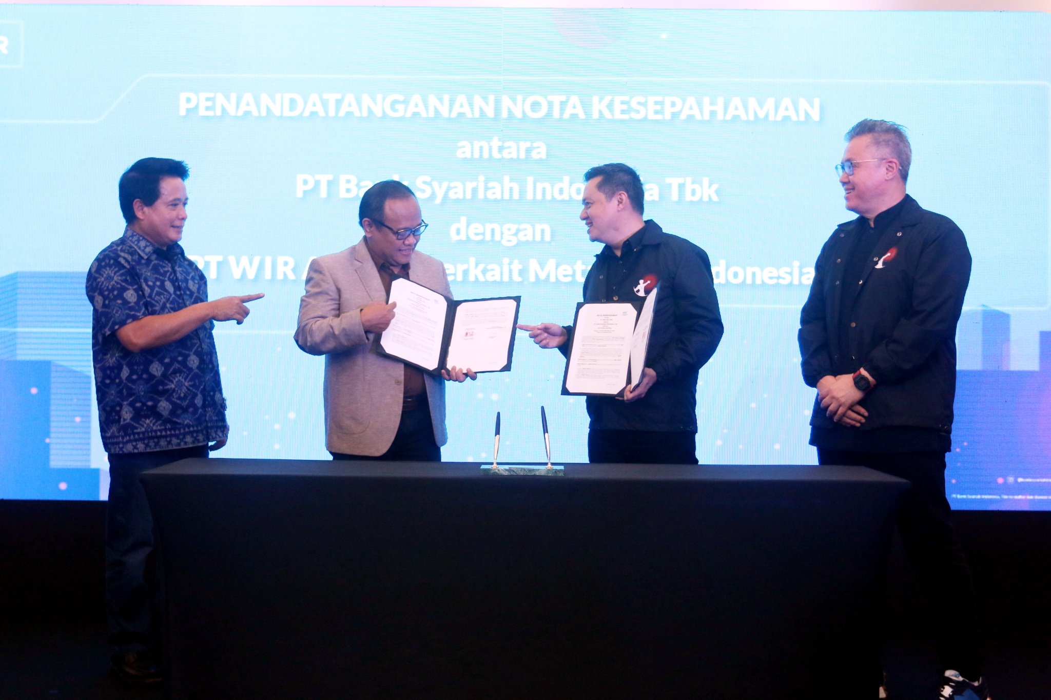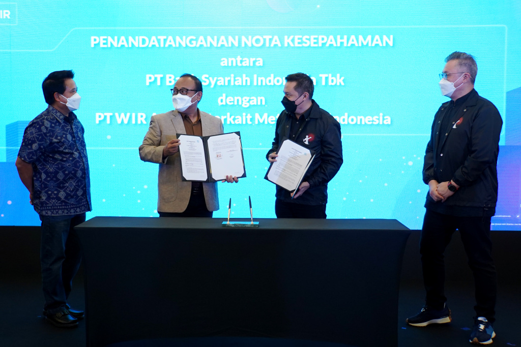 PT Bank Syariah Indonesia Tbk (BSI) dan PT WIR Group Tbk menjajaki kerjasama pengembangan layanan metaverse kanal realitas virtual yang dituangkan dalam penandatangan nota kesepahaman dan disaksikan oleh Direktur Utama BSI Hery Gunardi (kiri) di Jakarta, Selasa (26/04).