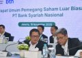 RUPSLB Bank Syariah Nasional (BSN) yang dipimpin oleh Komisaris Utama merangkap sebagai komisaris independent BSN Bahrullah Akbar didampingi oleh jajaran komisaris, Direktur Utama BSN Alex Sofjan Noor, Wakil Direktur Utama BSN Arga M. Nugraha beserta jajaran Direksi BSN lainnya menyetujui 4 mata acara yang menjadi agenda dalam RUPSLB, ya g diselenggarakan di Jakarta, Rabu (19/11). Setelah resmi menerima limpahan aset dan liability Unit Usaha Syariah (UUS) BTN, Bank Syariah Nasional (BSN) menyatakan kesiapannya untuk menjadi katalitas penguat pangsa pasar syariah di Indonesia. BSN pasca spin off beraset sekitar Rp71 Triliun juga siap mengejar pertumbuhan aset perseroan diatas Rp100 Triliun pada 2 tahun ke depan. Kesiapan BSN yang saat ini masuk dalam kelompok Bank Syariah dengan aset terbesar kedua di Indonesia juga disampaikan pada RUPSLB tersebut.