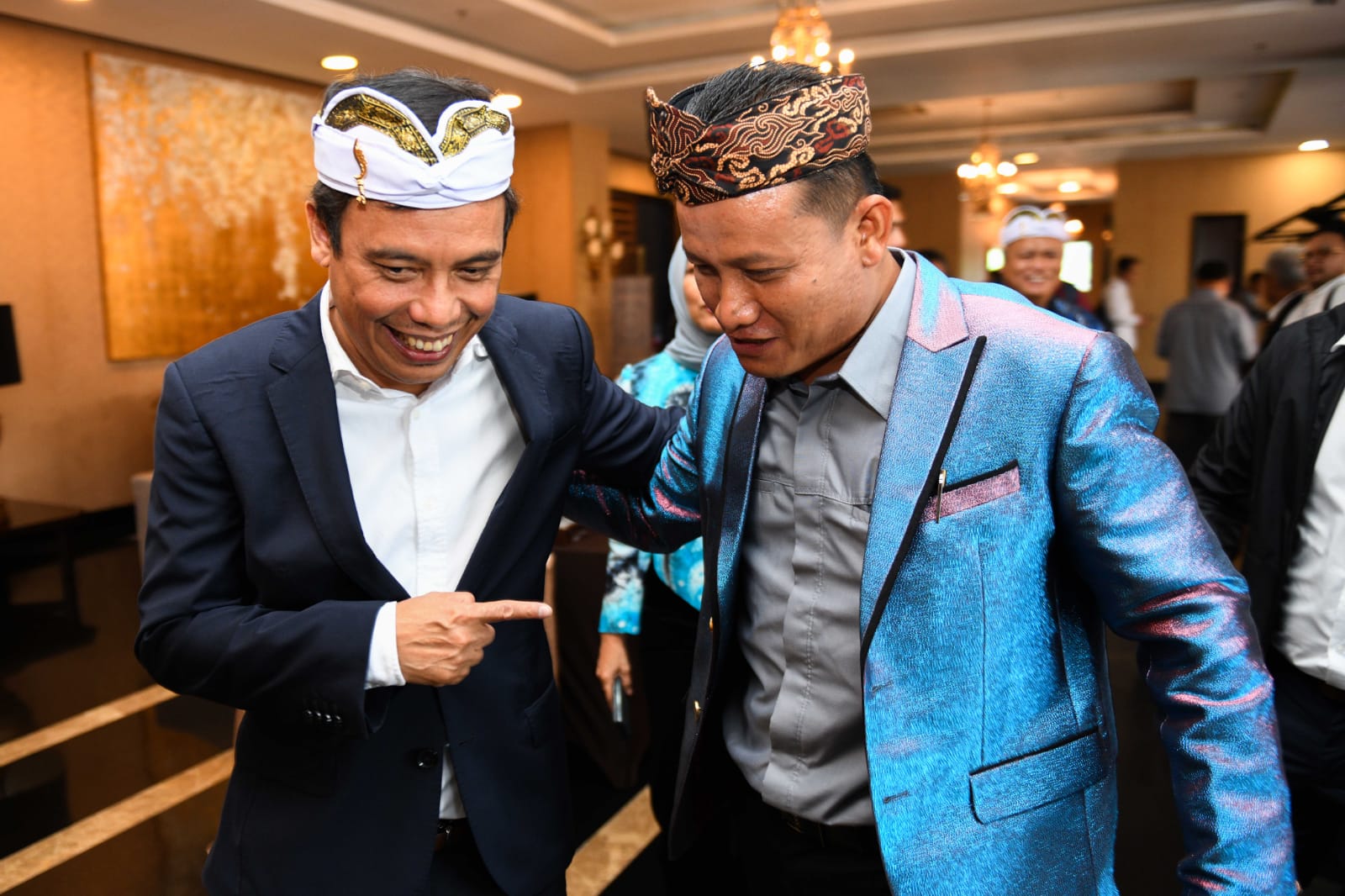Direktur Utama Bank BTN Nixon LP Napitupulu berbincang dengan Ketua Panitia Pelaksana Munas Aliansi Pengembang Perumahan Nasional Jaya (Appernas Jaya) Muhammad Efendi saat Musyawarah Nasional(Munas) Appernas Jaya di Bekasi, Jawa Barat, Senin (31/7). Dalam Munas Appernas Jaya tersebut Direktur Utama Bank BTN menyampaikan mengenai kondisi terkini sektor perumahan nasional. Bank BTN mengajak Appernas Jaya untuk terus berkolaborasi mewujudkan mimpi rakyat Indonesia khususnya Masyarakat Berpenghasilan Rendah (MBR) memiliki rumah yang layak huni.