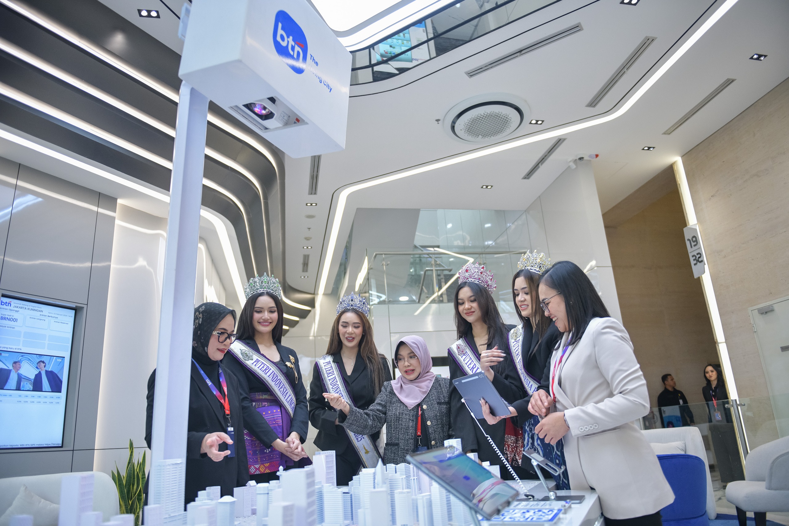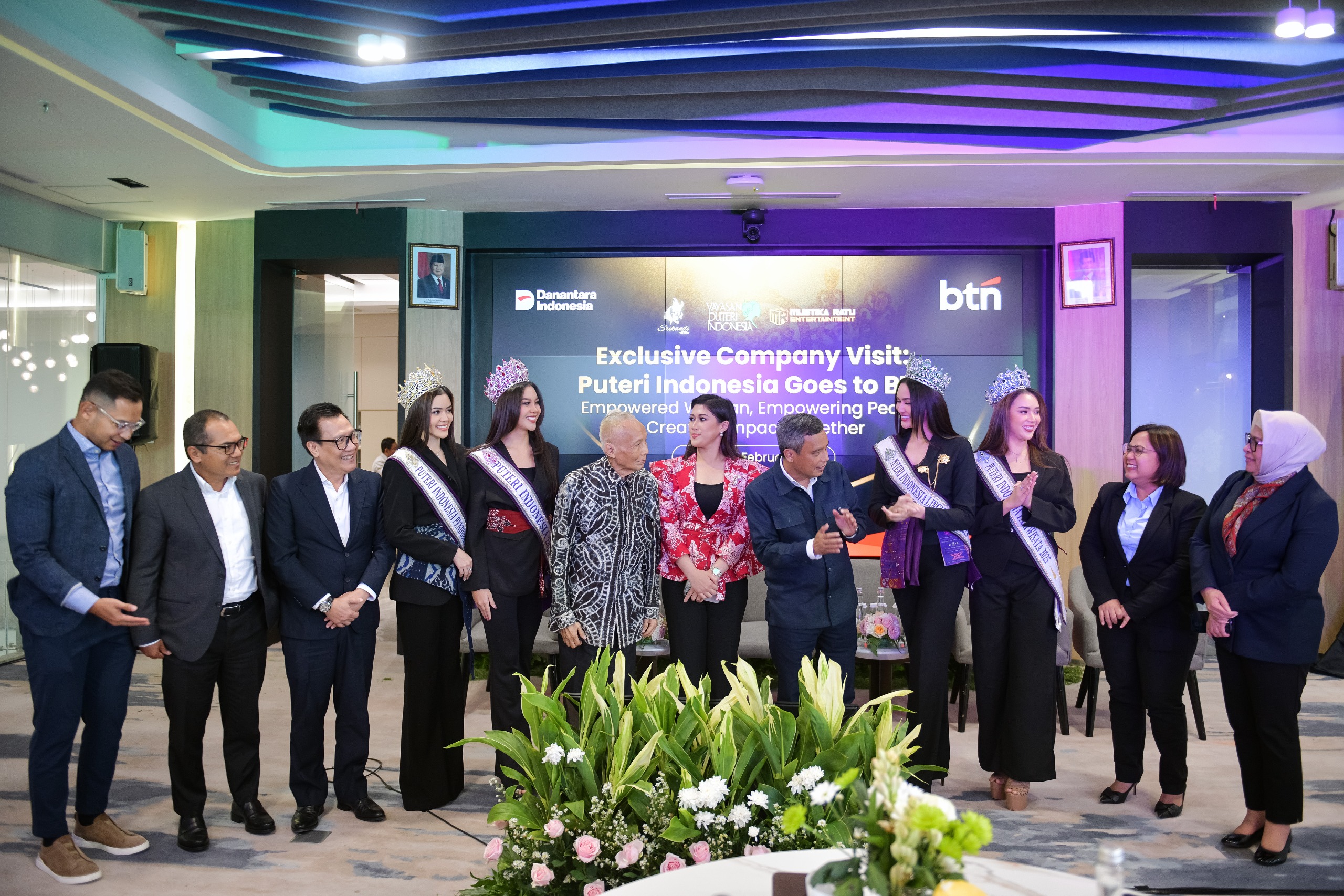 Direktur Utama PT Bank Tabungan Negara (Persero) Tbk Nixon LP Napitupulu (kelima kanan) bersama Jajaran Direksi BTN Helmy Afrisa Nugroho (kiri), Eko Waluyo (kedua kiri), Venda Yuniarti (kedua kanan), Hermita (kanan), Direktur Mustika Ratu Entertainment Mega Angkasa (ketiga kiri), Puteri Indonesia Pendidikan 2025 Rinanda Aprillya (keempat kiri), Puteri Indonesia 2025 Firsta Yufi Amarta Putri (kelima kiri), Ketua Umum Yayasan Puteri Indonesia Prof. Dr. Wardiman Djojonegoro (keenam kiri), Direktur PT Mustika Ratu Tbk Kusuma Ida Anjani (keenam kanan), Puteri Indonesia Lingkungan 2025 Meliza Xaviera (keempat kanan), dan Puteri Indonesia Pariwisata 2025 Salma Ranggita (ketiga kanan) kompak mengacungkan jempol dalam Exclusive Company Visit Puteri Indonesia Goes to BTN di Menara 2 BTN, Jakarta, Senin (2/2). BTN menjajaki sinergi melalui dialog dengan Yayasan Puteri Indonesia untuk mendukung misi sosial perseroan dalam penyediaan rumah layak huni bagi masyarakat Indonesia. Diskusi tersebut juga diharapkan dapat mendukung peningkatan penerapan sustainability di BTN yang sejalan dengan nilai-nilai yang disuarakan Puteri Indonesia.