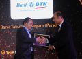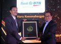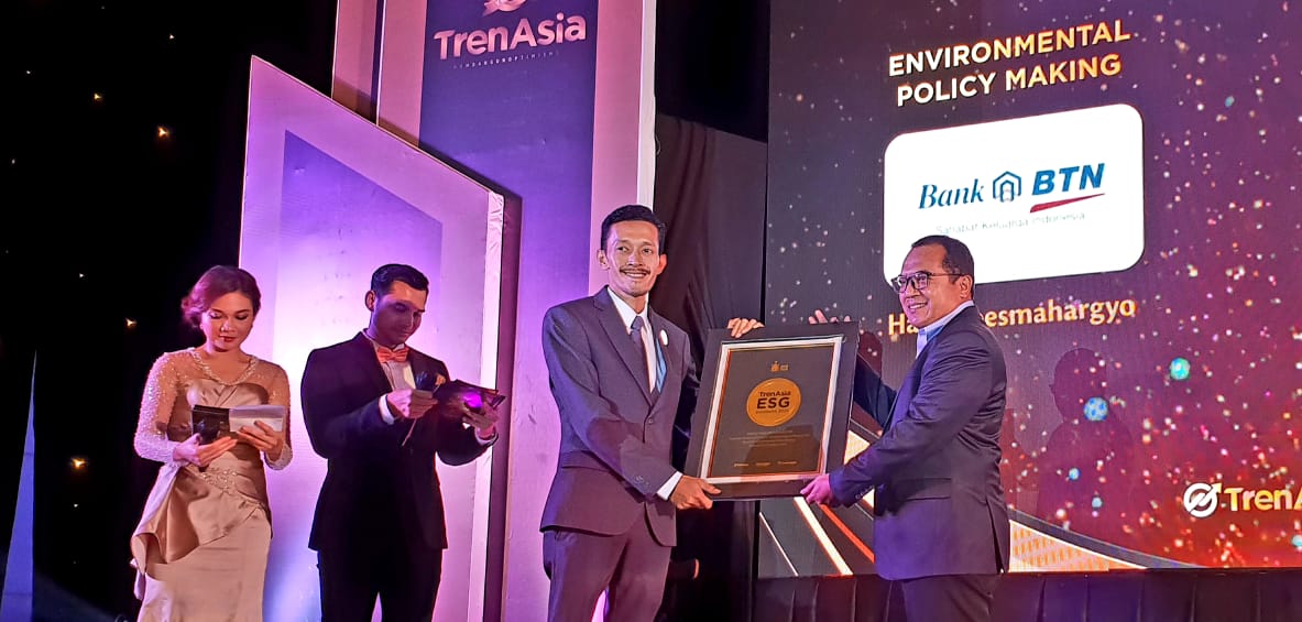 Direktur Human Capital, Compliance, and Legal PT Bank Tabungan Negara (Persero) Tbk. Eko Waluyo tersenyum menerima penghargaan di ajang ESG Excelence 2022 di Jakarta, Rabu (19/10). Bank BTN meraih dua penghargaan sekaligus dalam acara ESG Excelence 2022 untuk kategori Banking dan Best CEO. Bank BTN dinilai telah secara komprehensif dan konsisten dalam menerapkan berbagai strategi bisnis yang mengutamakan keberlangsungan lingkungan. Hingga kini, Bank BTN juga masuk dalam indeks unggulan Sri-Kehati dan meraih apresiasi dari Carbon Disclosure Project.