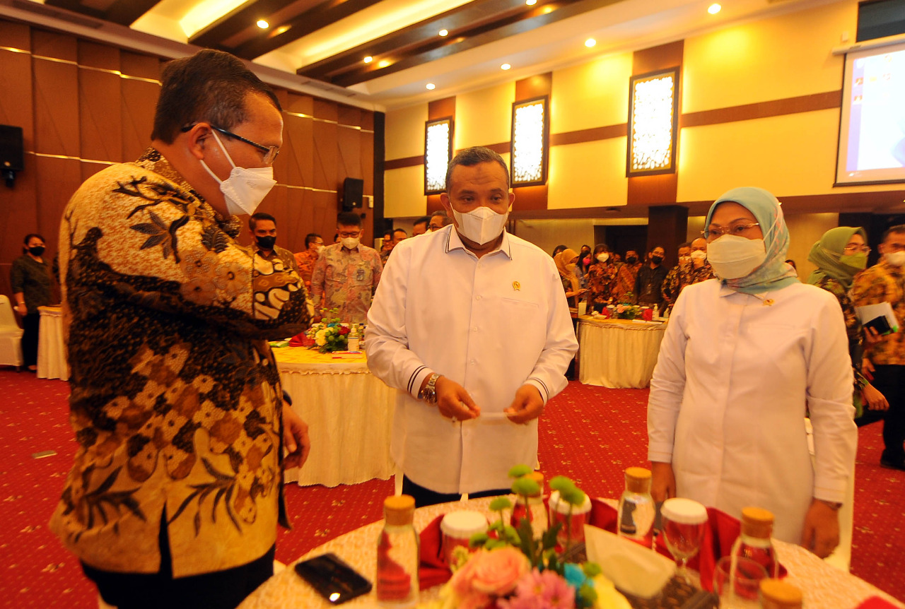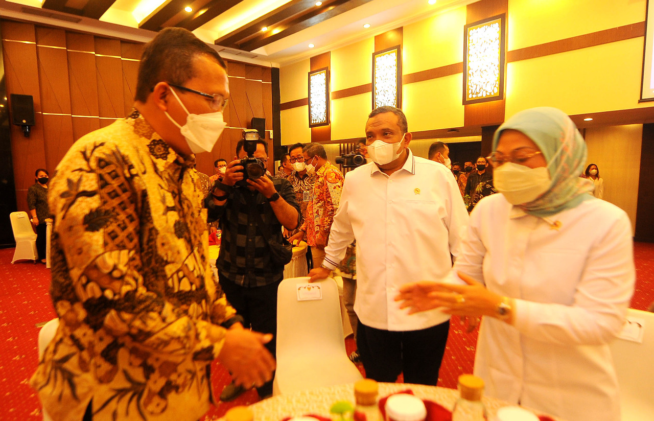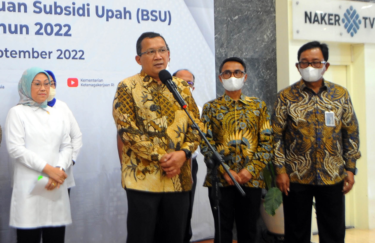 Menteri Ketenagakerjaan RI Ida Fauziah (kanan) berbincang-bincang dengan Direktur Utama PT Bank Tabungan Negara (Persero) Tbk, Haru Koesmahargyo (kiri) dan Wakil Menteri Ketenagakerjaan RI, Afriansyah Noor (tengah) di sela -sela acara Penandatanganan Perjanjian Kerjasama Penyaluran Bantuan berupa Subsidi Gaji/ UPAH bagi Pekerja/Buruh tahun Anggaran 2022 di Jakarta, Selasa (6/9). Bank BTN resmi menjadi salah satu bank penyalur Bantuan Subsidi UPAH (BSU). BTN berkomitmen mendistribusikan BSU sesuai ketentuan Pemerintah kepada pekerja yang memenuhi syarat sebagai penerima BSU.