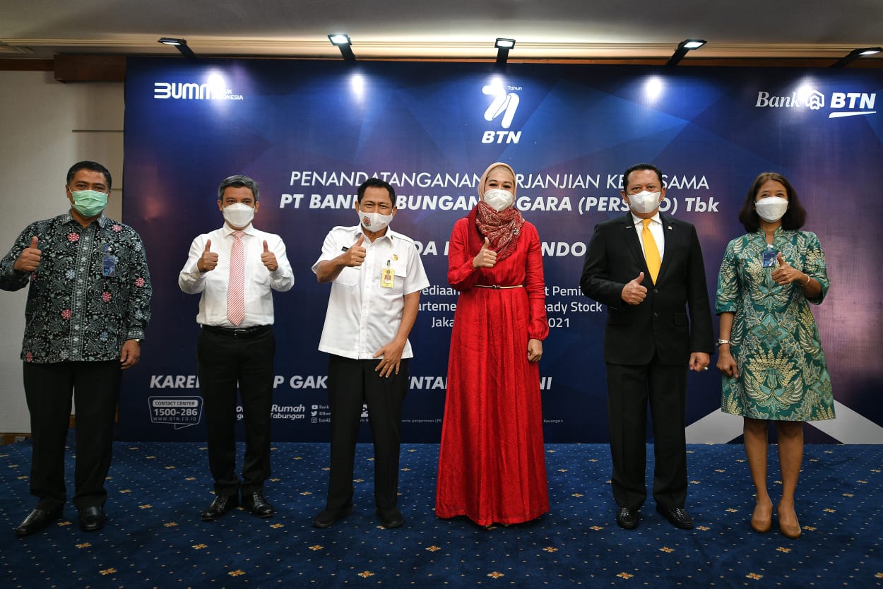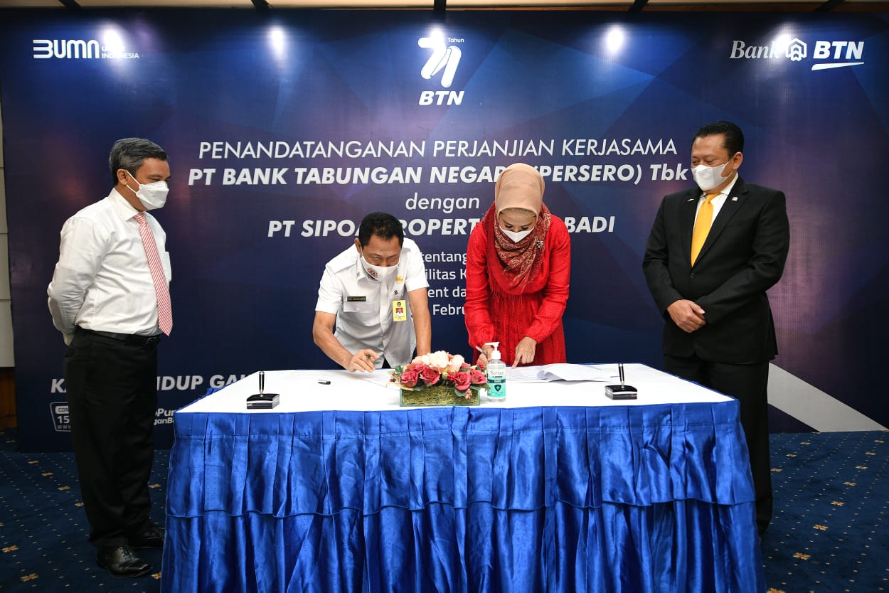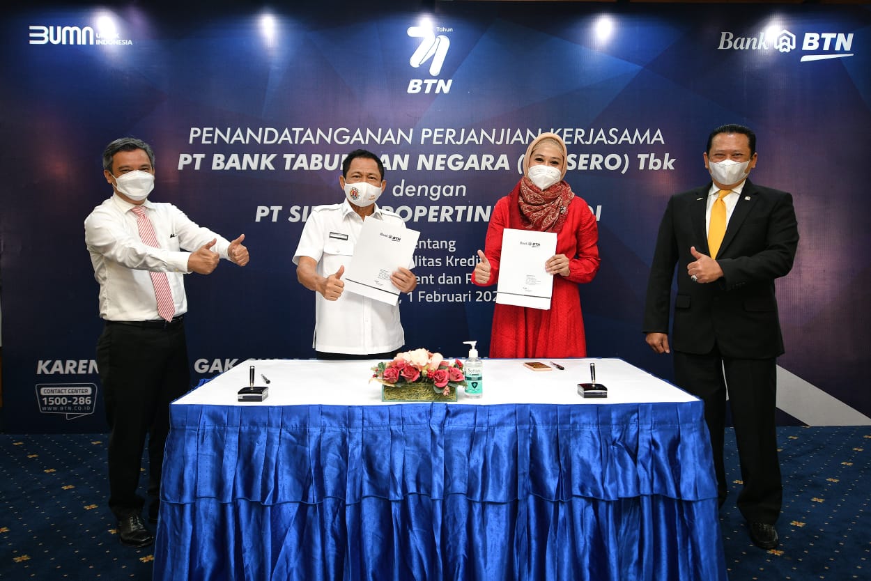 Plt Direktur Utama PT Bank Tabungan Negara (Persero) Tbk. Nixon LP Napitupulu (kiri) dan Ketua Induk Koperasi Kepolisian Republik Indonesia Irjend Pol Yudi Sushariyanto (kedua dari kiri), Direktur Utama PT Sipoa Propertindo Abadi, Dwie Aroem Hadiatie (kedua dari kanan) dan Ketua MPR RI, Bambang Soesatyo mengangkat jempol usai menyaksikan penandatanganan Perjanjian Kerjasama (PKS) Pemasaran Properti dan Penyediaan Fasilitas Kredit Pemilikan Apartemen Indent dan Ready Stock di Jakarta, Senin (1/2). Bank BTN cukup agresif menggarap segmen affluent termasuk untuk kalangan milenial punya hunian melalui Kredit Pemilikan Apartemen (KPA}. Melalui kerjasama dengan PT Sipoa Propertindo Abadi tersebut BTN menargetkan hingga akhir tahun 2021 dapat meraup target pembiayaan unit apartemen dengan fasilitas KPA sekitar 1.000 unit dengan nilai kurang lebih mencapai Rp 240 miliar.
