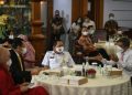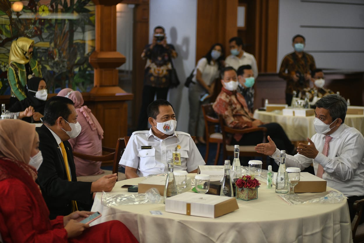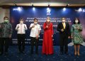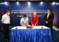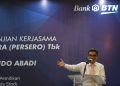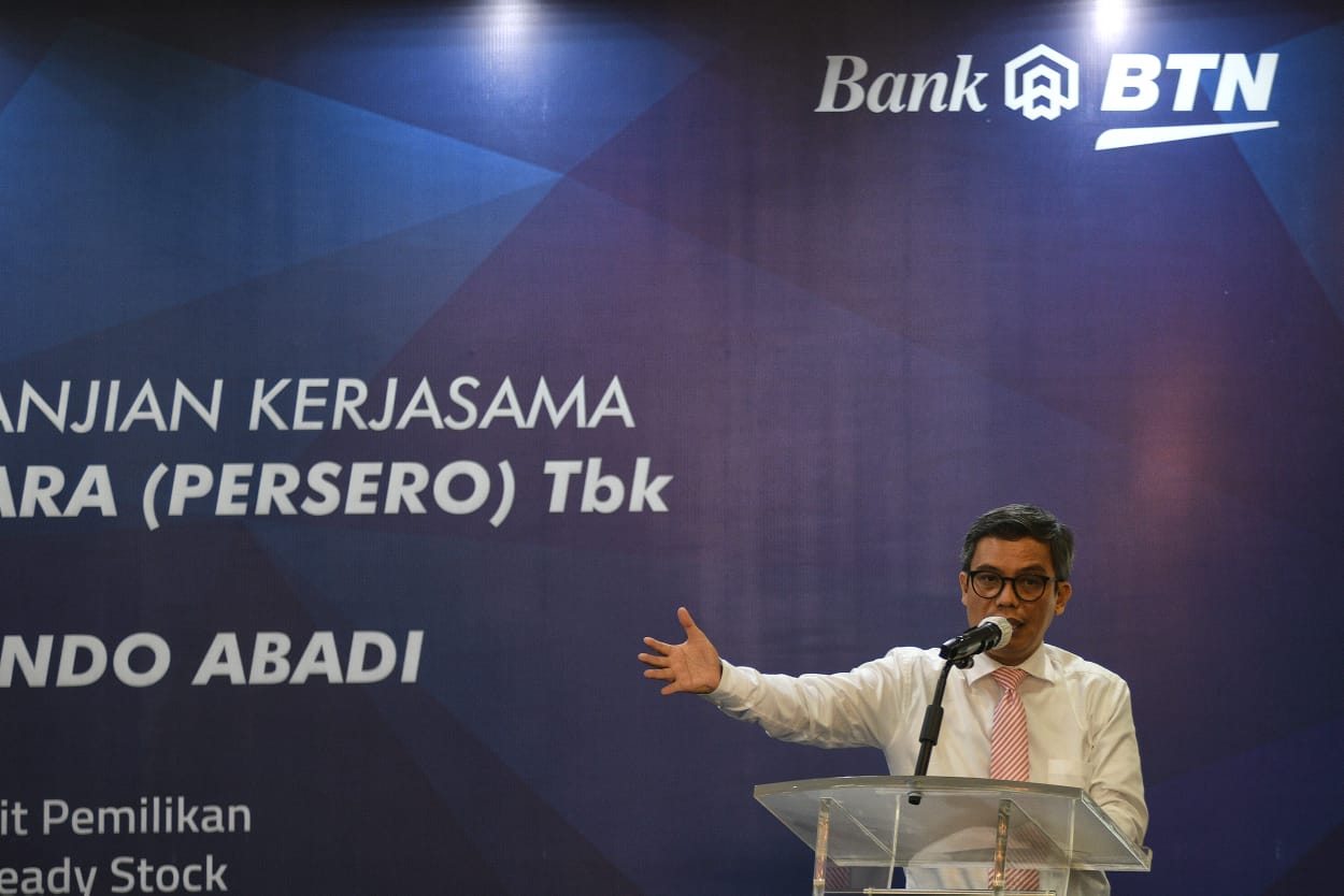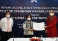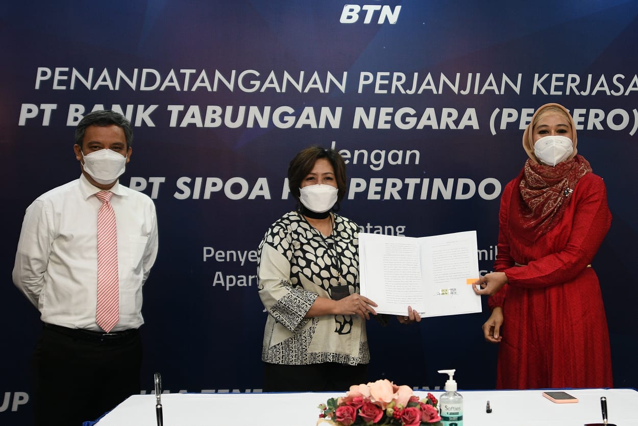 Plt Direktur Utama PT Bank Tabungan Negara (Persero) Tbk. Nixon LP Napitupulu (kiri) dan Ketua Induk Koperasi Kepolisian Republik Indonesia Irjend Pol Yudi Sushariyanto (kedua dari kiri), Direktur Utama PT Sipoa Propertindo Abadi, Dwie Aroem Hadiatie (kedua dari kanan) dan Ketua MPR RI, Bambang Soesatyo mengangkat jempol usai menyaksikan penandatanganan Perjanjian Kerjasama (PKS) Pemasaran Properti dan Penyediaan Fasilitas Kredit Pemilikan Apartemen Indent dan Ready Stock di Jakarta, Senin (1/2). Bank BTN cukup agresif menggarap segmen affluent termasuk untuk kalangan milenial punya hunian melalui Kredit Pemilikan Apartemen (KPA}. Melalui kerjasama dengan PT Sipoa Propertindo Abadi tersebut BTN menargetkan hingga akhir tahun 2021 dapat meraup target pembiayaan unit apartemen dengan fasilitas KPA sekitar 1.000 unit dengan nilai kurang lebih mencapai Rp 240 miliar.