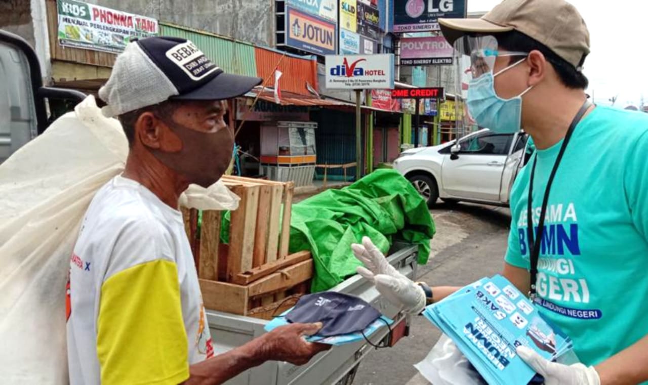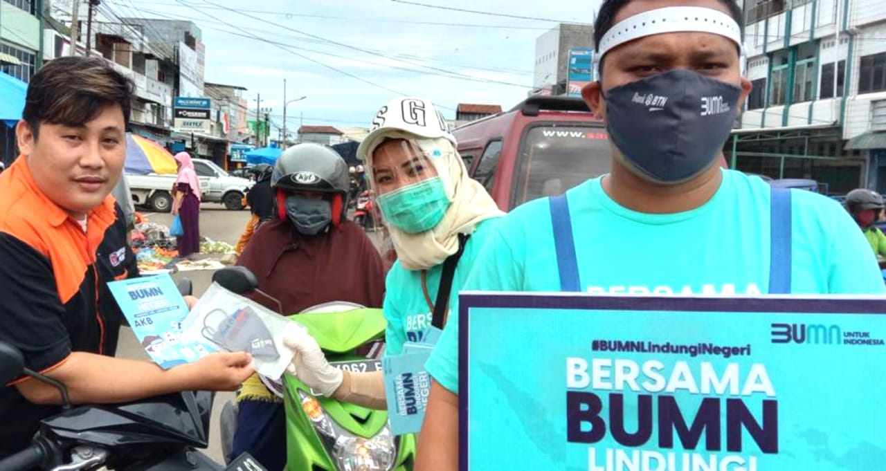 Pegawai PT Bank Tabungan Negara (Persero) Tbk. bersama Satgas Provinsi Bengkulu membagikan 5.000 masker kain di Kota Bengkulu, Jumat (9/10). Bank BTN membagikan masker di 10 lokasi di Provinsi Bengkulu di antaranya di Bengkulu Selatan, Kaur, Kepahiang, hingga Seluman. Kegiatan tersebut digelar dalam rangka pelaksanaan Sosialisai Adaptasi Kebiasaan Baru untuk meningkatkan kesadaran masyarakat atas pentingnya melakukan pencegahan penyebaran Covid-19. Kegiatan sosialisasi tersebut digelar serentak bersama Kementerian BUMN melalui kampanye BERSAMA BUMN, LINDUNGI NEGERI di 34 Provinsi di Indonesia.