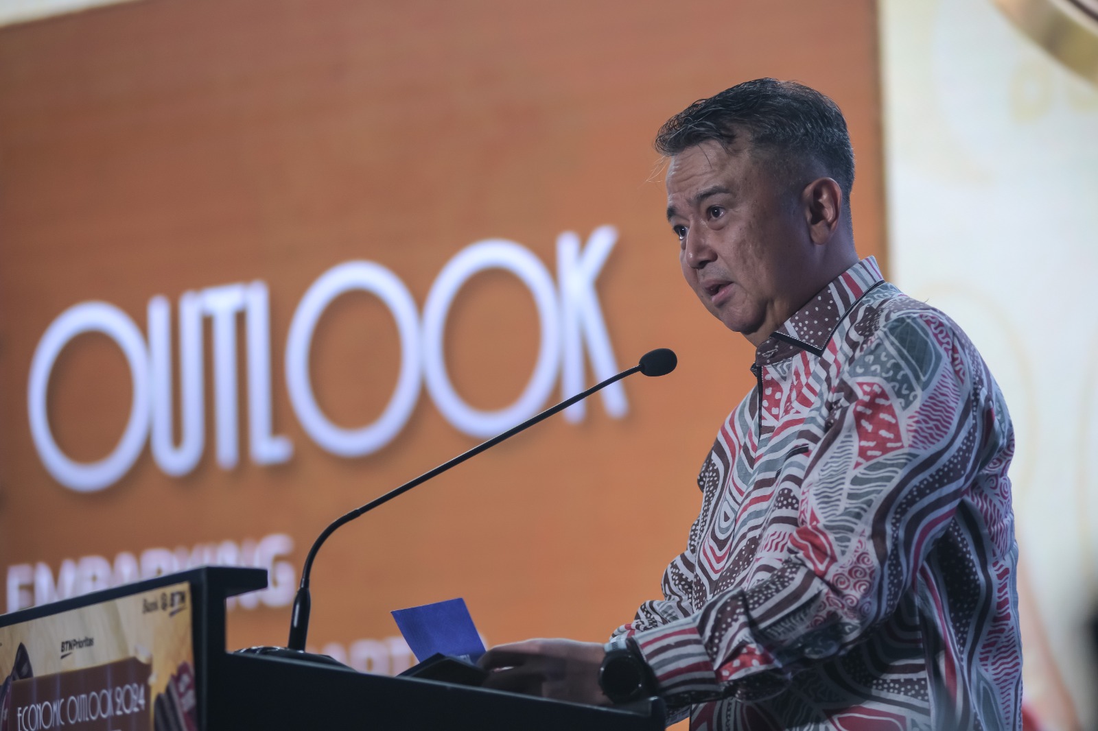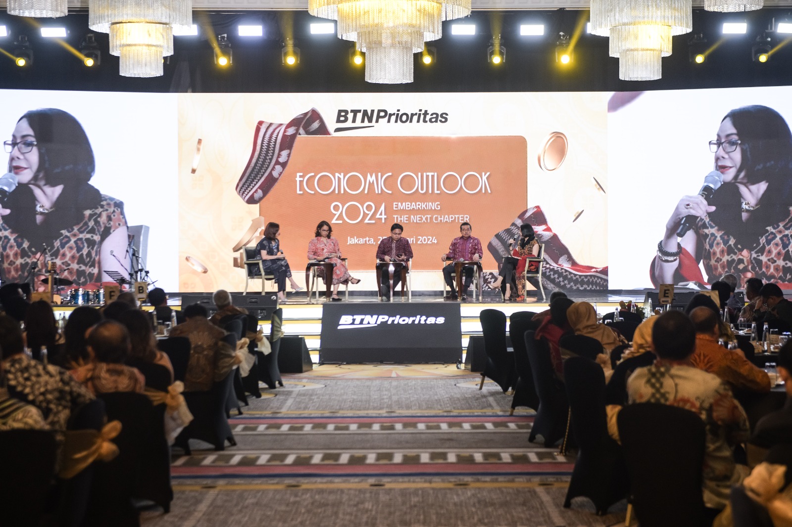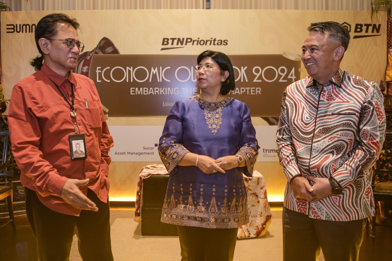 Wakil Direktur Utama PT Bank Tabungan Negara (Persero) Tbk (BTN) Oni Febriarto Rahardjo dan Komisaris Utama BTN Chandra M Hamzah berbincang dengan Deputi Gubernur Senior Bank Indonesia (BI) Destry Damayanti usai acara BTN Economic Outlook 2024 di Jakarta, Kamis (25/1/2024). BTN menggelar acara Economic Outlook 2024 dengan mengundang Nasabah Prioritas yang membahas seputar isu dan perkembangan seputar bisnis, ekonomi, dan politik. BTN optimistis sektor properti masih cerah dan menjadi sektor yang dapat memberikan kontribusi banyak terhadap pertumbuhan perekonomian di Indonesia sepanjang tahun 2024 ini.