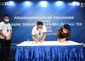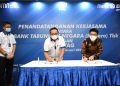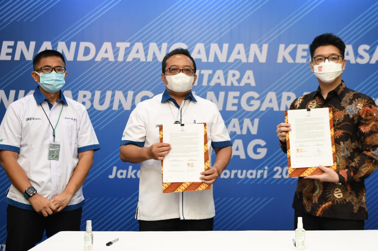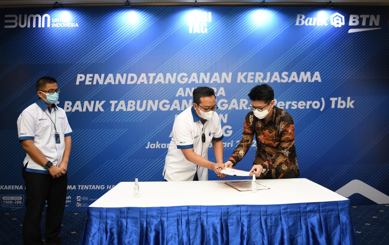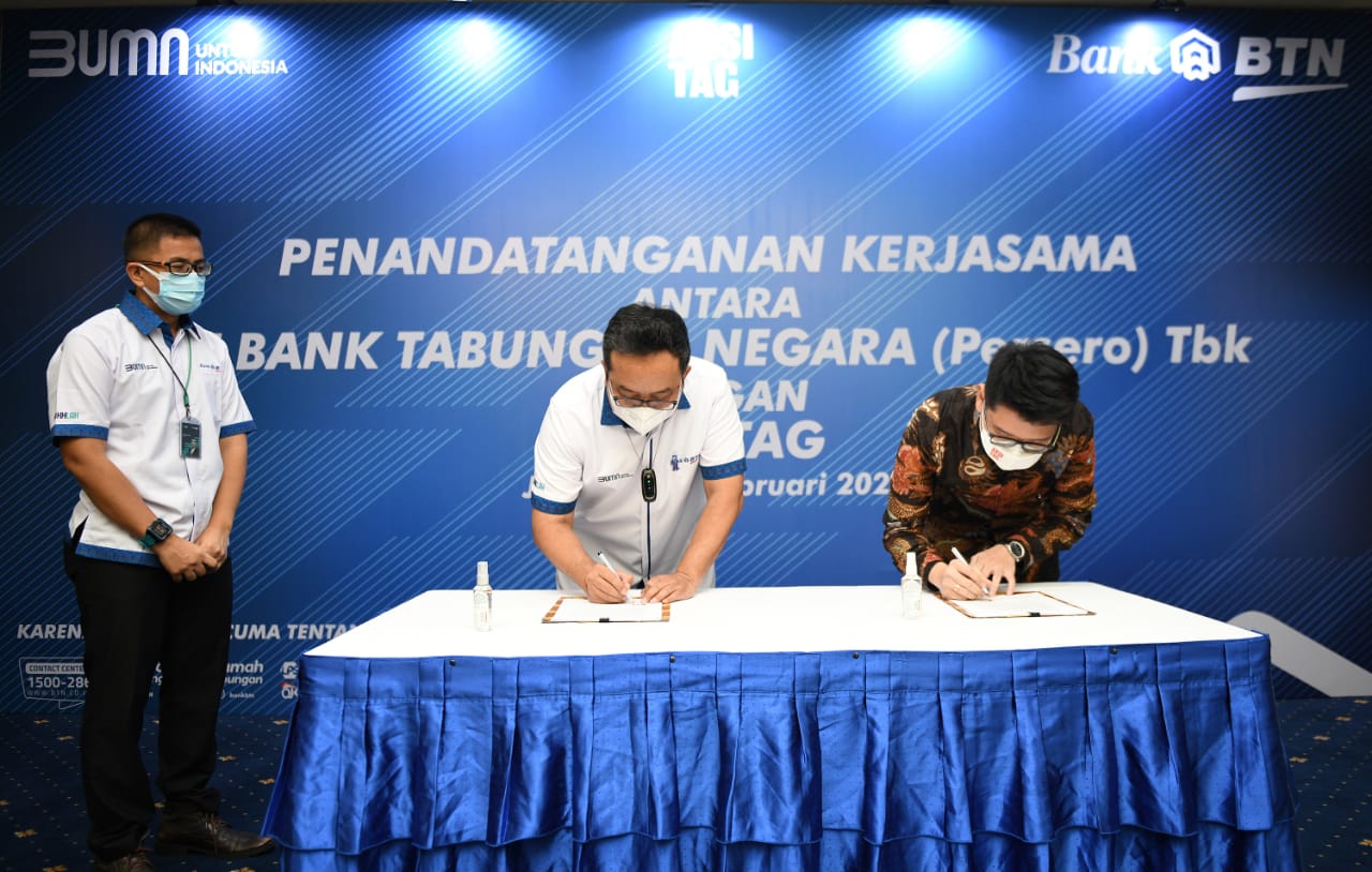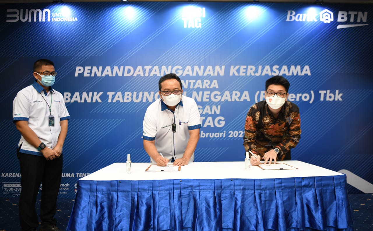 Direktur Operation, IT and Digital Banking PT Bank Tabungan Negara (Persero) Tbk. Andi Nirwoto (tengah) , Kepala Divisi Digital Channel BTN, Tan Jacky Chen (kiri), Direktur Utama Arsitag, Steven Gomedi (kanan) menandatangani Perjanjian Kerjasama tentang Integrasi Layanan Sistem Informasi dengan Platform Arsitag pada Ekosistem Digital Bank BTN di Jakarta, Rabu (16/2). Wujud nyata kemitraan dari BTN dan Arsitag ini adalah tersedianya layanan baru dari BTN Properti / Digital mortgage ecosystem Bank BTN yaitu kemudahan bagi para pengguna aplikasi untuk mencari layanan renovasi dan desain properti yang dikelola Arsitag melalui platform digital Bank BTN. Bank BTN akan terus berinovasi dan juga secara bersamaan terus meningkatkan jaringan partnershipnya dengan merangkul platform properti lainnya untuk dapat maju bersama meningkatkan layanan di bidang properti.
