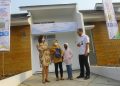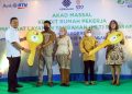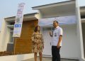 Direktur Assets Management Bank BTN Elisabeth Novie Riswanti (kanan) dan Direktur Keuangan BPJAMSOSTEK, Asep Rahmat Suwandha (kiri) secara simbolis menyerahkan kunci kepada debitur saat Akad Massal Kredit Rumah Pekerja di Perumahan Rajeg Terrace Green Residence, Tangerang Banten, Selasa (28/6). Bank BTN menyelenggarakan Akad Massal kredit Rumah pekerja MLT (Manfaat Layanan Tambahan) dalam program JHT( Jaminan Hari Tua) yang berkolaborasi bersama Kementerian Ketenagakerjaan dan BPJAMSOSTEK dengan jumlah peserta lebih dari 100 orang pekerja. Fasilitas Pembiayaan Perumahan hasil kolaborasi Bank BTN dan BPJAMSOSTEK yang ditawarkan ke pekerja antara lain Pinjaman Uang Muka Perumahan (PUMP), Pinjaman Renovasi Perumahan (PRP), dan Kredit Pemilikan Rumah (KPR) BPJAMSOSTEK dari Bank BTN.