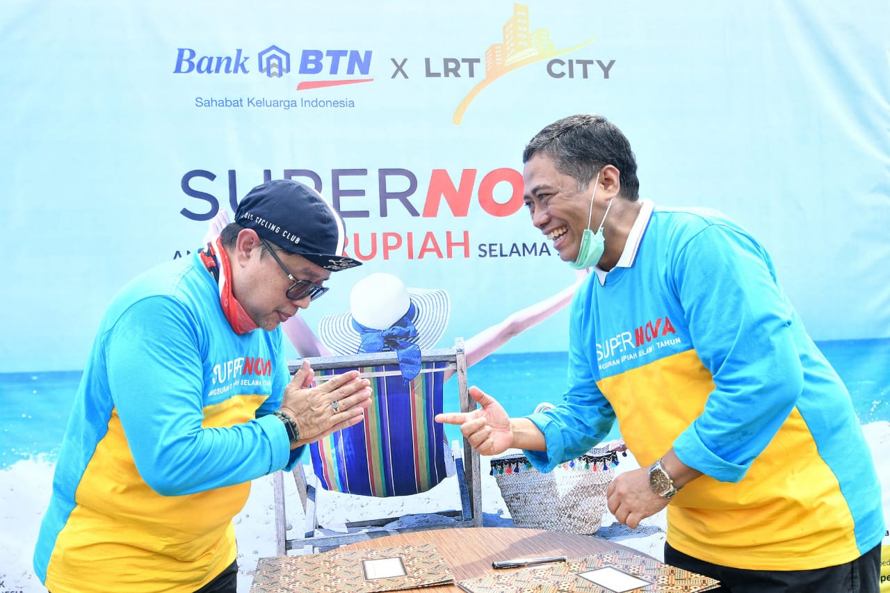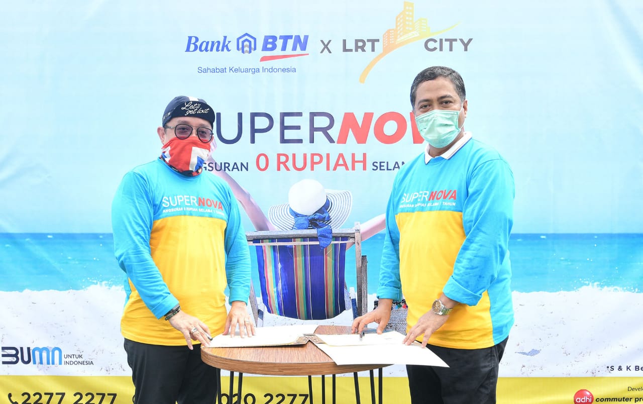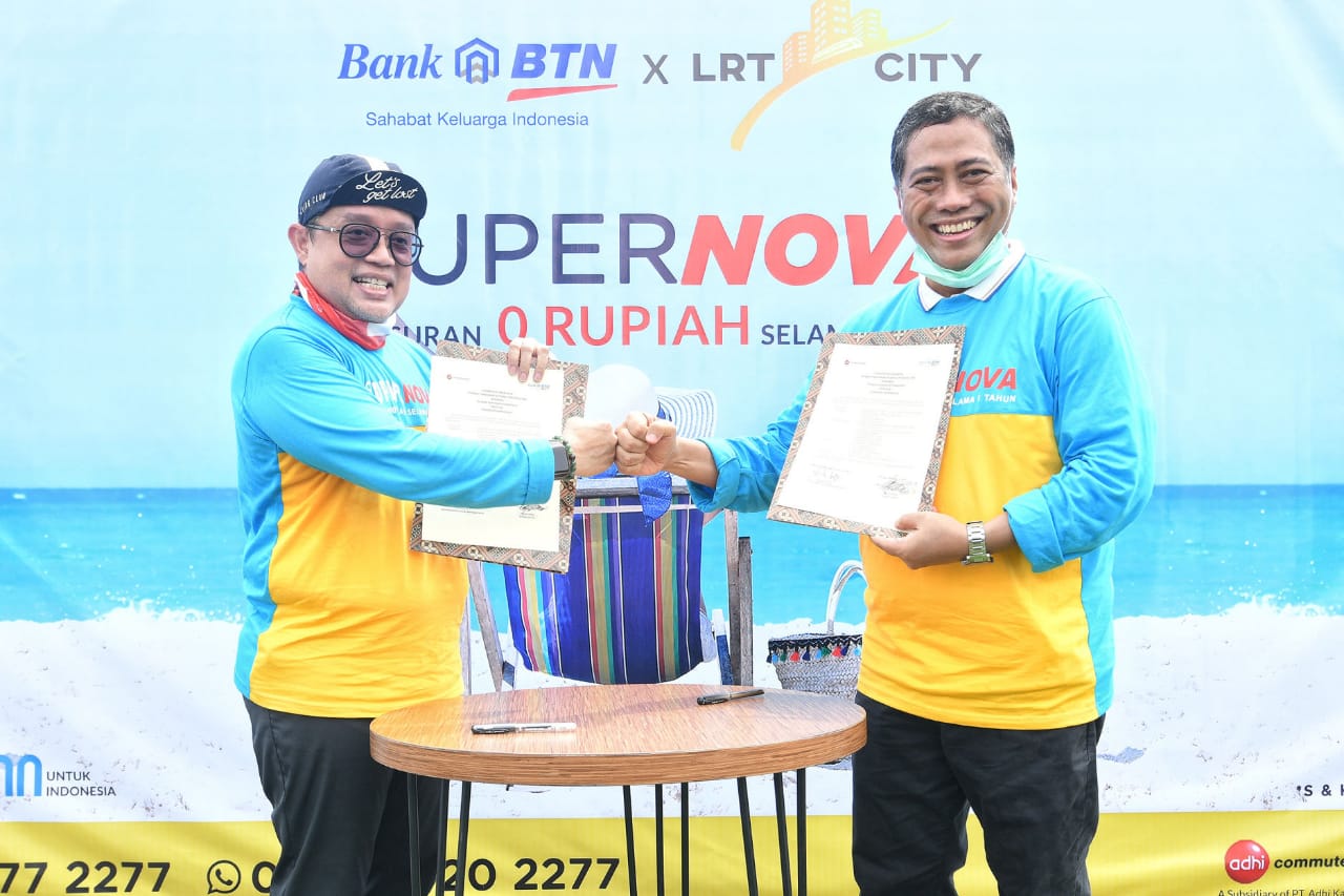 Direktur Consumer and Commercial Lending PT Bank Tabungan Negara (Persero) Tbk. Hirwandi Gafar (kanan) bersama Direktur Utama PT Adhi Commuter Properti Rizkan Firman tersenyum usai menandatangani Komitmen Kerja Sama tentang Program Supernova di Jakarta, Sabtu (7/11). Melalui kerja sama tersebut, masyarakat dapat memiliki hunian di 8 proyek apartment milik Adhi Commuter Properti dengan bunga hanya sebesar 6,99,% fixed 1 tahun, uang muka mulai dari 1%, dan cicilan tahun pertama 0 Rupiah. Bank BTN juga memberikan berbagai promo menarik seperti bebas biaya provisi, administrasi, appraisal, pengendapan dana, hingga bebas angsuran pokok selama dua tahun.