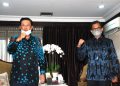 Direktur Utama PT Bank Tabungan Negara (Persero)Tbk. Pahala Nugraha Mansury (kanan) bertemu dengan Ketua Induk Koperasi Karyawan (Inkopkar) sekaligus Wakil Ketua MPR, Fadel Muhammad (kiri) untuk mendiskusikan peluang kerjasama pemberian fasilitas pembiayaan perumahan bagi anggota koperasi karyawan di Gedung MPR, Jakarta, Selasa (27/10). Bank BTN aktif menjajaki kerjasama dengan institusi maupun lembaga termasuk koperasi untuk memperluas akses KPR subsidi maupun non subsidi untuk mempercepat pencapaian program perumahan nasional dalam Sejuta Rumah. Adapun produk andalan yang ditawarkan BTN adalah BTN Solusi yaitu produk bundling produk payroll dengan fasilitas KPR.