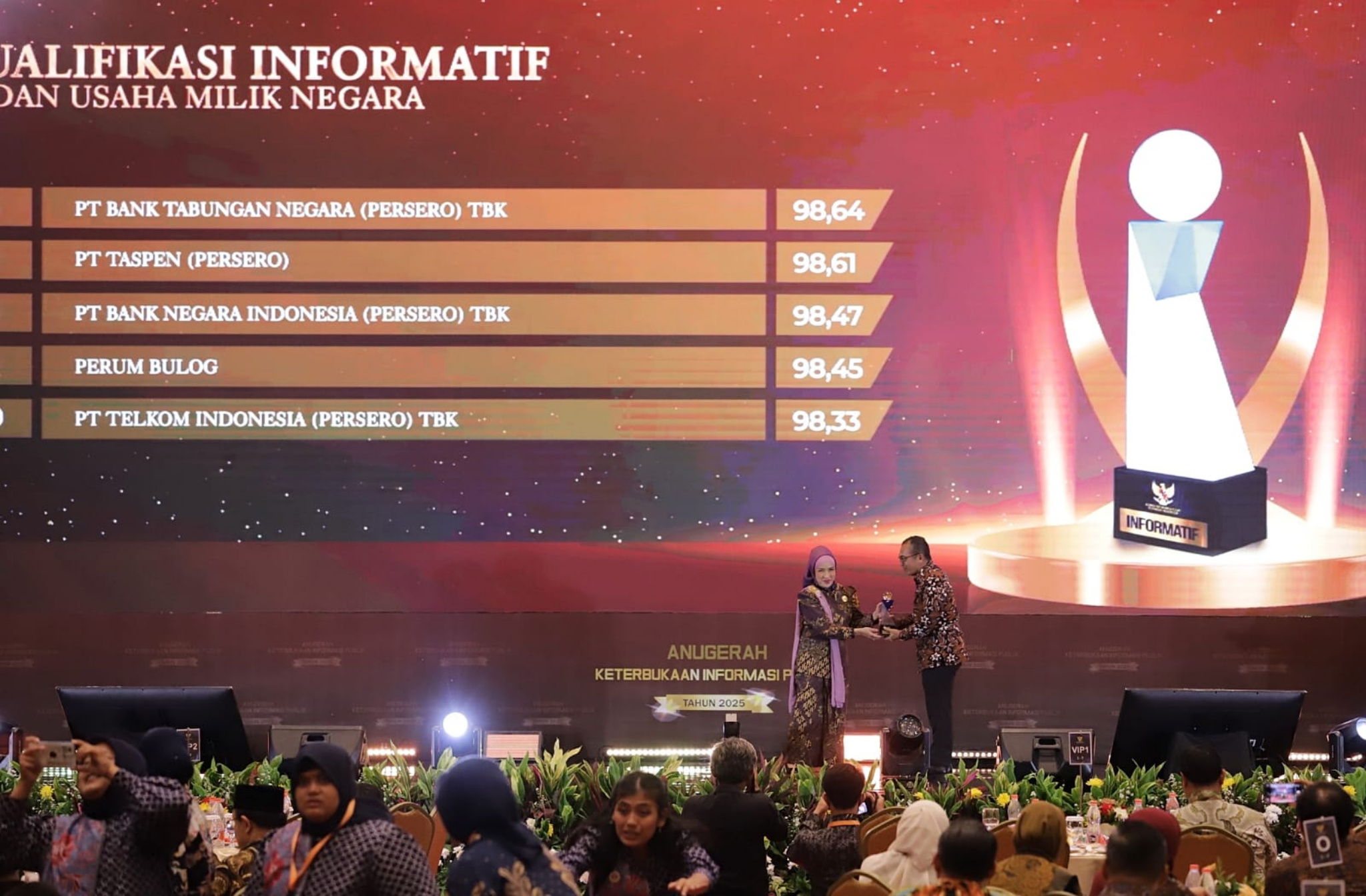 Direktur Human Capital & Compliance BTN Eko Waluyo menerima penghargaan dari Komisioner Bidang Sosialisasi, Edukasi, dan Komunikasi (SEK) Komisi Informasi Pusat (KIP) RI Samrotunnajah Ismail dalam ajang Anugerah Keterbukaan Informasi Publik 2025 di Birawa Assembly Hall, Hotel Bidakara, Senin (15/12). BTN meraih posisi tertinggi pada kategori Badan Usaha Milik Negara (BUMN) Informatif, mengalahkan bank Himbara lainnya. Pencapaian ini menegaskan posisi BTN sebagai bank Himbara terdepan dalam penerapan transparansi, akuntabilitas, dan keterbukaan informasi. Sekaligus mencerminkan kepercayaan publik yang terus terjaga dalam mendukung keuangan berkelanjutan.