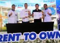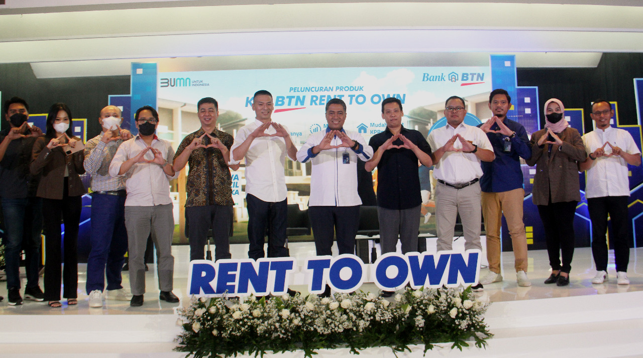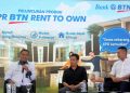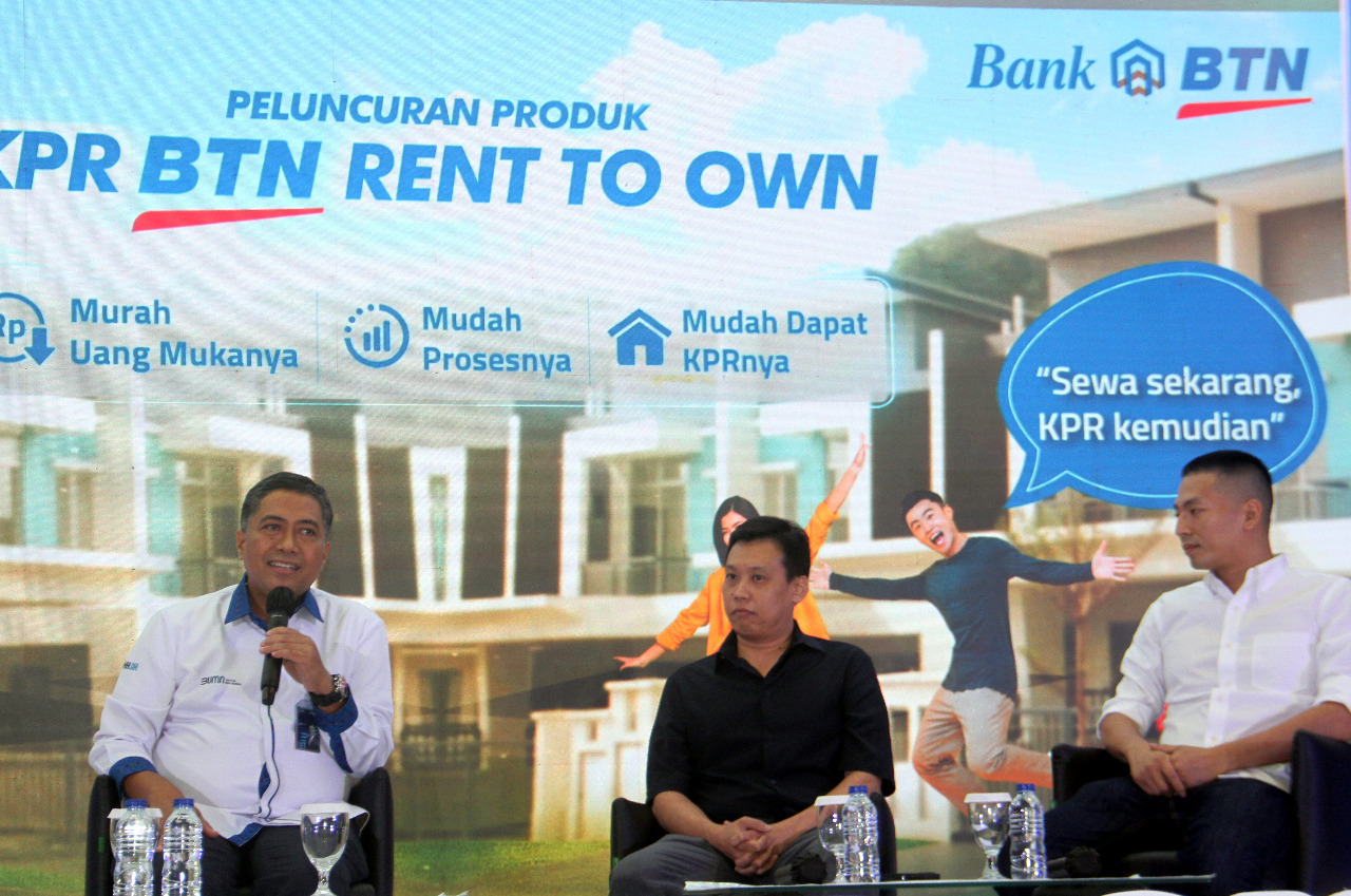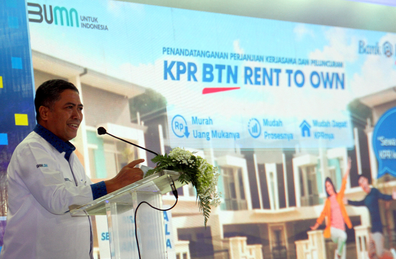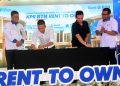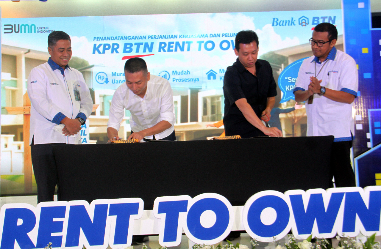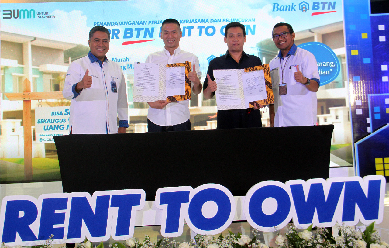 Direktur Consumer PT Bank Tabungan Negara (Persero) Tbk, Hirwandi Gafar (kiri) menyaksikan penandatanganan Perjanjian Kerjasama (PKS) perihal Penyediaan Fasilitas KPR Rent To Own oleh Direktur Utama CicilSewa, Andrew Buntoro (kedua dari kanan), dan Direktur Utama TapHomes, Victor Kwan (kedua dari kiri) serta Wakil Kepala Non Subsidized Mortage & Consumer Lending Division, Dedy Lesmana (kanan) usai meluncurkan KPR BTN Rent To Own di Jakarta, Rabu (12/09). Program ini berangkat dari konsep pemilikan rumah yang menggunakan mekanisme sewa untuk membantu masyarakat memiliki rumah dalam jangka waktu tertentu untuk memiliki rumah dengan cara kredit di akhir masa sewa.
