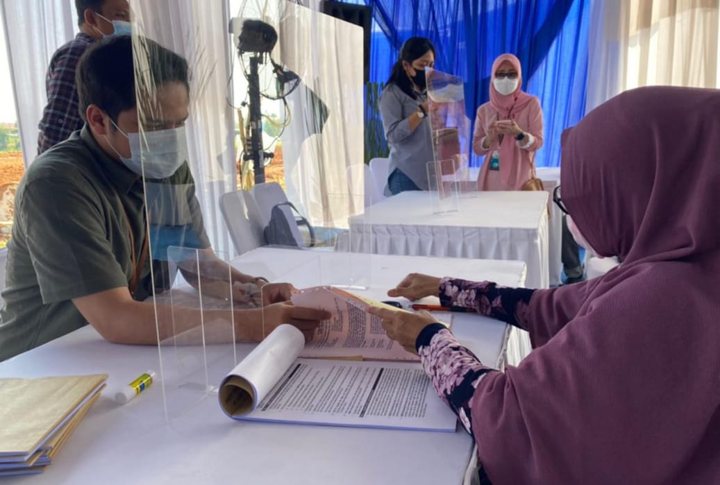 Seorang debitur Kredit Pemilikan Rumah (Subsidi) PT Bank Tabungan Negara (Persero) Tbk. sedang mengurus administrasi untuk akad di Perumahan Puri Delta Tigaraksa, Tangerang, Banten, Jumat (23/4). Sebagai wujud dukungan atas Gerakan Konversi 1 Juta Kompor LPG ke Kompor Induksi, Bank BTN menggelar Akad Perdana KPR Subsidi BTN dalam rangka Gerakan 1 Juta Kompor Induksi bersama PLN. Akad perdana ini diikuti oleh 71 debitur dari total 3.100 unit rumah yang ada di lokasi perumahan tersebut. Selain memperoleh kompor induksi secara gratis, nantinya para debitur akad ini juga akan memperoleh insentif dari PLN berupa keringanan biaya penyambungan listrik.