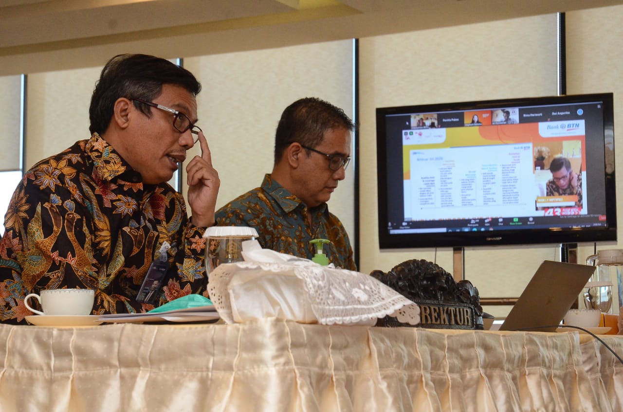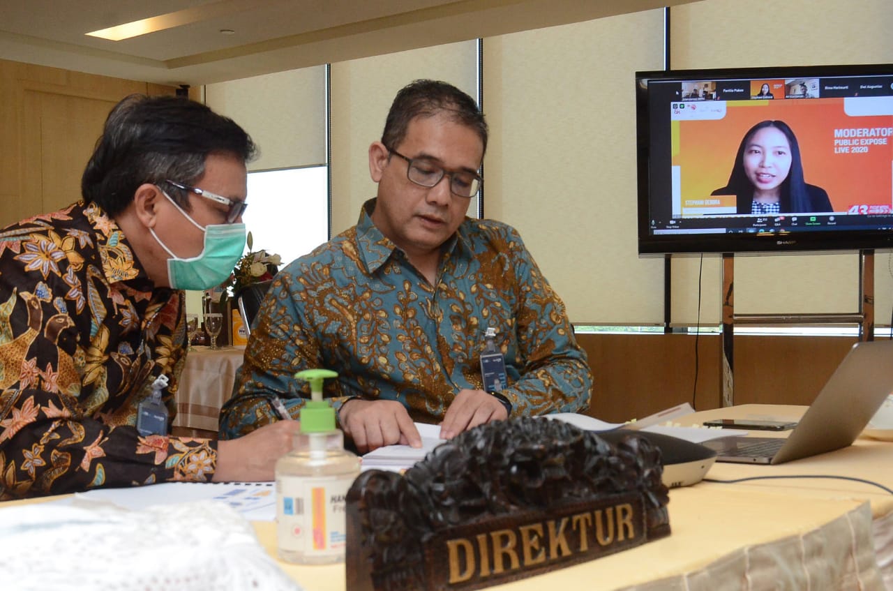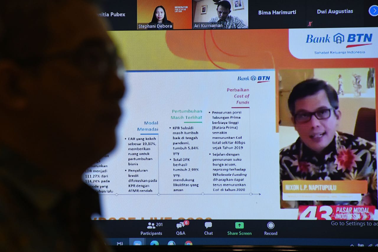 Direktur Finance, Planning, & Treasury PT Bank Tabungan Negara (Persero) Tbk. Nixon LP Napitupulu bersama Kepala Divisi Investor Relations & Research Winang Budoyo memaparkan materi dalam Public Expose Live 2020 secara virtual di Jakarta, Selasa (25/8). Bank BTN optimistis dapat mencapai target perseroan pada akhir tahun 2020 ditopang strategi percepatan bisnis proses, peningkatan kredit, serta likuiditas pasar yang membaik. Di tengah pandemi Covid-19, angka penyaluran kredit perseroan mulai menunjukkan peningkatan. Berdasarkan catatan kinerja semester I/2020, di segmen Kredit Pemilikan Rumah (KPR) Subsidi misalnya, masih mencatatkan kenaikan sekitar 5,84% secara tahunan (year-on-year/yoy) dari sekitar Rp107,34 triliun dari Juni 2019 menjadi sekitar Rp113,61 triliun.