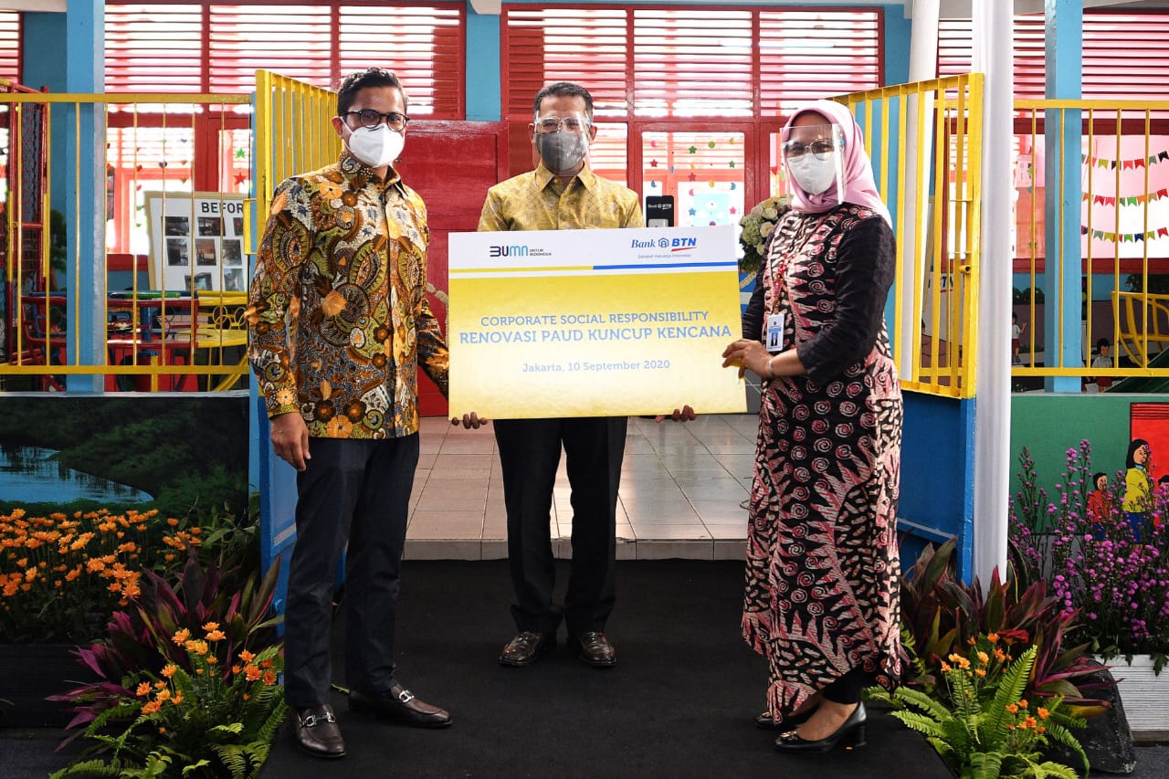 Direktur Utama PT Bank Tabungan Negara (Persero) Tbk. Pahala Nugraha Mansury (kiri) bersama Direktur Jenderal Perbendaharaan Kementerian Keuangan Andin Hadiyanto dan Sekretaris Direktorat Jenderal Perbendaharaan Kementerian Keuangan RM Wiwieng Handayaningsih (kanan) berfoto bersama pada acara serah terima bantuan program Corporate Social Responsibility Bank BTN untuk PAUD Kuncup Kencana di Jakarta, Kamis (10/9). Bank BTN memberikan bantuan CSR dalam bentuk renovasi gedung belajar PAUD Kuncup Kencana yang berlokasi di Pondok Bambu sebagai bentuk dukungan perusahaan terhadap bidang pendidikan usia dini. Bantuan CSR tersebut diaharapkan dapat memberikan manfaat sosial bagi masyarakat di sekitar PAUD terutama dalam mendukung kegiatan belajar mengajar anak usia dini yang dinilai sangat kritikal dalam membentuk pola pikir anak sekaligus mengenalkan pentingnya menabung sejak dini.