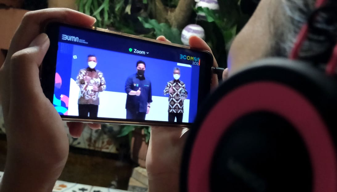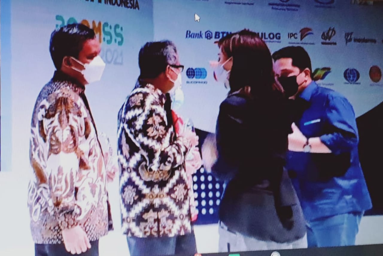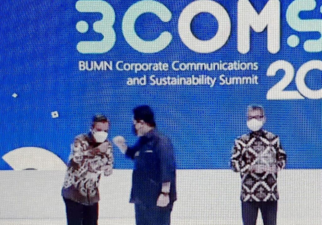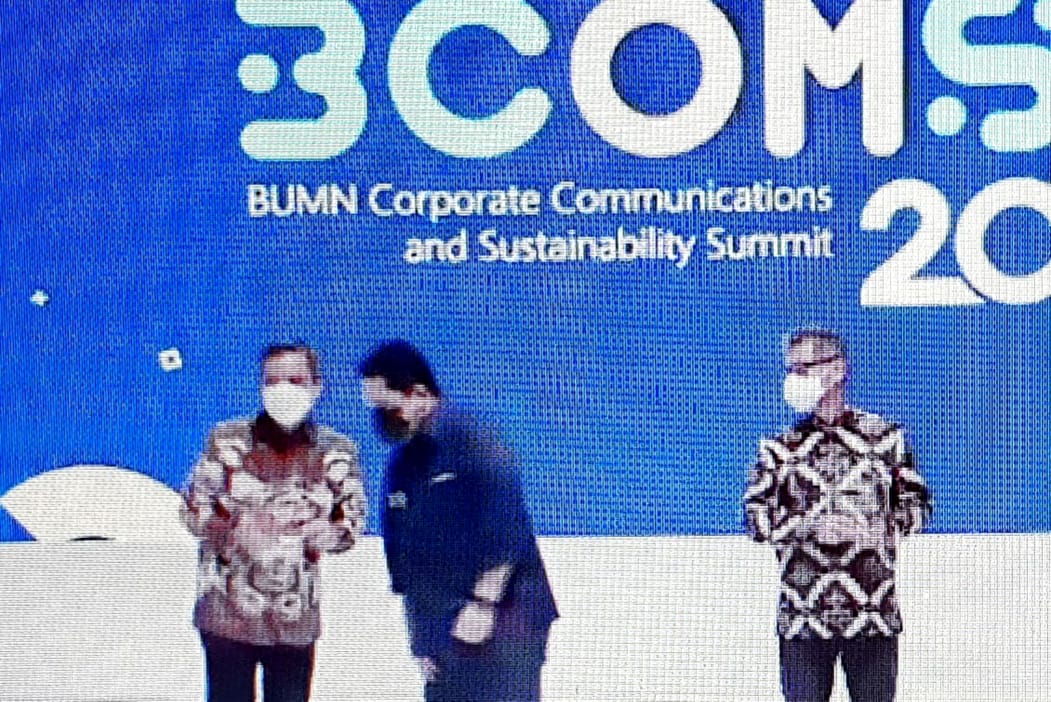 Plt Direktur Utama PT Bank Tabungan Negara (Persero) Tbk. Nixon LP Napitupulu (kiri) mengacungkan jempol usai menerima penghargaan dari Menteri Badan Usaha Milik Negara (BUMN) Erick Thohir di acara BUMN Corporate Communications and Sustainability Summit 2021 di Jakarta, Jumat malam (29/1). Bank BTN meraih penghargaan Social Media Award atas program kampanye media sosial perseroan bertajuk Hidup Ga Cuma Tentang Hari Ini #hgtchi. Penghargaan tersebut merupakan apresiasi yang diberikan kepada perseroan yang dinilai telah melakukan komunikasi tentang perusahaan yang baik sehingga masyarakat umum terkomunikasi dengan baik atas kegiatan yang dilakukan oleh perusahaan BUMN.