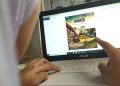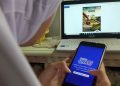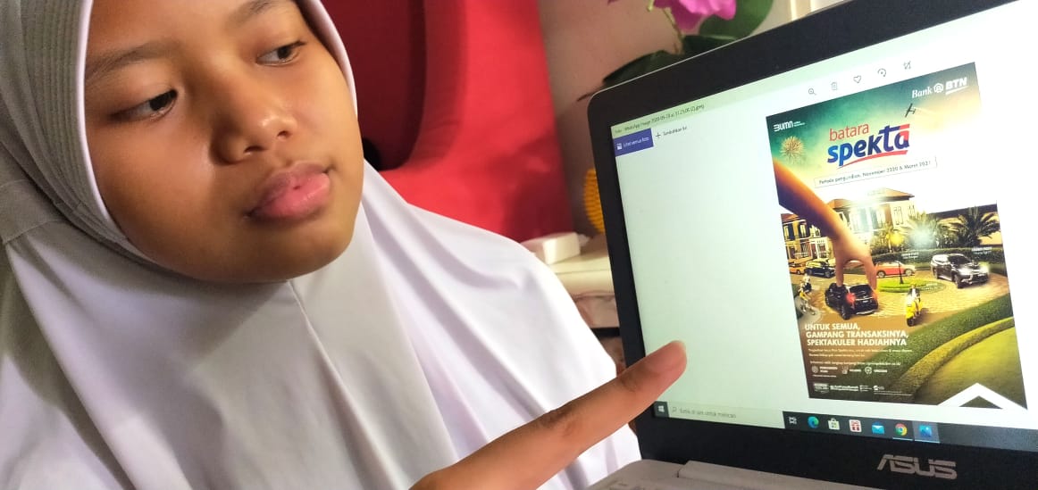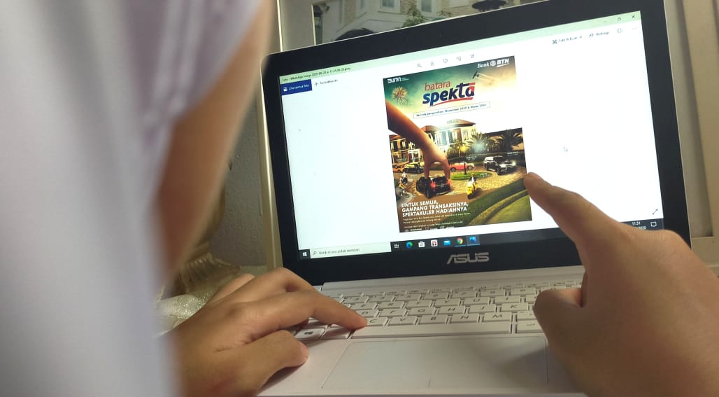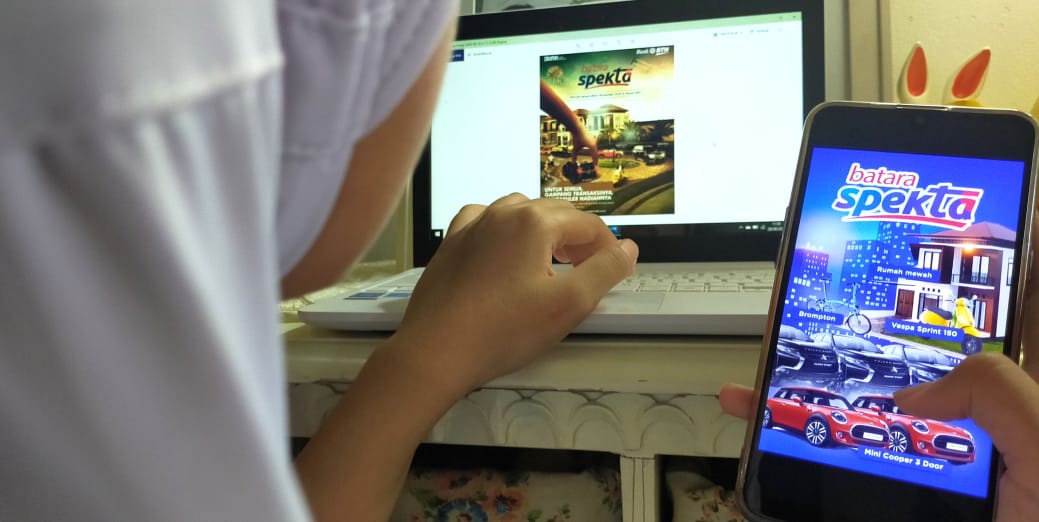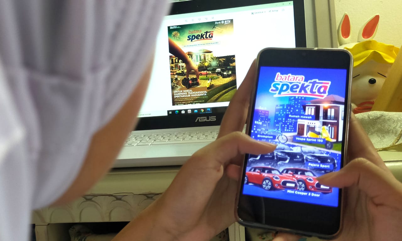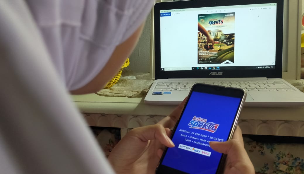 Seorang wanita sedang menonton tayangan peluncuran resmi Program Batara Spekta milik PT Bank Tabungan Negara (Persero) Tbk. melalui gawai, di Jakarta, Minggu (27/9). Program anyar yang direlease Bank BTN tersebut dirancang untuk memberikan apresiasi kepada nasabah yang aktif menabung dan bertransaksi menggunakan produk tabungan Batara. Peluncuran resmi program anyar tersebut menjadi penanda dimulainya penggunaan poin Spekta bagi nasabah tabungan Batara yang nantinya dapat ditukarkan dan diundi untuk mendapatkan aneka hadiah dari gawai terkini hingga mobil mewah dan rumah miliaran rupiah.