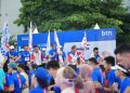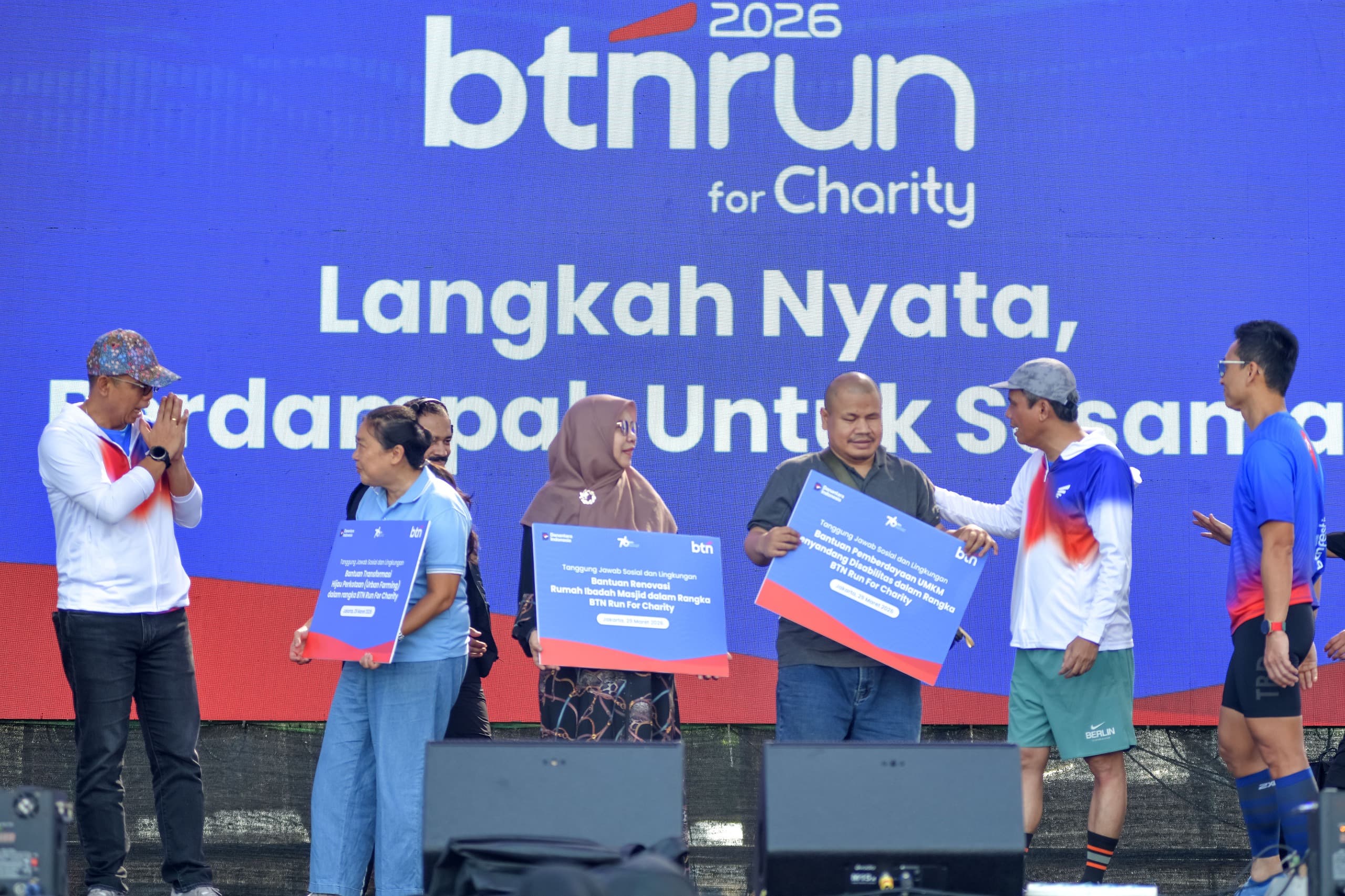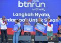 Direktur Utama PT Bank Tabungan Negara (Persero) Tbk (BTN) Nixon L.P. Napitupulu (dua dari kiri), didampingi Direktur Operations I Nyoman Sugiri Yasa (kanan), Direktur Risk Management Setiyo Wibowo (dua dari kanan), dan SEVP Digital Business Thomas Wahyudi (kiri) berfoto bersama peserta BTN Run 2026 for Charity di Beach City International Stadium (BCIS) Ancol, Minggu (29/3). Dalam BTN Run 2026 for Charity, donasi dihitung berdasarkan dua komponen utama, yaitu jumlah peserta yang mencapai garis finis dan total jarak tempuh. Setiap peserta yang finis dikonversi menjadi donasi Rp76.000. Sedangkan setiap kilometer yang ditempuh dikonversi menjadi Rp7.600. Total dari kedua komponen tersebut ditambah kontribusi TJSL BTN menghasilkan donasi sebesar Rp760.000.000. Dana tersebut akan disalurkan ke tiga pilar, yaitu keagamaan (bantuan rumah ibadah), lingkungan (pengembangan urban farming), dan sosial (dukungan bagi penyandang disabilitas yang bergerak di bidang UMKM).