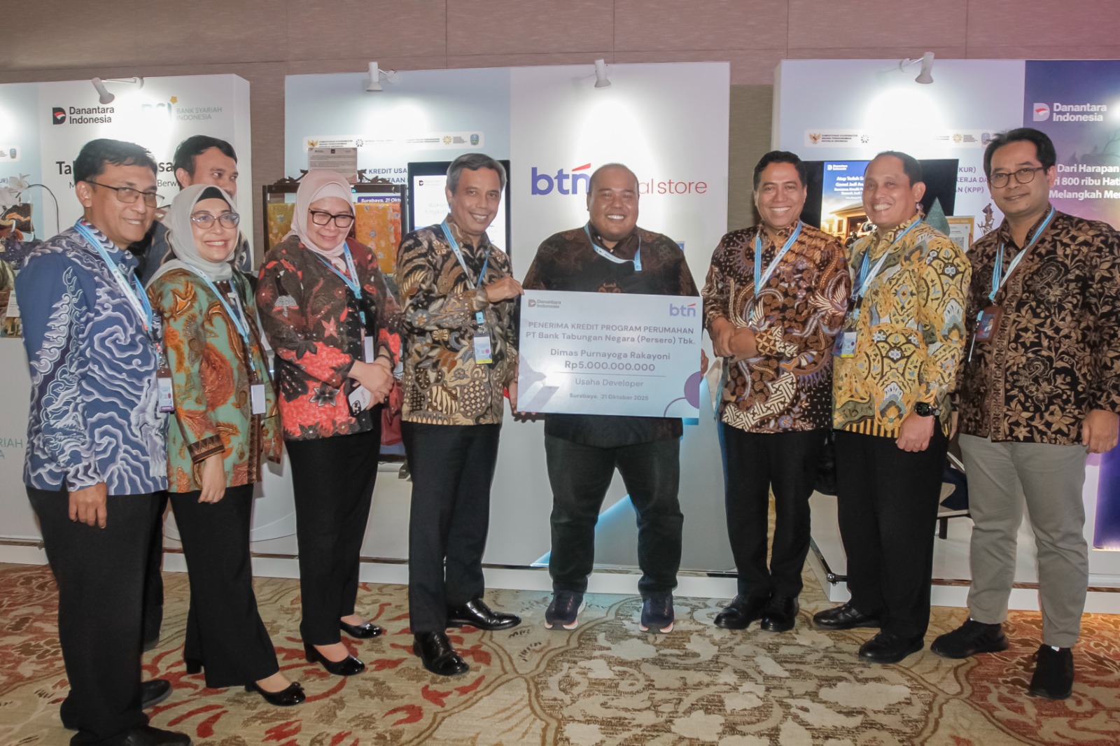 Direktur Utama BTN Nixon LP Napitupulu didampingi Direktur Consumer Banking BTN Hirwandi Gafar (kanan) dan Direktur Commercial Banking Hermita (kiri) menyerahkan penyaluran Kredit Program Perumahan (KPP) kepada Pengembang usai Akad Massal Kredit Usaha Rakyat KUR 800.000 Debitur Penciptaan Lapangan Kerja dan Peluncuran Kredit Program Perumahan di Surabaya, Selasa (21/10). BTN menargetkan menjadi penyalur terbesar KPP dengan memanfaatkan basis lebih dari 12 ribu pelaku usaha sektor perumahan, terdiri atas developer, kontraktor, dan toko bangunan. Adapun, program KPP memiliki bunga hanya 6% dengan penjaminan dan proses pengajuan yang mudah, sehingga diharapkan mampu mempercepat realisasi Program 3 Juta Rumah. BTN juga menargetkan penyaluran tahap awal sekitar Rp2 triliun hingga akhir tahun 2025 dan akan mempercepat ekspansi pada tahun depan untuk meningkatkan permodalan developer serta mempercepat pembangunan rumah rakyat.