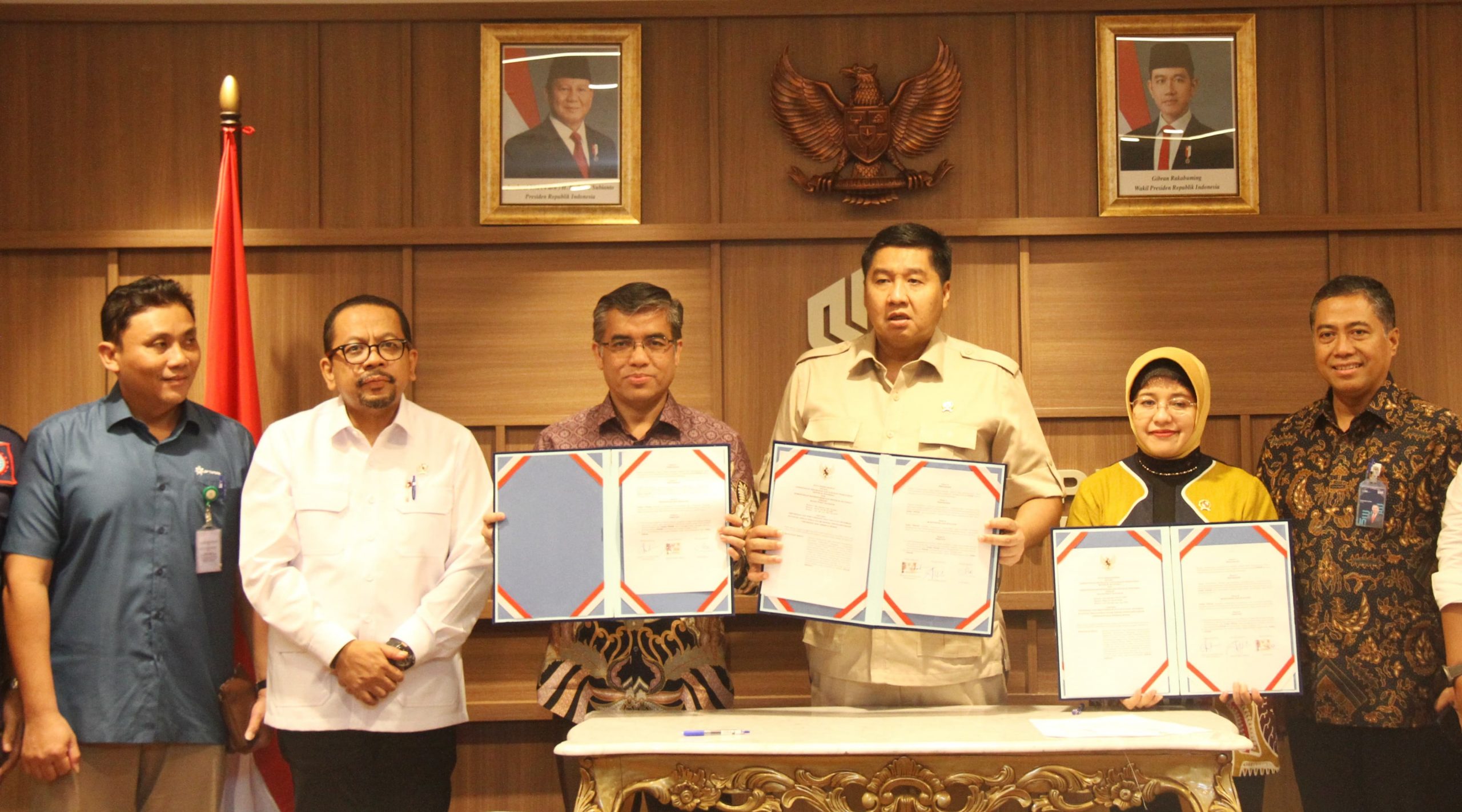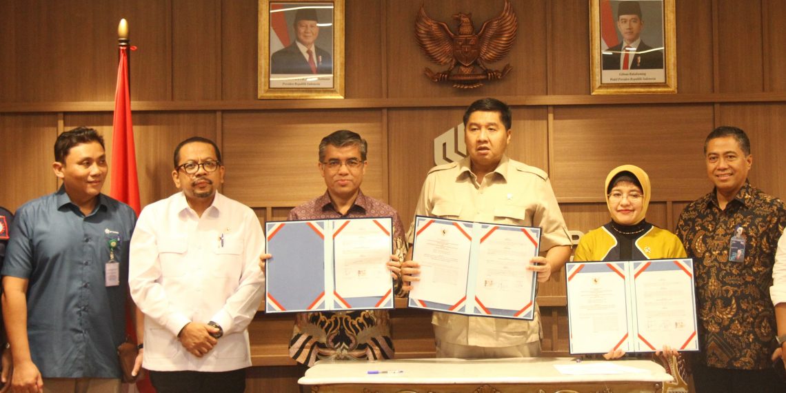 Direktur Consumer Banking BTN, Hirwandi Gafar bersama Wakil Kepala Staf Kepresidenan Muhammad Qodari, dan Komisioner BP Tapera Heru Pudyo Nugroho menyaksikan penandatanganan Nota Kesepahaman Dukungan Perumahan Subsidi Untuk Pekerja/Buruh yang dilakukan Menteri Ketenagakerjaan Yassierli, Menteri Perumahan dan Kawasan Permukiman Maruarar Sirait dan Kepala Badan Pusat Statistik (BPS) Amalia Adininggar Widyasanti di Jakarta, Kamis (10/4).