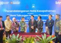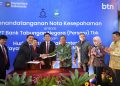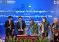 Simbolon memperlihatkan naskah MOU disaksikan Ompui Ephorus HKBP , Pdt. Dr. Victor Tinambunan, MST, Direktur Network & Retail Funding BTN Rully Setiawan, Direktur Commercial Banking BTN Hermita dan SEVP Digital Business BTN Thomas Wahyudi usai menandatangani Nota Kesepahaman (MOU) antara BTN dengan Huria Kristen Bataka Protestan (HKBP) dan Yayasan Universitas HKBP Nomensen di Medan, Sumater Utara, Selasa (26/8).