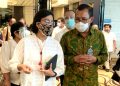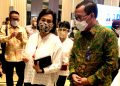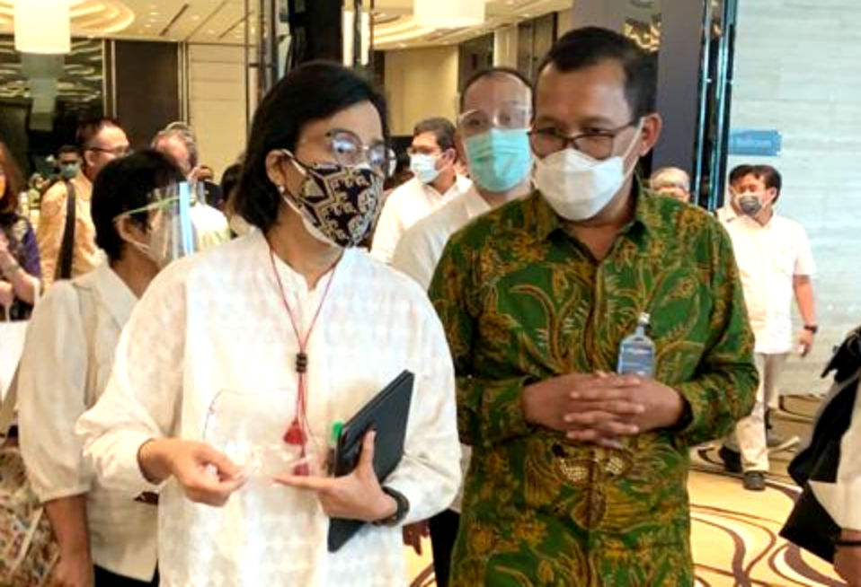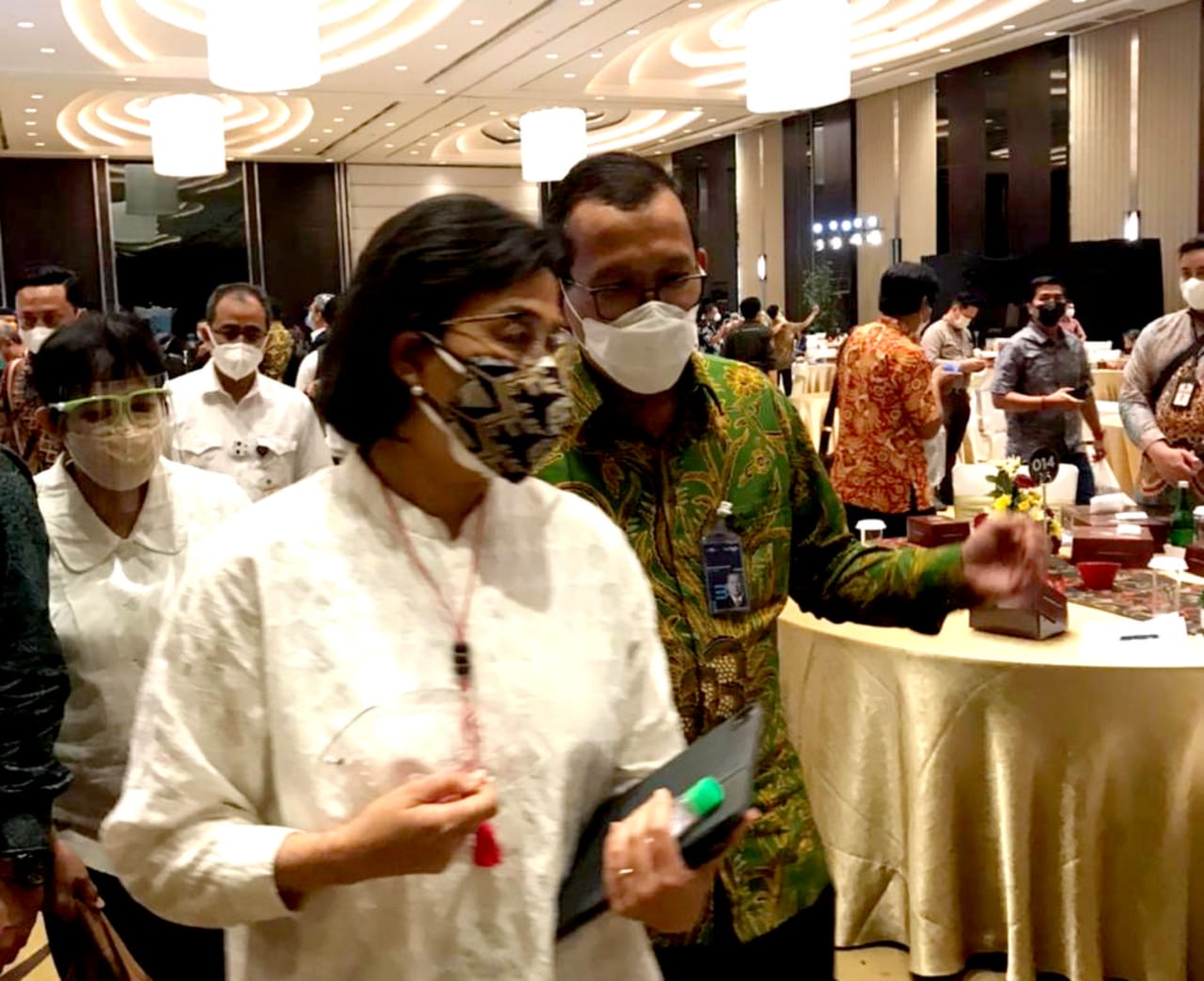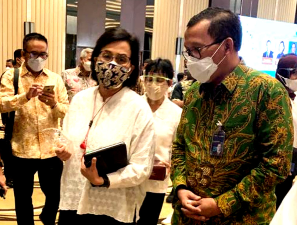 Direktur Utama PT Bank Tabungan Negara (Persero) Tbk. Haru Koesmahargyo (kanan) berbincang dengan Menteri Keuangan Republik Indonesia Sri Mulyani terkait program Pemulihan Ekonomi Nasional (PEN) di Semarang, Jawa Tengah, Kamis (25/3). Bank BTN berkomitmen untuk menjadi lokomotif dalam program PEN dengan bergotong royong, cepat tanggap, dan terus berkoordinasi dalam membantu pemerintah menyukseskan program PEN. Sampai dengan akhir tahun lalu, Bank BTN telah mengoptimalisasi penyaluran dana PEN mencapai Rp33,9 triliun yang telah disalurkan kepada lebih dari 108 ribu debitur perseroan.