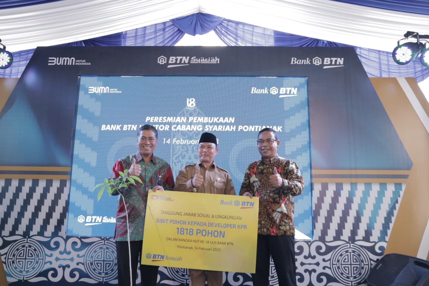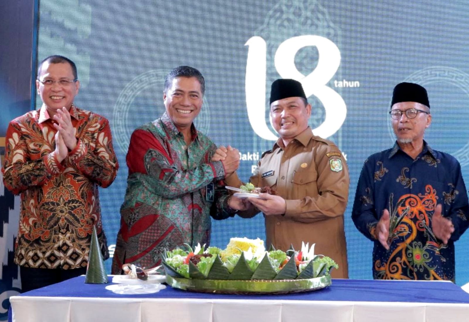 Direktur Consumer PT Bank Tabungan Negara (Persero) Tbk, Hirwandi Gafar (kedua dari kiri) menyerahkan potongan tumpeng pertama kepada Wakil Gubernur Kalimantan Barat, Ria Norsan (kedua dari kanan) disaksikan oleh Rektor Universitas Tanjung Pura, Garuda Wiko (kiri) dan Ketua MUI Provinsi Kalimantan Barat, M. Basri saat perayaan Hari Ulang Tahun Unit ke -18 Usaha Syariah BTN (BTN Syariah), di Pontianak, Selasa (14/2). BTN Syariah dalam usianya ke 18 tahun makin kokoh menjadi pendukung utama bisnis Bank BTN, khususnya di segmen pembiayaan perumahan dengan berkontribusi menyalurkan pembiayaan untuk lebih dari 318 ribu rumah bagi masyarakat Indonesia dan melayani lebih dari 1 juta nasabah.