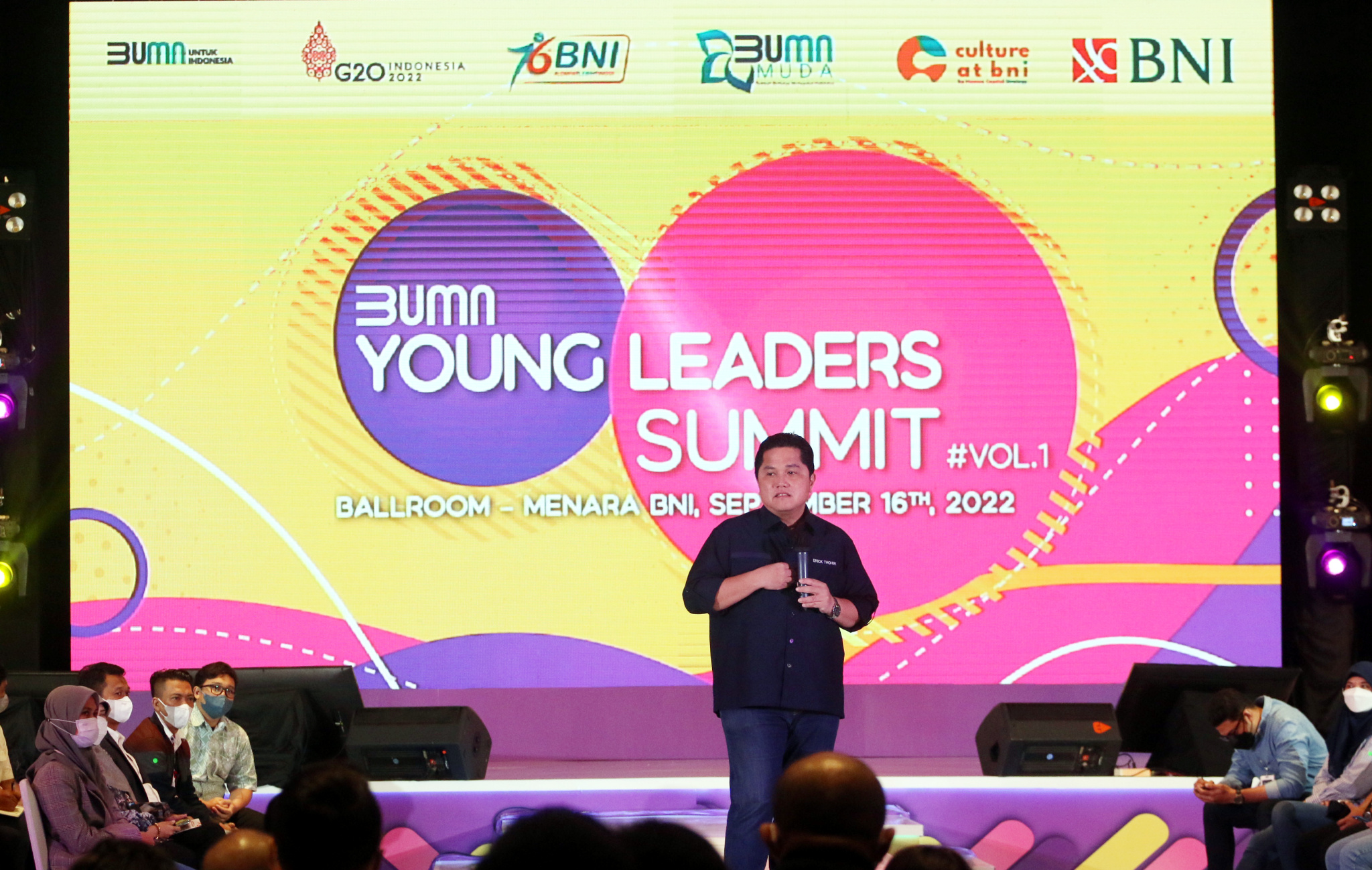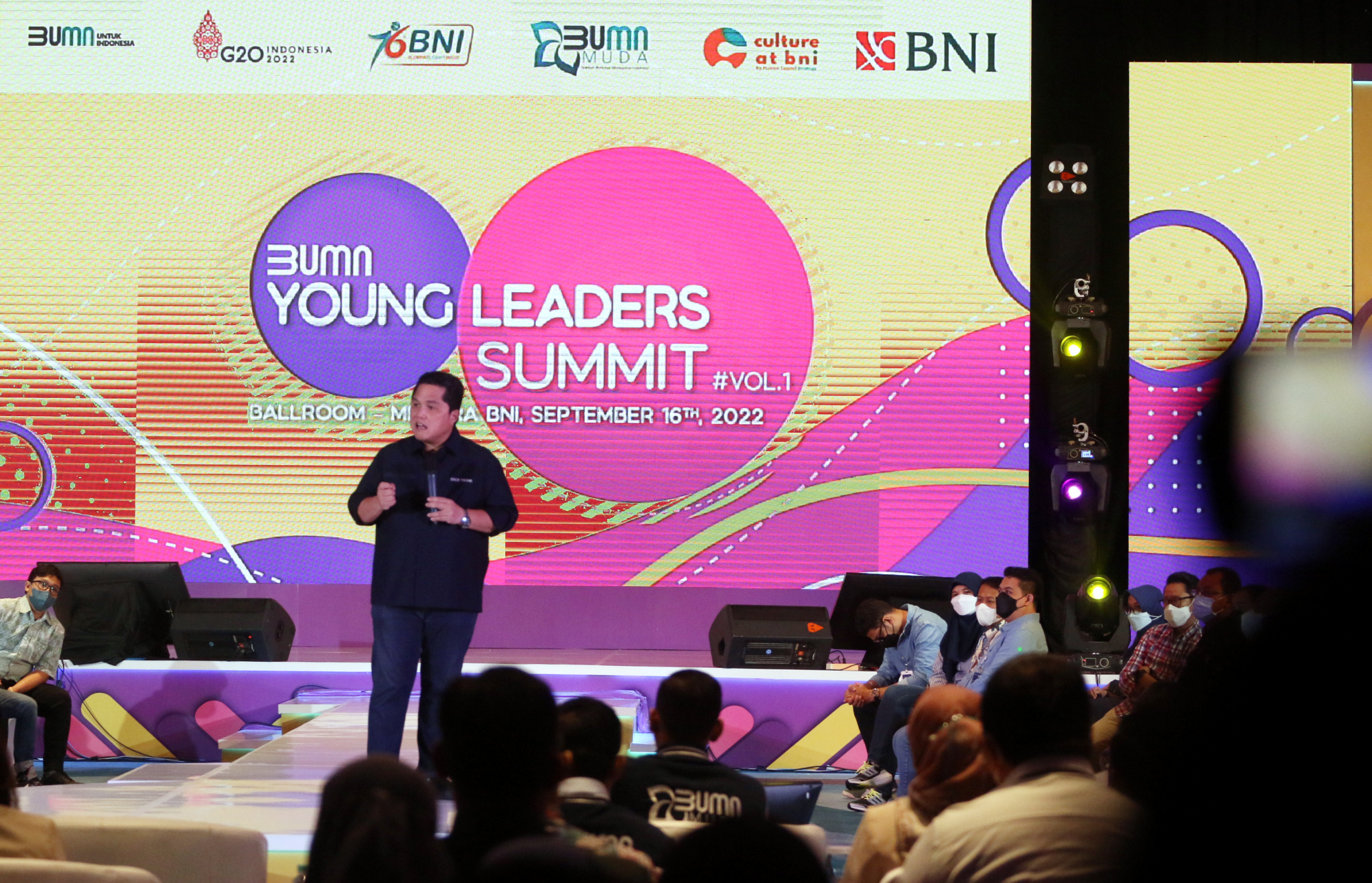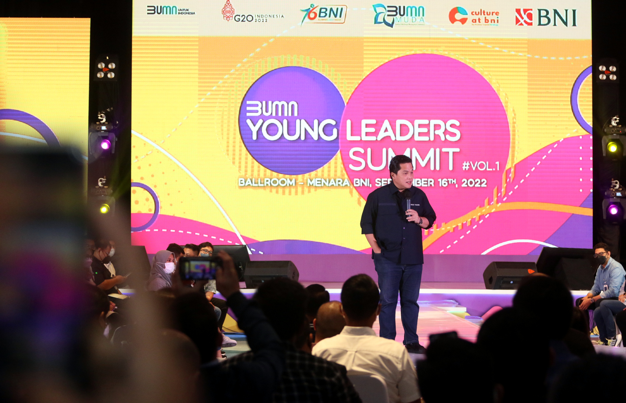 Menteri Badan Usaha Milik Negara Erick Thohir dalam BUMN Young Leader Summit Vol.1, di Menara BNI Jakarta, Jumat (16/9/2022).
