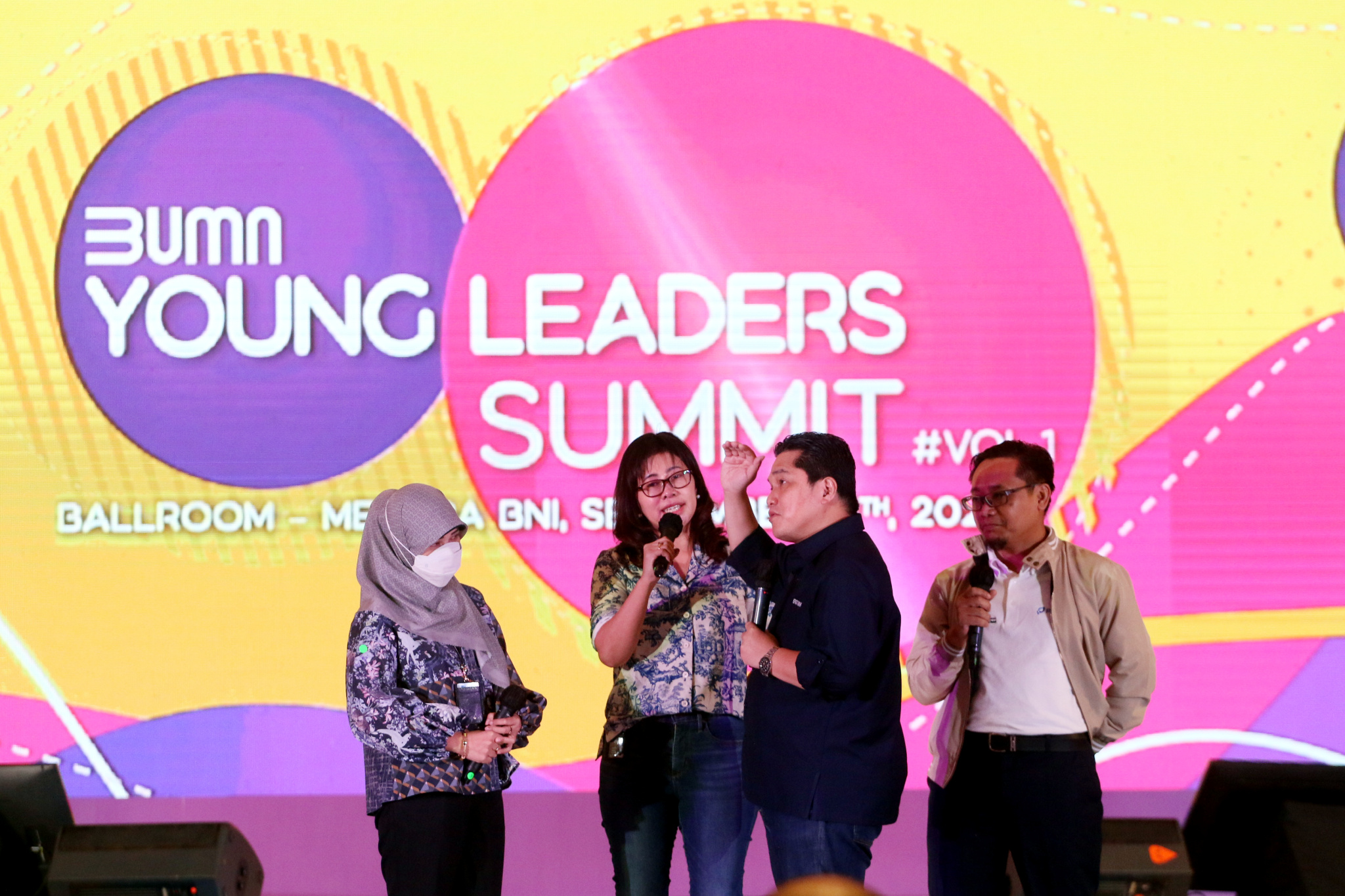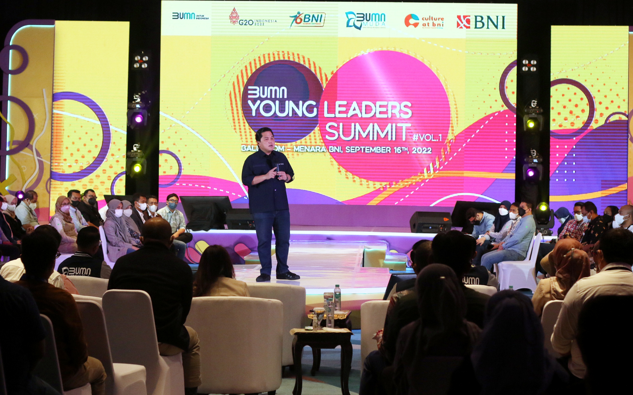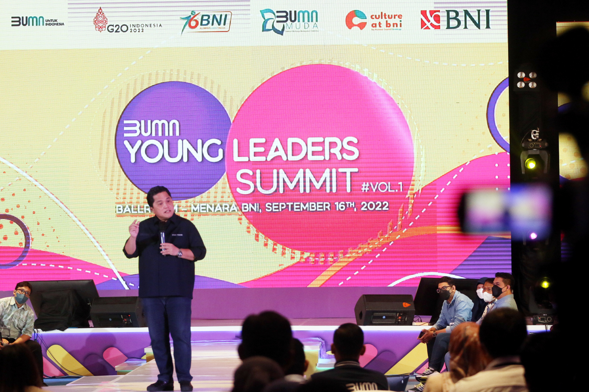 Menteri Badan Usaha Milik Negara Erick Thohir dalam BUMN Young Leader Summit Vol.1, di Menara BNI Jakarta, Jumat (16/9/2022).