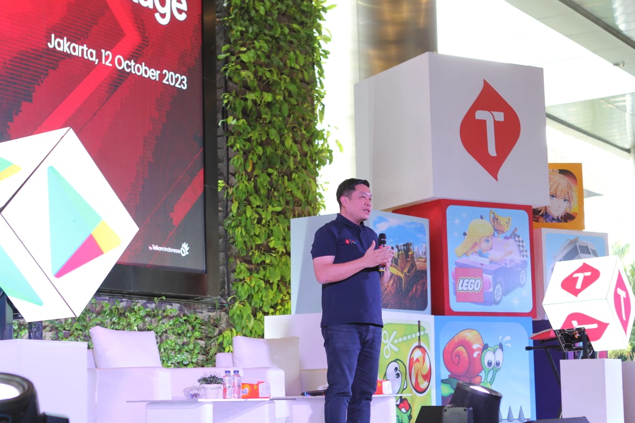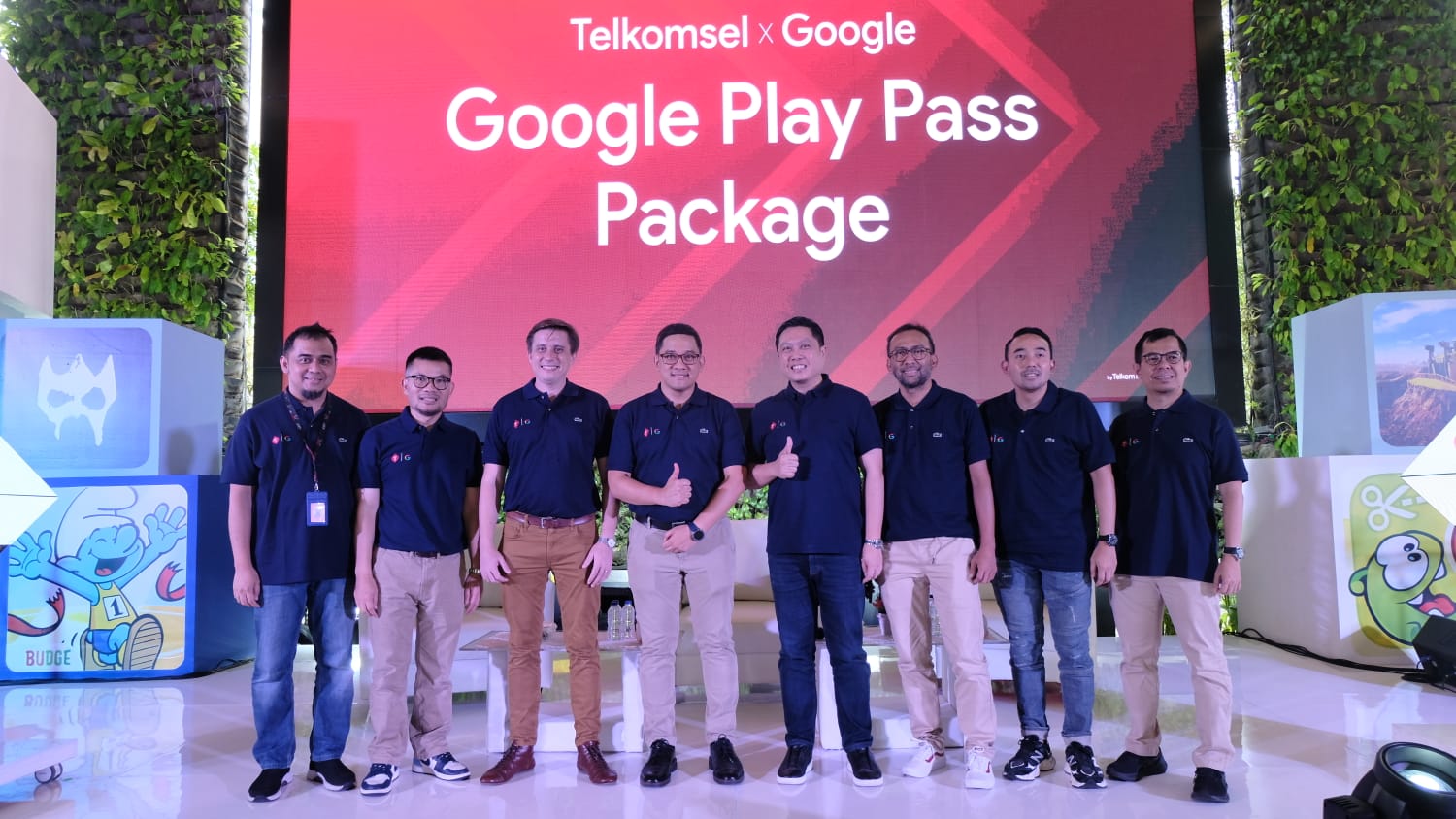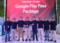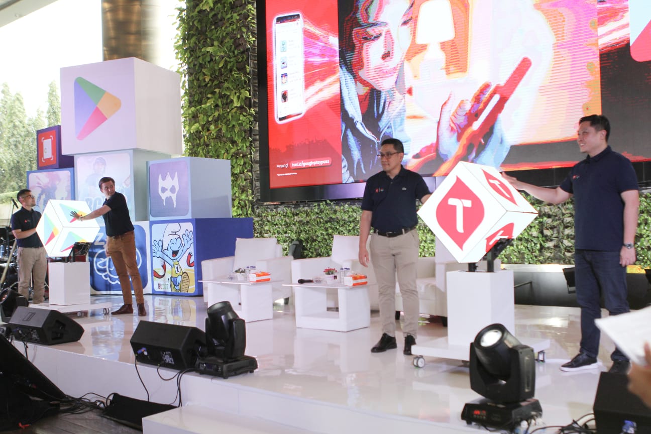 Head of Android Platforms & Ecosystems Google Indonesia Denny Galant (kiri) Direktur Marketing Telkomsel Derrick Heng (kanan) dan Jajaran Manajemen Telkomsel dan Google Indonesia saat peluncuran Program Bundling Play Pass Data Package di Jakarta, Kamis (12/10). Paket Bundling Play Pass Data Package ini menghadirkan ragam konten hiburan digital berkualitas bernilai tambah bagi pelanggan di mana Telkomsel menjadi operator pertama di Asia Tenggara yang menawarkan layanan paket data dengan langganan Google Play Pass.
