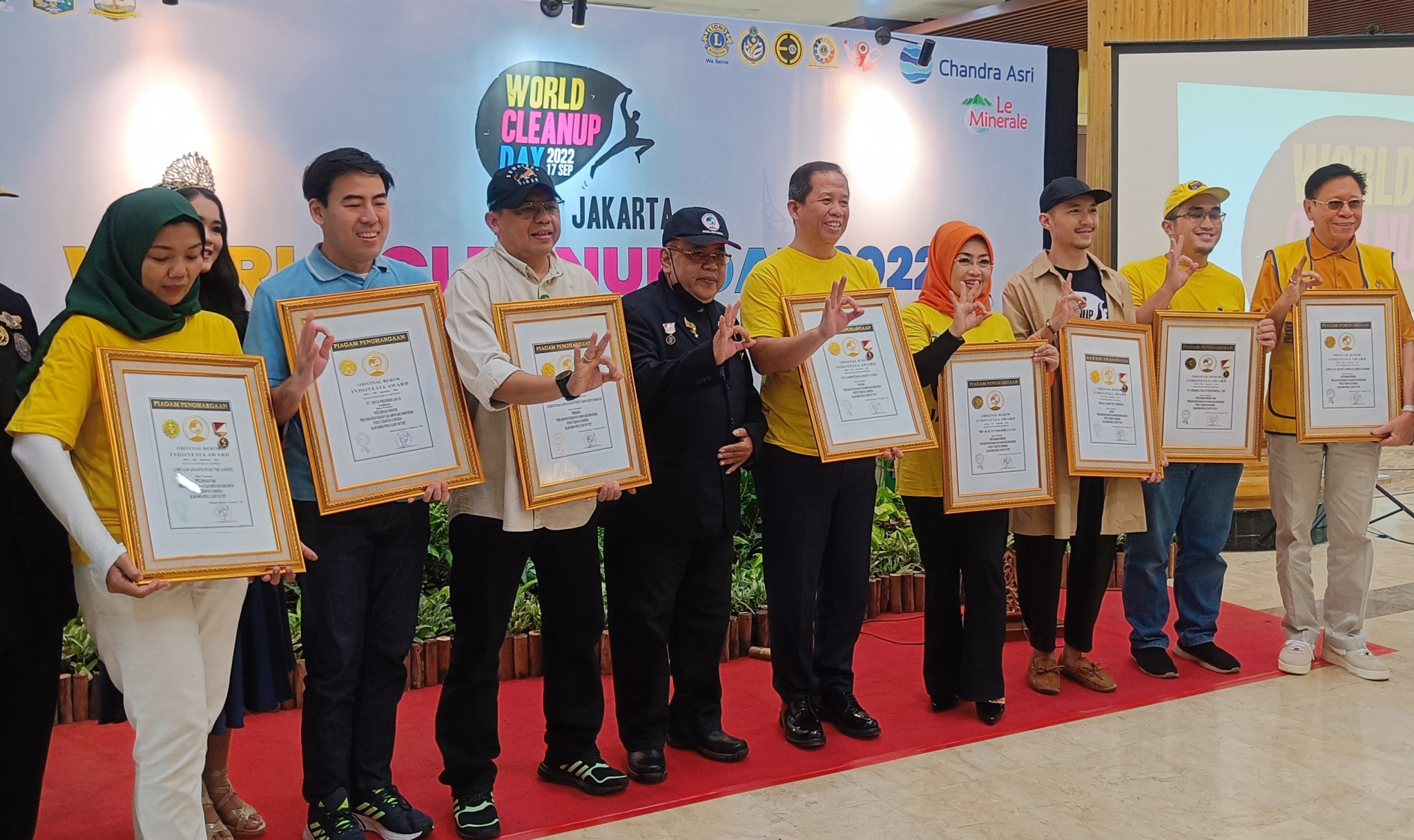Presiden Original Rekor Indonesia (ORI) Guruh Susanto (kanan) menyerahkan piagam rekor kepada Circular Economy Sr. Specialist PT Chandra Asri Petrochemical Tbk (Chandra Asri), Nicko Setyabudi (kiri) pada acara World Cleanup Day (WCD) 2022 yang diselenggarakan oleh Lions Club dengan tema Pilah Sampah Dari Rumah di Jakarta, Sabtu (17/9). Chandra Asri kembali mendukung program WCD Jakarta yang bertujuan untuk mengedukasi masyarakat menangani masalah sampah rumah tangga di Indonesia. Program ini diadakan di 600 lokasi di wilayah DKI Jakarta diikuti oleh 199.363 peserta dengan jumlah sampah yang berhasil terkumpul sebanyak 247.938 ton.