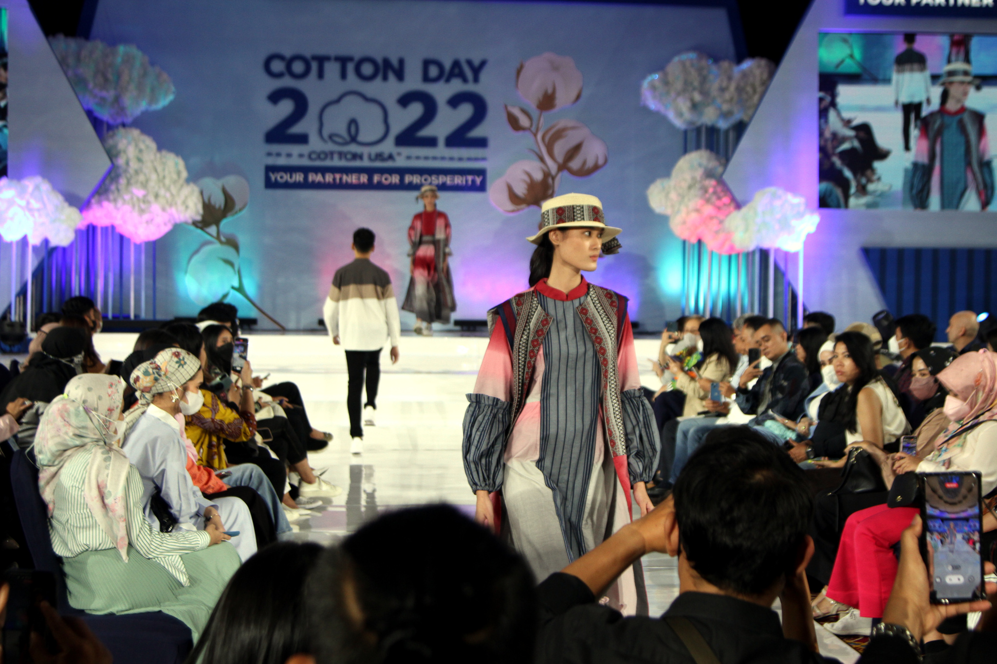 Dari kiri Perwakilan Cotton Council International (CCI) Indonesia Dr. Anh Dung (Andy) Do, Head of Merchandising, Cargill (ACSA) Lorena Monteiro, Senior Director, Asia, Cotton Council International Razvan Oancea, Senior Vice President Olam Agri Americas (ACSA) John King, dan Assistant Program Representative, Cotton Council International (CCI) Indonesia Ivana Noor berbincang dalam acara COTTON DAY 2022 di Jakarta, Rabu (12/10/2022). Acara ini mencakup seminar dan peragaan busana untuk mempromosikan serat kapas Amerika Serikat (COTTON USA) dan menyediakan forum bagi semua pelaku industri untuk membangun jaringan sekaligus mendorong transformasi industri tekstil di Indonesia.