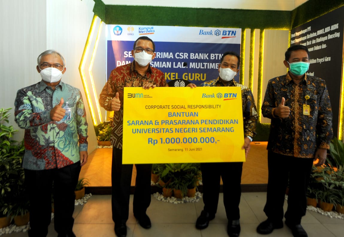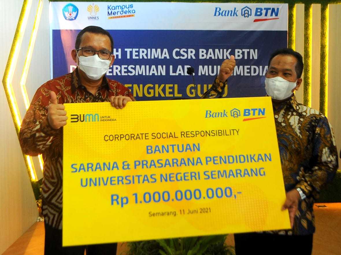 PT Bank Tabungan Negara (Persero) Tbk memberikan bantuan Corporate Social Responsibilty (CSR) untuk mendukung sarana dan prasarana di lingkungan kampus kepada Universitas Negeri Semarang (Unnes). Bantuan yang akan digunakan untuk pengembangan laboratorium digital tersebut diserahkan langsung oleh Direktur Utama Bank BTN Haru Koesmahargyo dan diterima oleh Rektor Unnes Fathur Rochman di gedung rektorat Unnes Semarang, Jumat (11/6). Dengan dukungan tersebut diharapkan ke depan Unnes dapat mengembangkan kompetensi peserta didik pada perguruan tinggi tersebut khusus terkait dengan multimedia.