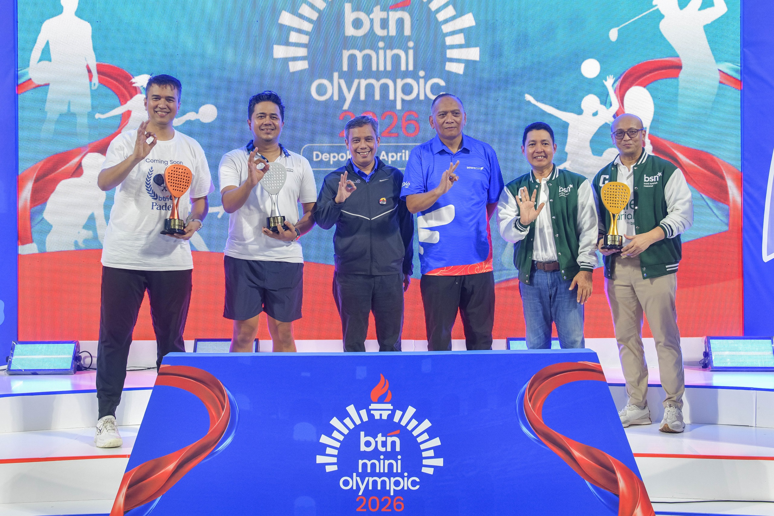 Direktur Utama PT Bank Tabungan Negara (Persero) Tbk (BTN) Nixon LP Napitupulu (tiga dari kiri) dan Komisaris Independen BTN Pietra Machreza Paloh (tiga dari kanan) bersama para pemenang Padel Smash Challenge dalam rangkaian closing ceremony BTN Mini Olympic 2026 di BTN Ecopark Gandul, Depok, Jumat (24/4). BTN Mini Olympic merupakan simbol budaya kerja BTN yang sehat dan kolaboratif. Di tengah kondisi pasar yang semakin menantang, perusahaan tidak hanya fokus pada kinerja, tapi juga memperhatikan kesehatan fisik, mental, serta kualitas kolaborasi tim. BTNers Club dan komunitas internal memiliki peran strategis sebagai wadah untuk membangun engagement dan kepercayaan. Inisiatif “Culture at BTN” berfungsi bukan hanya sebagai saluran komunikasi, namun juga sebagai platform kolaborasi, ruang berbagi ide, dan penguat budaya kerja modern. Hal ini bertujuan untuk menjadikan BTN sebagai organisasi yang agile, kolaboratif, dan terhubung. Seluruh upaya ini sebagai bagian dalam mendukung pencapaian target bisnis BTN di 2026.