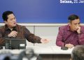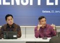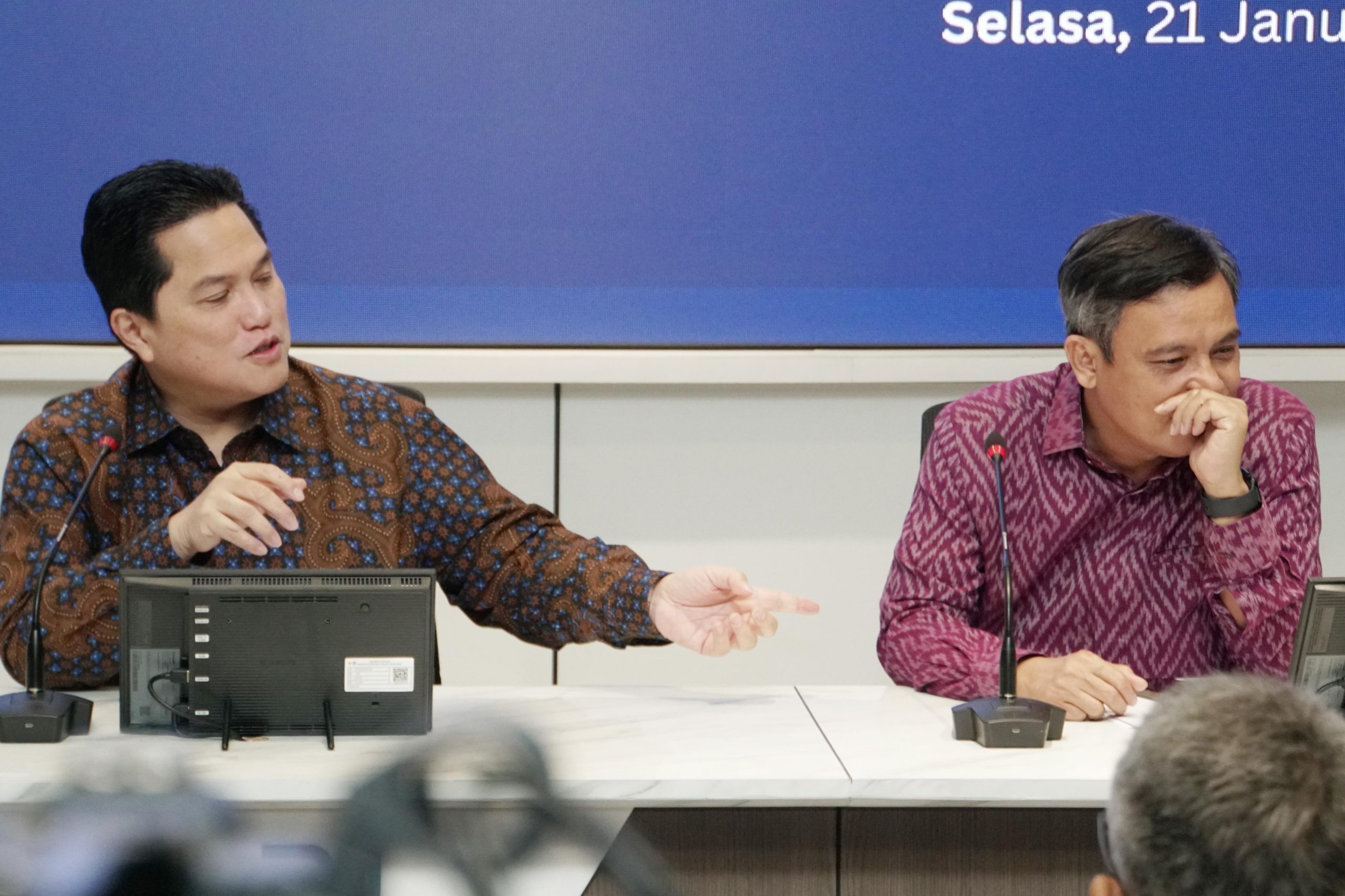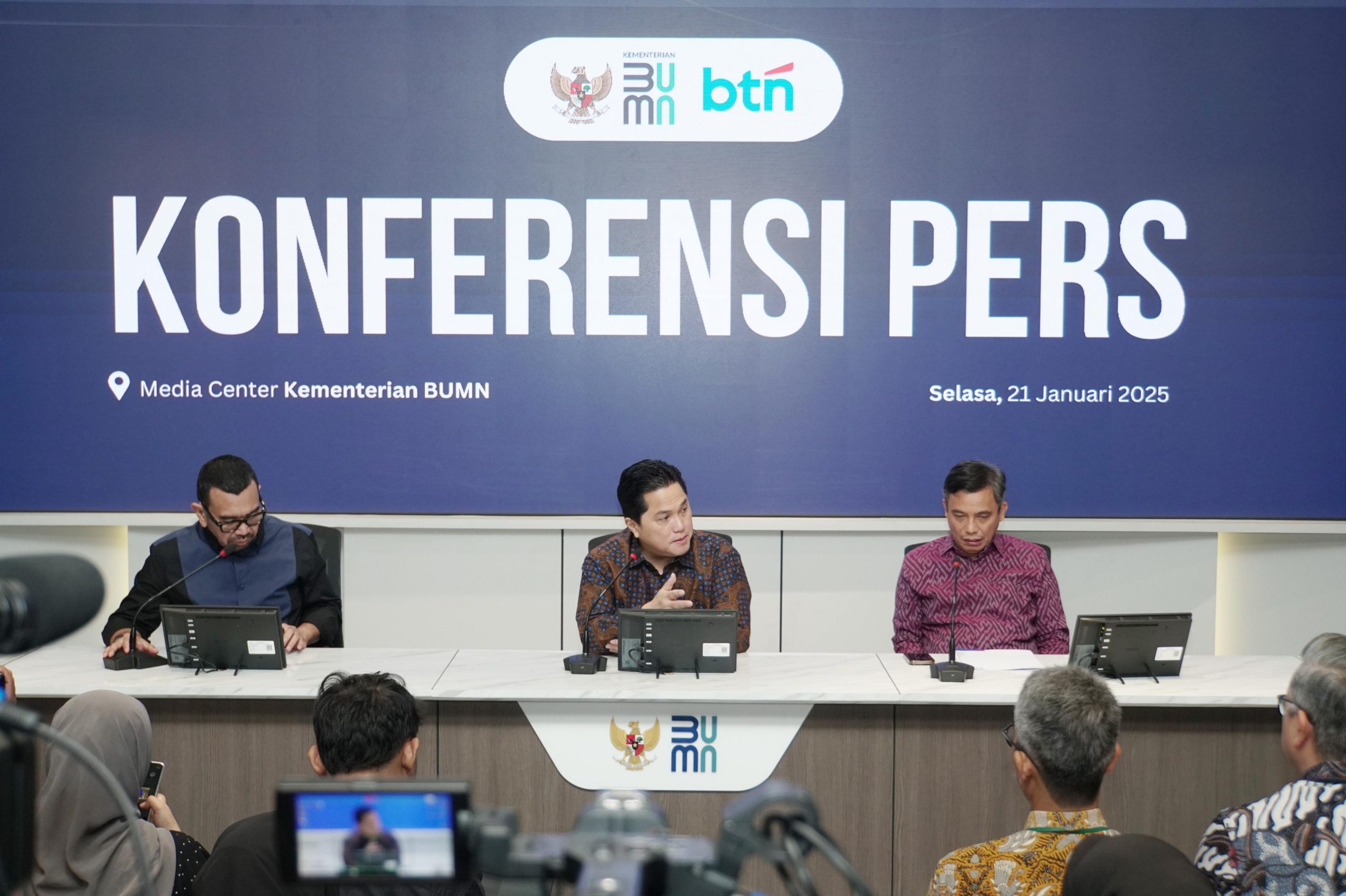 Menteri Badan Usaha Milik Negara Erick Thohir (kiri) berjabatan tangan dengan Direktur Utama PT Bank Tabungan Negara (Persero) Tbk, Nixon LP Napitupulu (kanan) usai menggelar konferensi pers bersama dalam rangka melindungi hak masyarakat dari Developer dan Notaris bermasalah di Jakarta, Selasa (21/6). Menteri BUMN Erick Thohir meminta Himbara melakukan black list terhadap developer dan notaris yang bermasalah dan saling berbagi data terkait untuk memastikan perlindungan rakyat bisa dimaksimalkan. Menteri BUMN juga mendorong BTN untuk melakukan percepatan penyelesaian sertipikat debitur dengan melakukan perbaikan sistem dan menerapkan tata kelola yang baik (Good Corporate Governance/GCG) untuk menyukseskan Program Tiga Juta Rumah yang diusung Pemerintahan Presiden Prabowo Subianto.