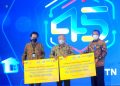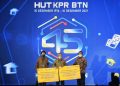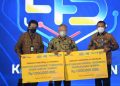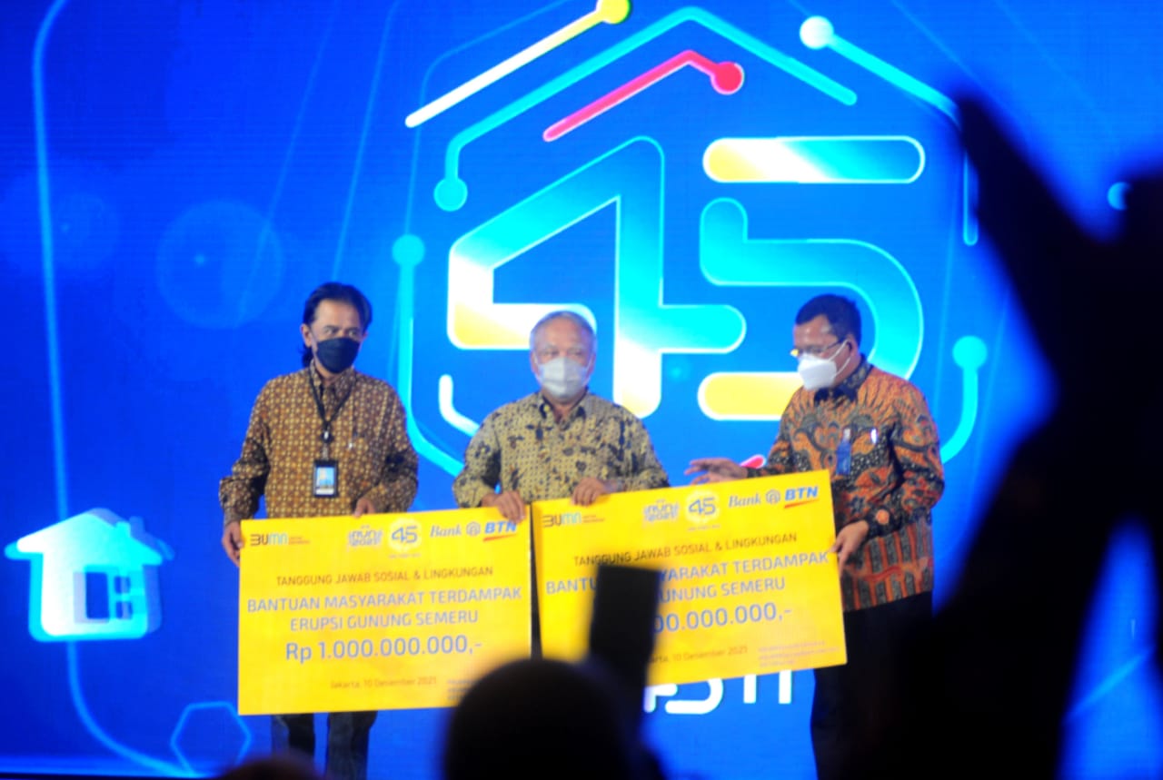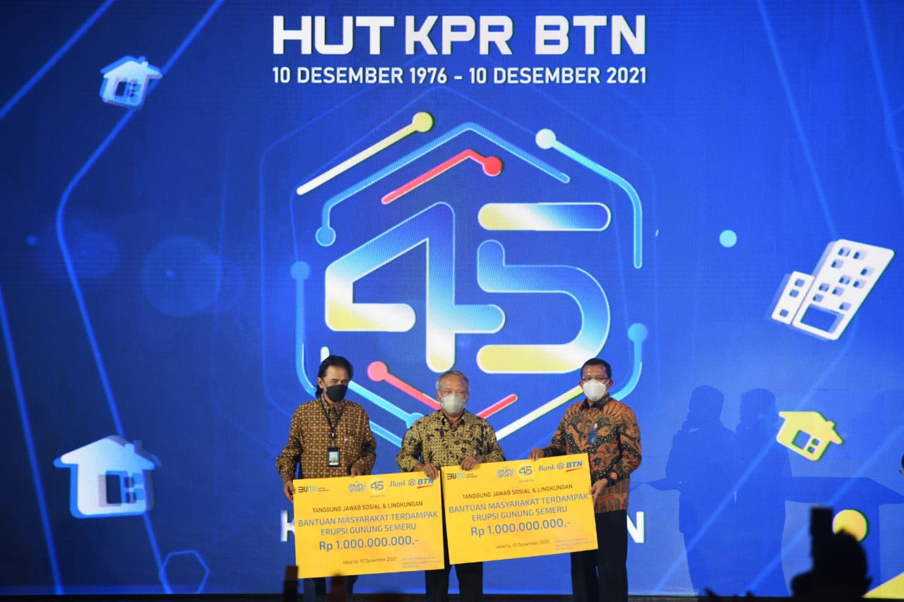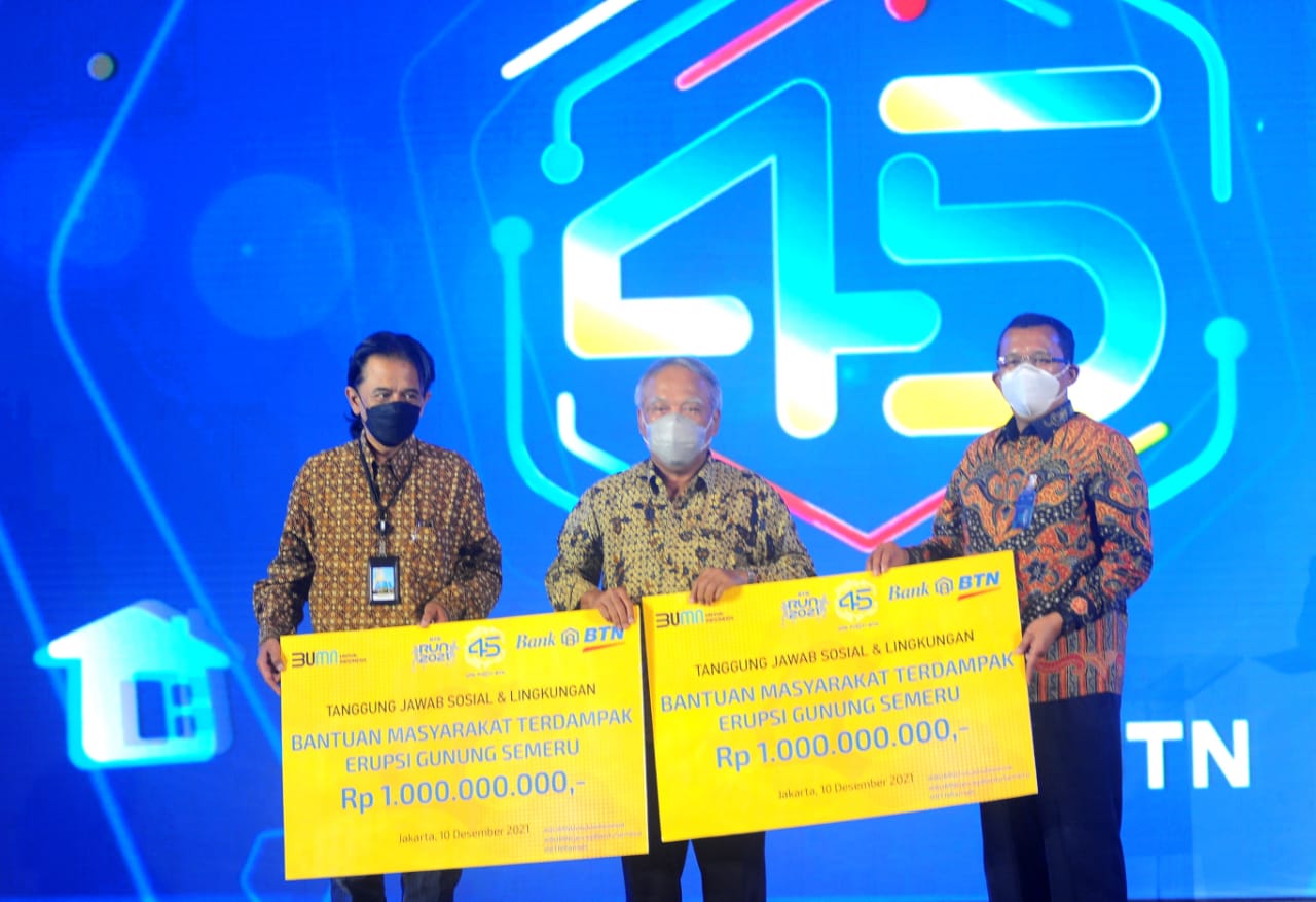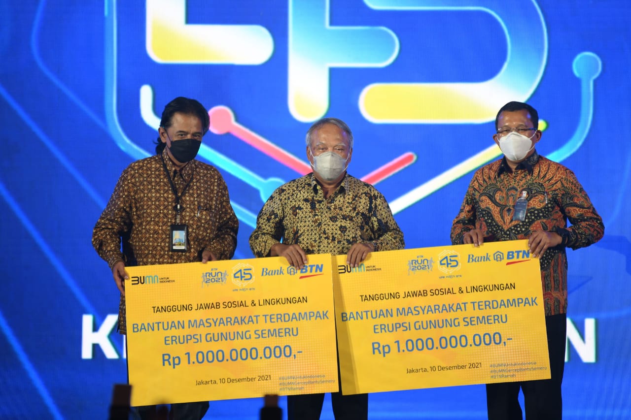 Komisaris Utama PT Bank Tabungan Negara (Persero) Tbk Chandra Hamzah (kiri) bersama Menteri Pekerjaan Umum dan Perumahan Rakyat Basuki Hadimoeljono (tengah) dan Direktur Utama Bank BTN Haru Koesmahargyo (kanan) menunjukkan tanda simbolis bantuan Bank BTN terhadap korban bencana erupsi Gunung Semeru di Jakarta, Jumat (10/12). Bantuan tersebut dihitung dari donasi para peserta lari yang dapat menyelesaikan finish di ajang BTN RUN 2021 HUT KPR 45 yang akan diselenggarakan pada hari Minggu (12/12) . Bantuan tersebut juga merupakan wujud tanggung jawab sosial perseroan kepada masyarakat.