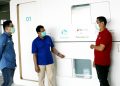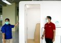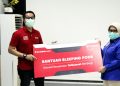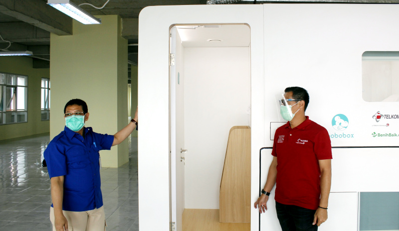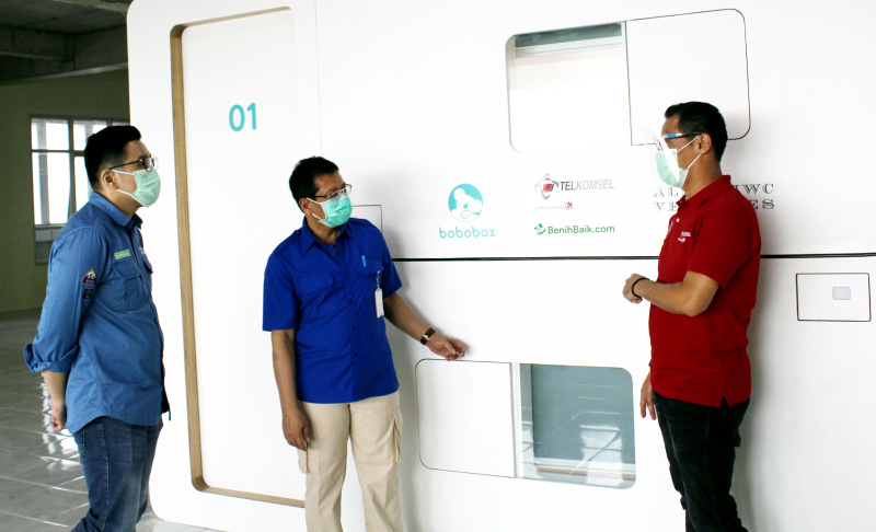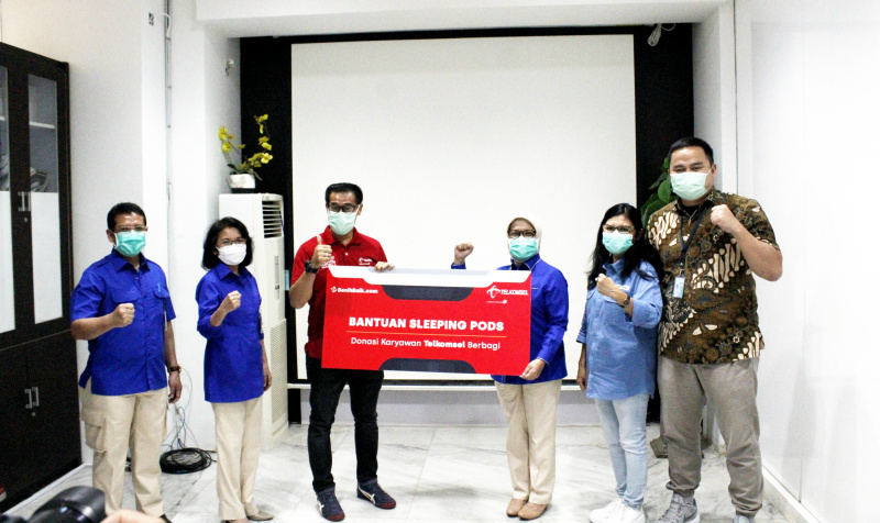 Manager CSR Program Support Telkomsel Yanto Santoso (ketiga kiri) dan Direktur Utama RSCM dr. Lies Dina Liastuti Sp.JP (ketiga kanan), beserta perwakilan manajemen RSCM & BenihBaik.com saat penyerahan bantuan 8 unit sleeping pods secara simbolis di RSCM, Jakarta, Rabu (19/8). Mendorong kepedulian dari internal perusahaan, Telkomsel telah menggalang donasi THR dari karyawan berupa sleeping pods untuk disalurkan kepada para tenaga medis, yang bantuannya disalurkan melalui platform BenihBaik.com.