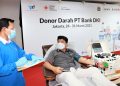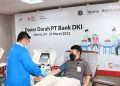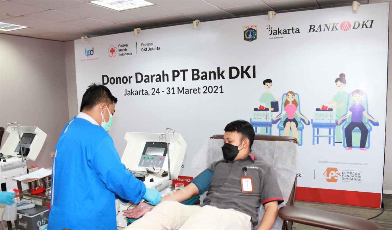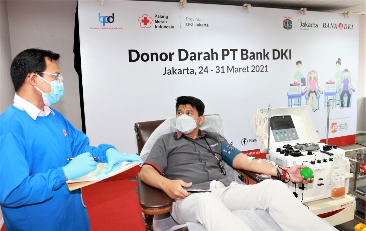 Petugas PMI Provinsi DKI Jakarta (kiri foto) melakukan pengambilan darah dari karyawan Bank DKI (kanan foto) dalam kegiatan donor darah plasma konvalesen yang dilaksanakan di Kantor Pusat Bank DKI, Jakarta (24/03). Kegiatan donor darah ini dilaksanakan bekerjasama dengan PMI Provinsi DKI Jakarta sebagai rangkaian kegiatan dalam menyambut Hari Ulang Tahun PT Bank DKI Ke-60 yang jatuh pada 11 April 2021.
