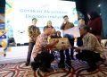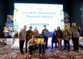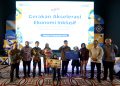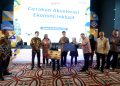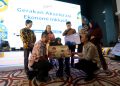 Corporate Secretary Bank Mandiri Rudi As Aturridha (berlutut kiri) dan Komisioner Komisi Nasional Disabilitas Kikin Tarigan (berlutut kanan) bersama