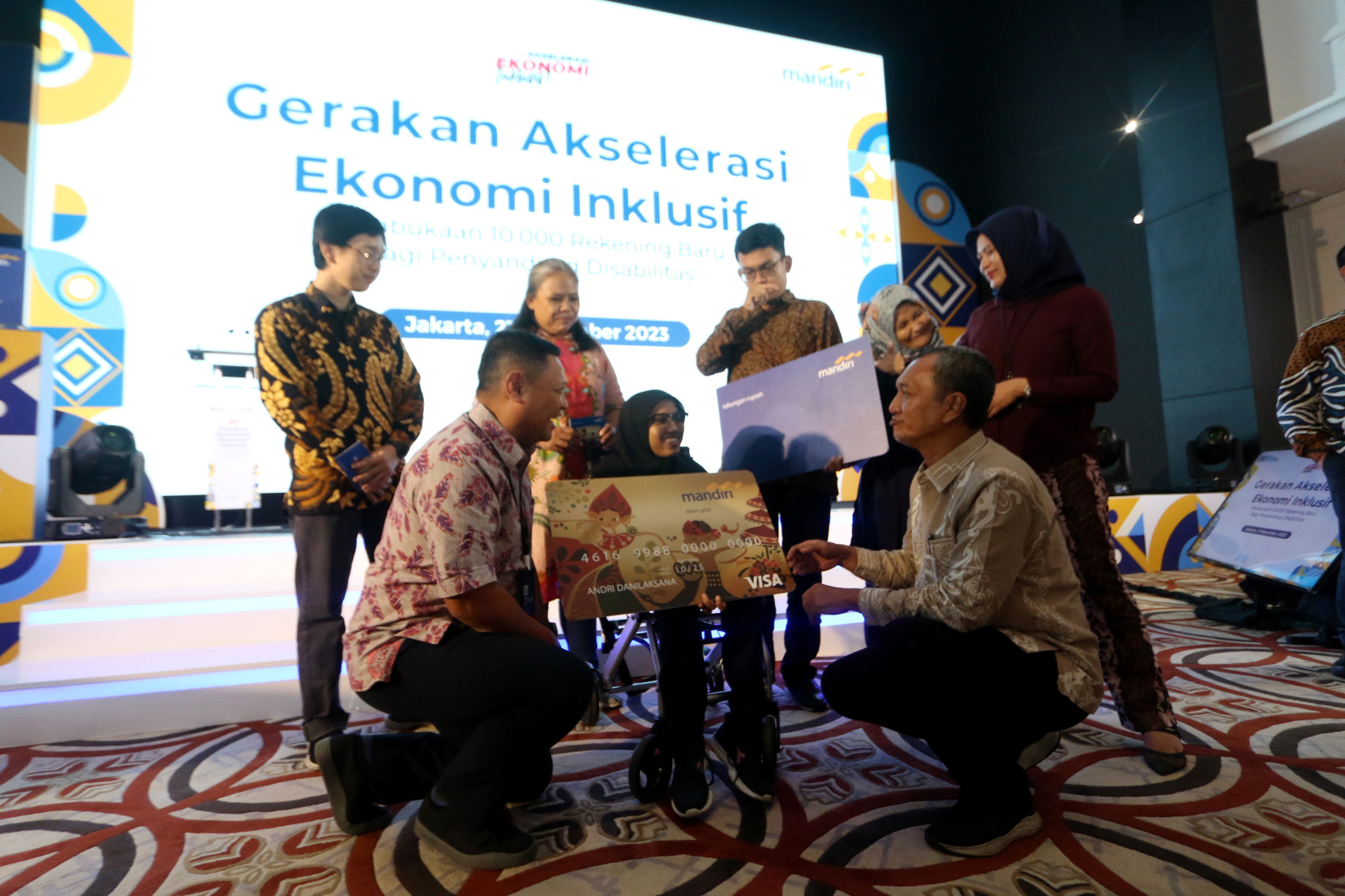 SVP Retail Deposit Products and Solution Bank Mandiri Evi Dempowati (kanan berdiri) berbincang dengan perwakilan penyandang disabilitas dari Yayasan Menembus Batas di sela seremoni pembukaan rekening tabungan di Plaza Mandiri, Jakarta, Selasa (21/11). Menjadi bagian dari peringatan Hari Disabilitas Nasional pada 2 Desember 2023, Bank Mandiri memberikan 10.000 rekening tabungan baru bagi penyandang disabilitas yang tersebar di Jawa Barat, Jawa Tengah, dan Yogyakarta. Guna memperkuat inklusifitas layanan keuangan, kegiatan ini juga memberikan edukasi dan pengenalan produk perbankan kepada penyandang disabilitas agar dapat memanfaatkan secara optimal.