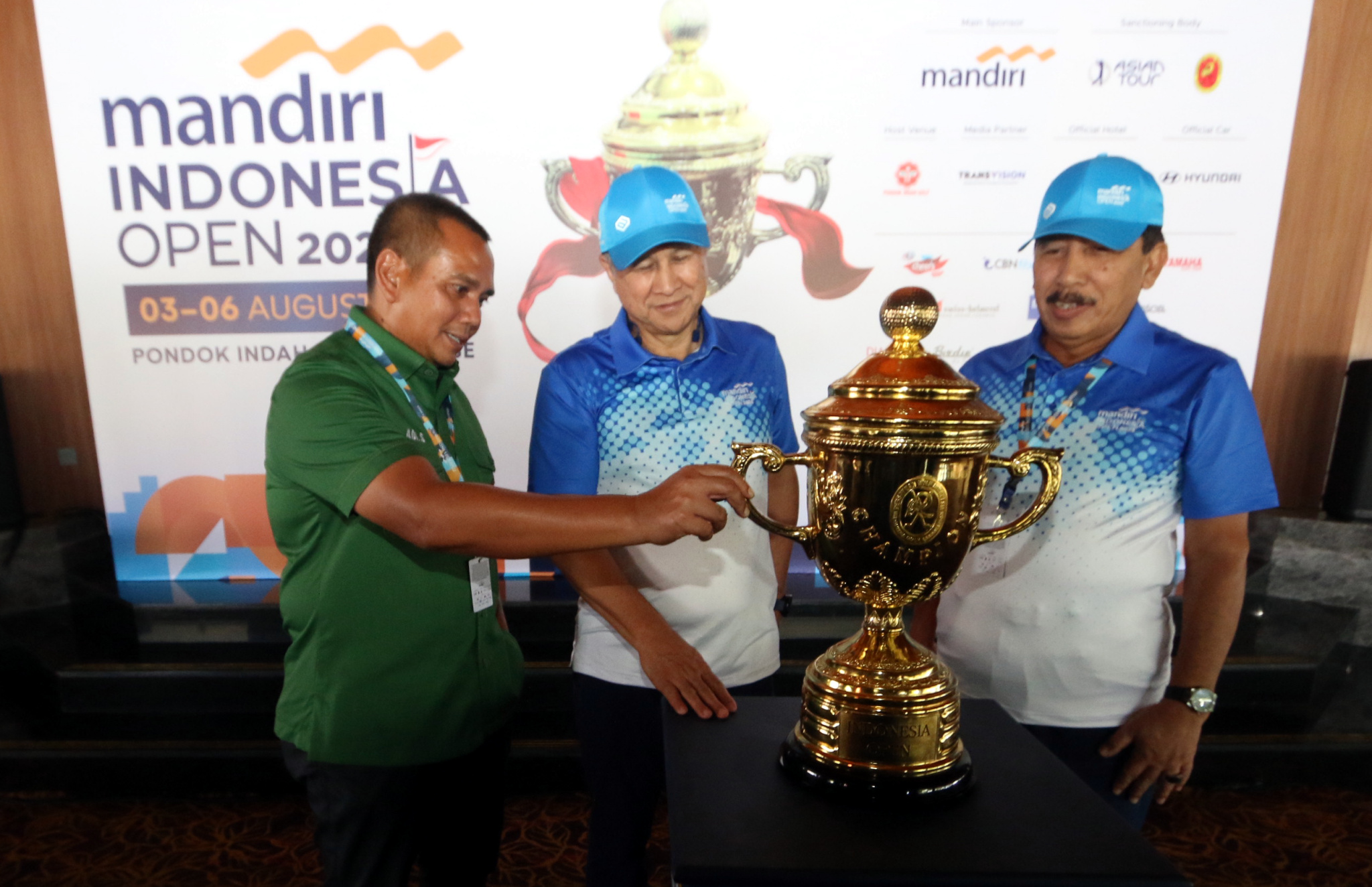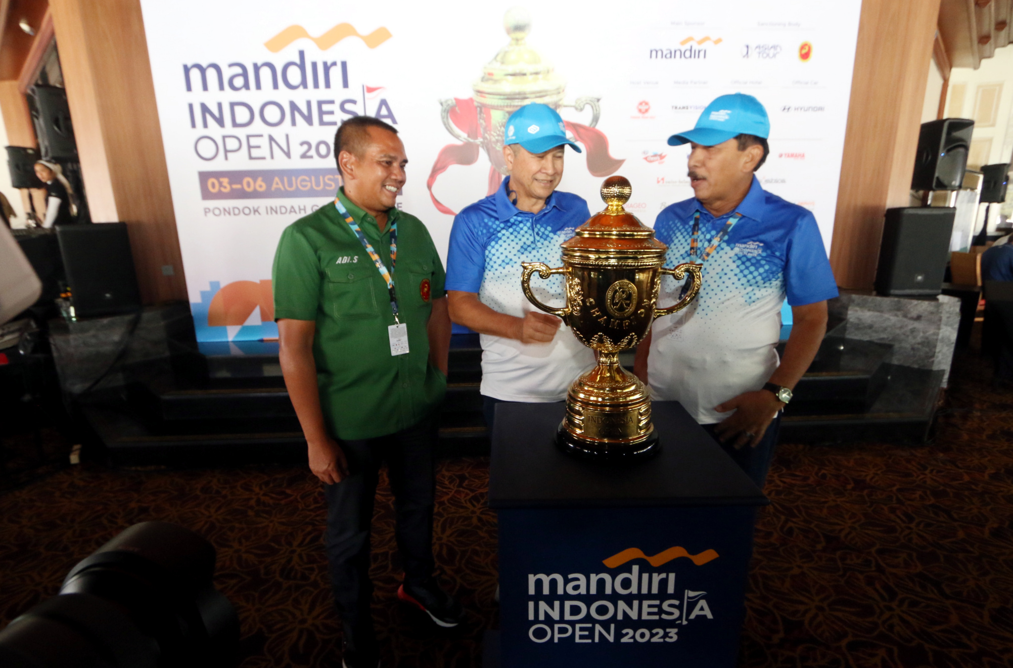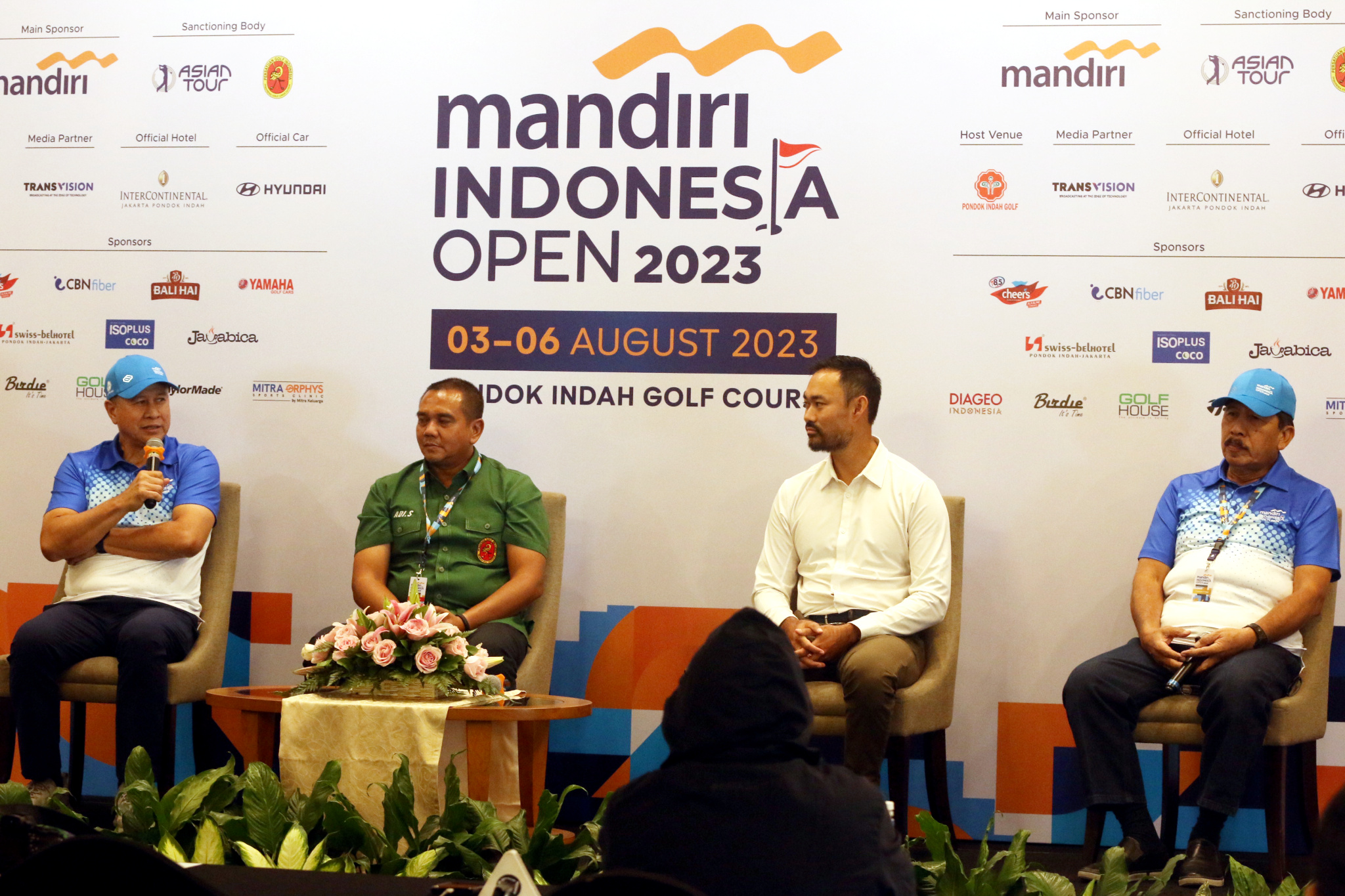 (Kiri- kanan) Direktur Hubungan Kelembagaan Bank Mandiri Rohan Hafas, Ketua Bidang Kejuaraan dan Prestasi Pengurus Besar (PB) Persatuan Golf Indonesia (PGI) Adi Saksono, Commissioner & CEO Asian Tour Cho Minn Thant, dan Presiden Komisaris Pondok Indah Golf Course Agus Suhartono saat berfoto bersama pada Konferensi Pers Mandiri Indonesia Open 2023 di Jakarta, Selasa (1/8). Ajang tahunan yang diikuti 150 pegolf profesional dari beberapa negara di kawasan Asia ini bakal berlangsung pada 3-6 Agustus 2023 di Pondok Indah Golf Course, Jakarta Selatan dengan hadiah total sebesar US$ 500.000. Sebagai sponsor utama, Bank Mandiri berharap ajang yang masuk dalam kalender Asian Tour 2023 ini mampu memberikan kontribusi positif untuk pengembangan prestasi golf di Indonesia dan menggairahkan wisata olahraga (sport tourism) di Tanah Air.