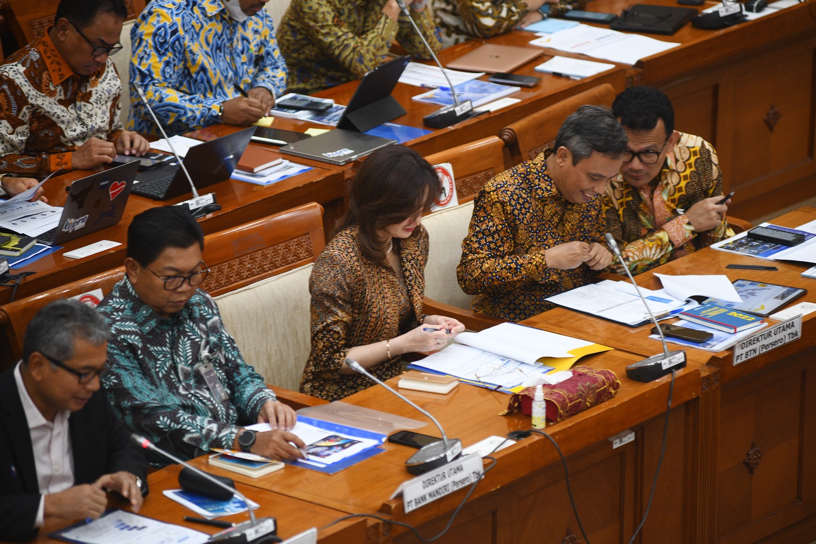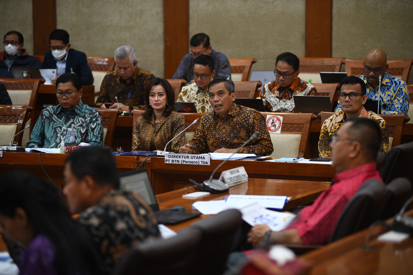 Direktur Utama Bank BTN Nixon LP Napitupulu didampingi Direktur Finance Bank BTN Nofry Rony Poetra melakukan presentasi terkait kinerja Bank BTN Tahun 2022 dan Rencana Kerja Bank Tahun 2023 saat menghadiri Rapat Dengar Pendapat (RDP) antara Komisi VI DPR dengan Himpunan Bank Milik Negara (Himbara) di Jakarta, Selasa (28/3). Dalam RDP tersebut, DPR mengapresiasi kinerja Bank BTN tahun 2022 yang sangat positif dan diharapkan bisa berlanjut pada tahun ini. Bank BTN memastikan bisnis perseroan tidak akan terdampak krisis perbankan yang terjadi di Amerika Serikat. Untuk memitigasi risiko krisis, Bank BTN akan melakukan uji stress secara berkala dan menjaga likuiditas perseroan.