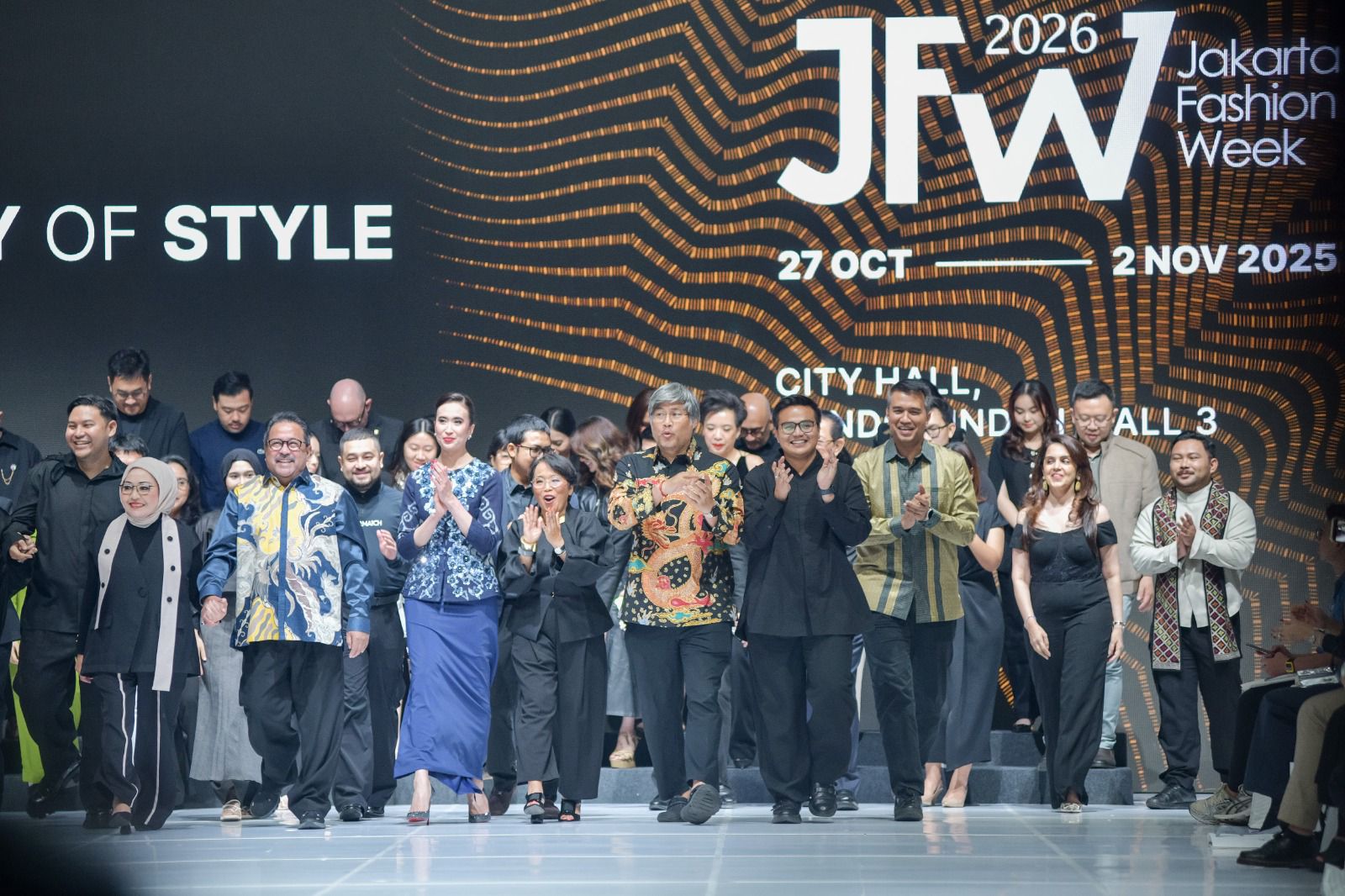 Corporate Secretary BTN, Ramon Armando (kanan), Menteri Pariwisata Republik Indonesia Widiyanti Putri Wardhana (kiri), Svida Alisjahbana CEO GCM Group & Chairman Jakarta Fashion Week (kedua dari kiri) dan Komisaris PT Metropolitan Kentjana Tbk, Karuna Murdaya (tengah) serta Creative Director Jakarta Fashion Week, Andandika Surasetja (kedua dari kanan) melangkah bersama di atas runway dalam acara Pembukaan Jakarta Fashion Week (JFW) 2026, di Jakarta, Senin (27/10)