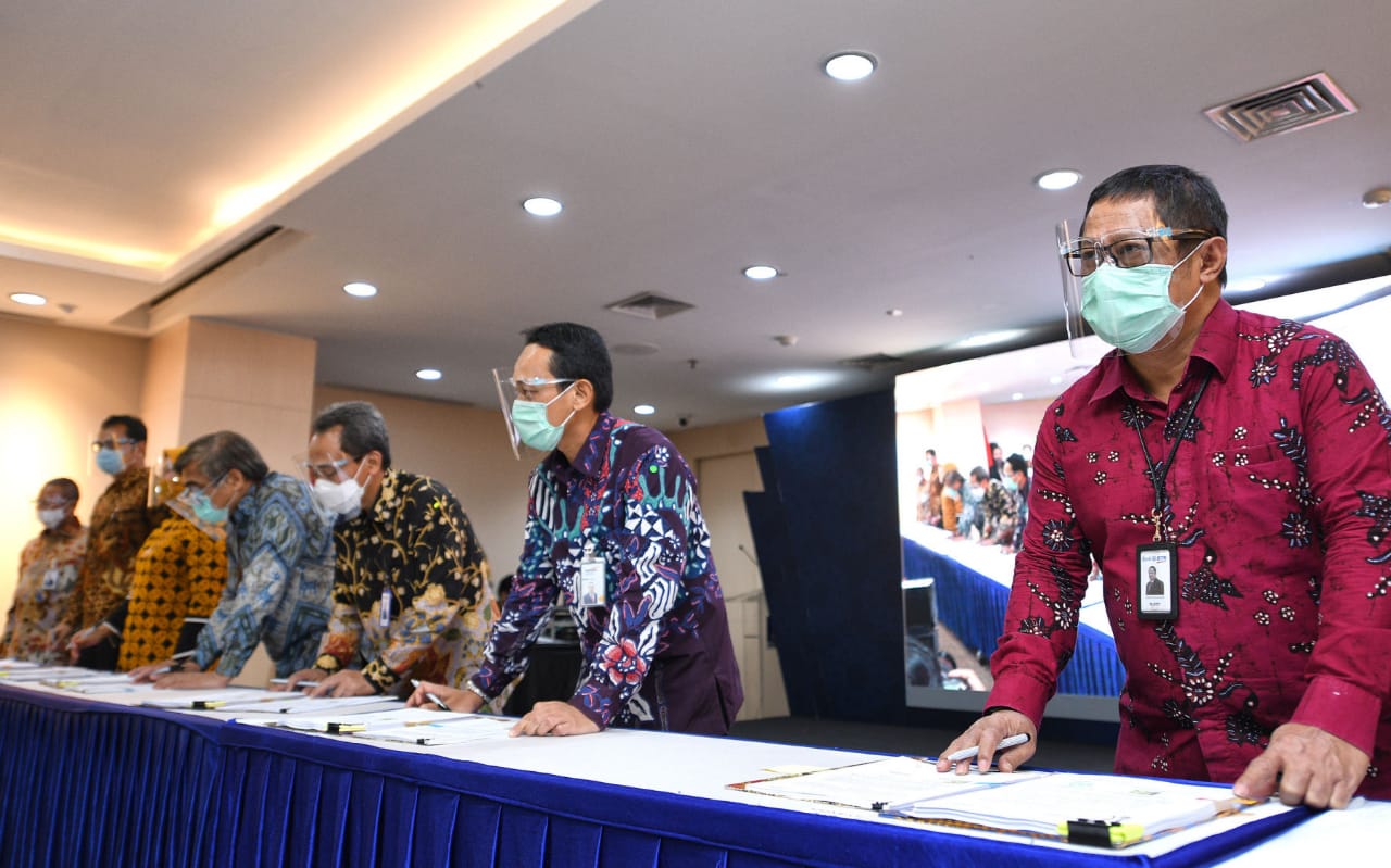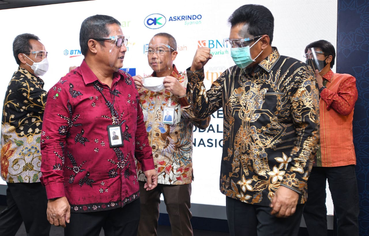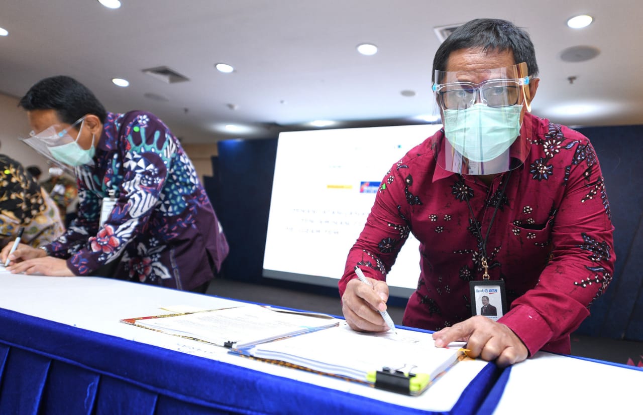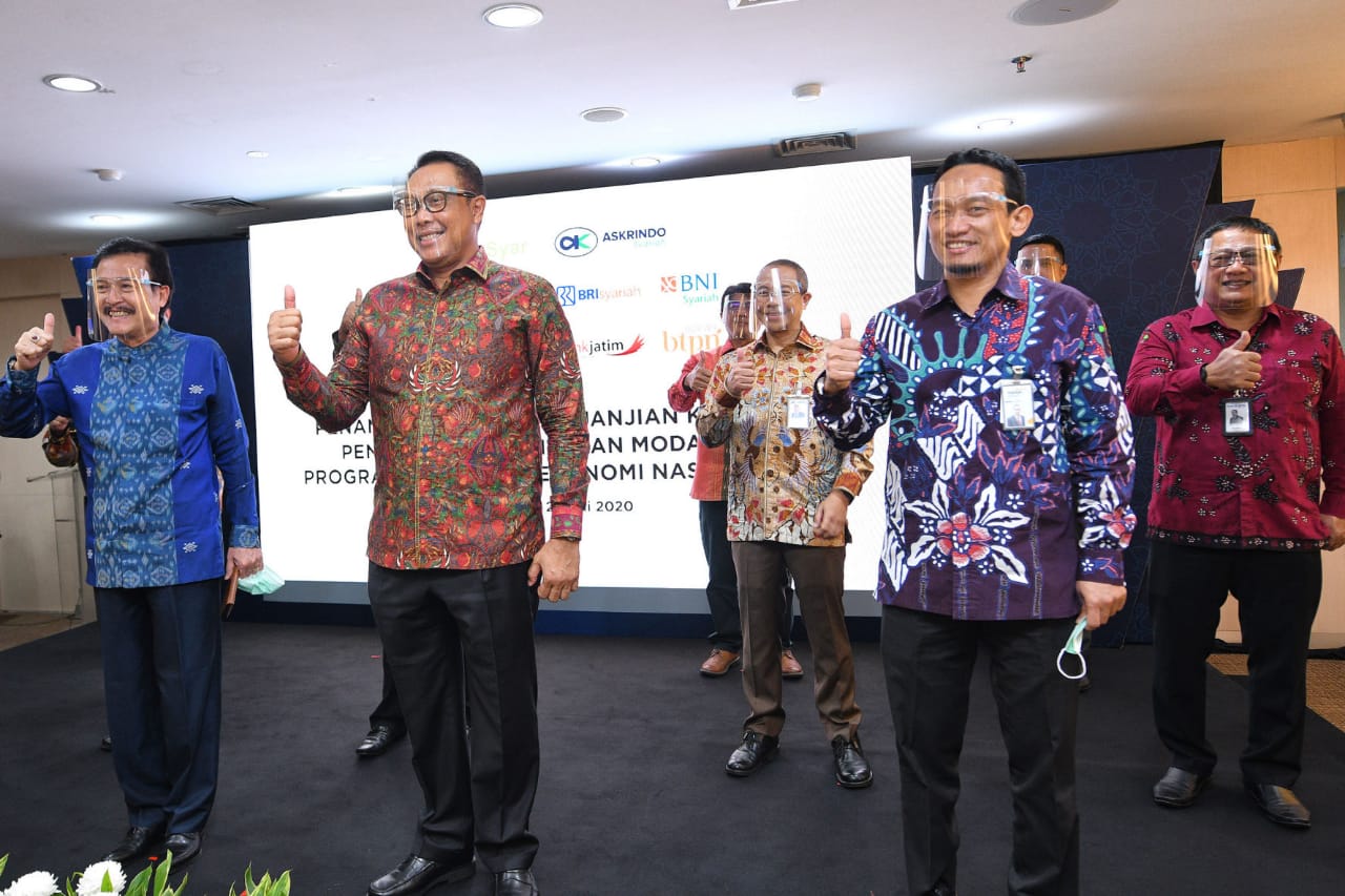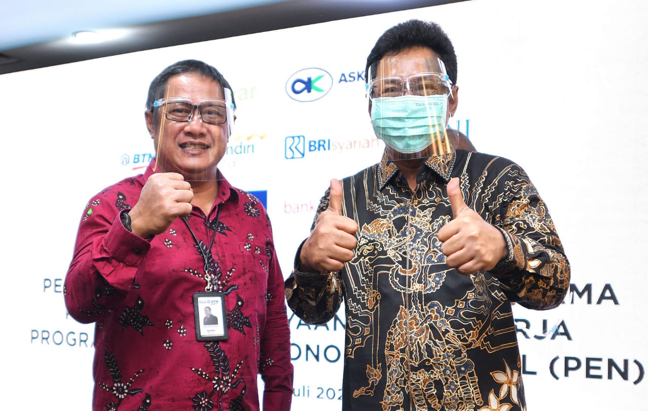 Kepala Divisi Syariah PT Bank Tabungan Negara (Persero) Tbk. Alex Sofyan Noor mengacungkan jempol bersama Direktur Utama PT Penjaminan Jamkrindo Syariah Gatot Suprabowo usai penandatanganan Perjanjian Kerjasama Penjaminan Pembiayaan/Pinjaman Program Pemulihan Ekonomi Nasional (PEN) dengan skema Syariah di Jakarta, Senin (27/7). Melalui penandatanganan tersebut, nasabah Unit Usaha Syariah Bank BTN yang menerima pembiayaan program PEN akan mendapat fasilitas jaminan pembiayaan Syariah oleh Jamkrindo Syariah. Bank BTN berkomitmen akan terus mendukung pemerintah dalam program PEN terutama dalam rangka membantu sektor riil terdampak pandemi Covid-19.