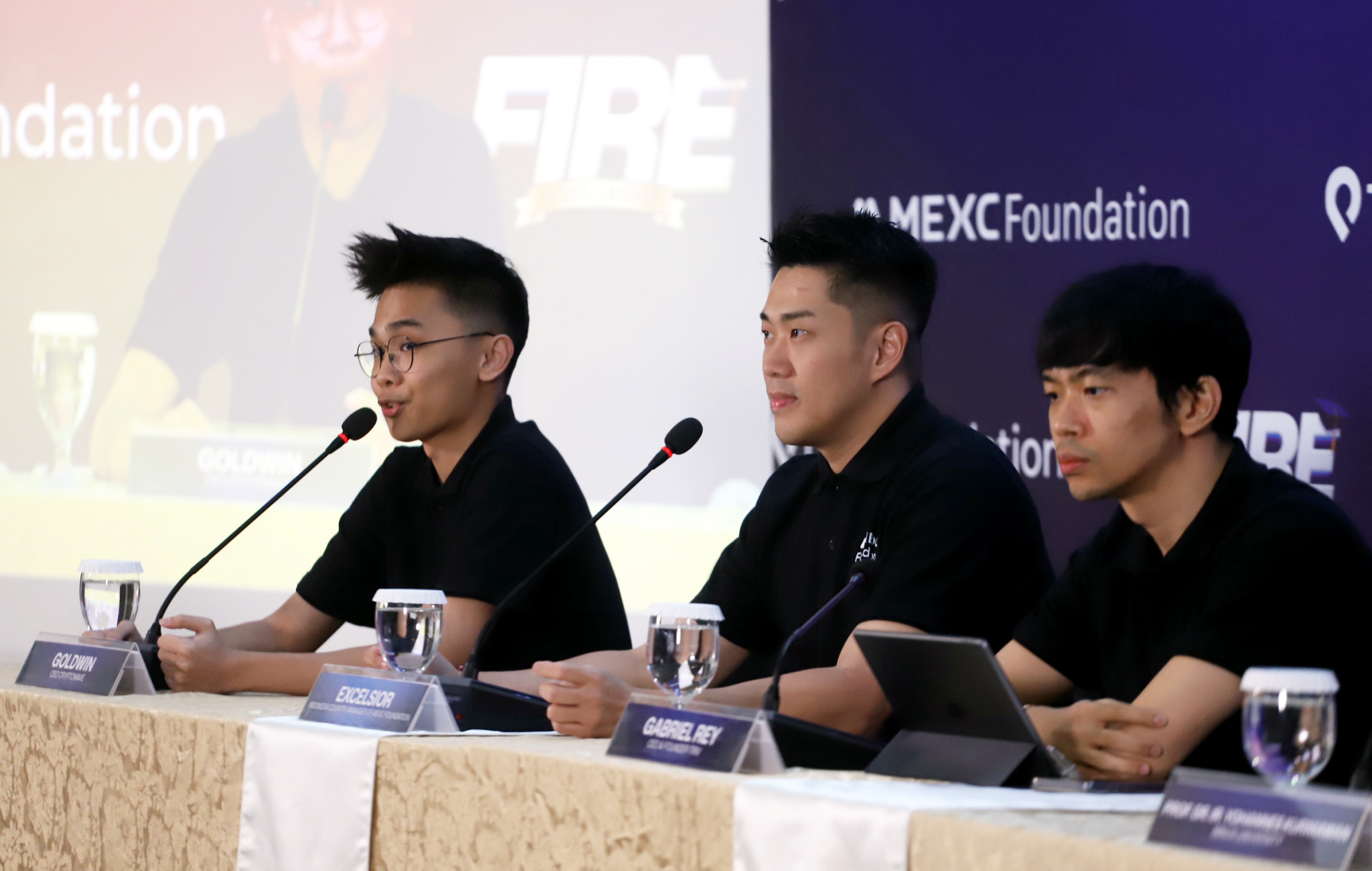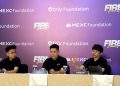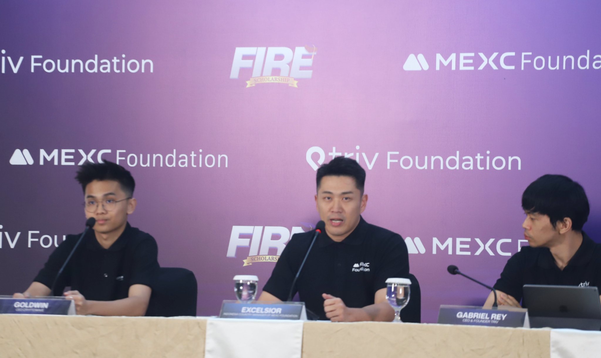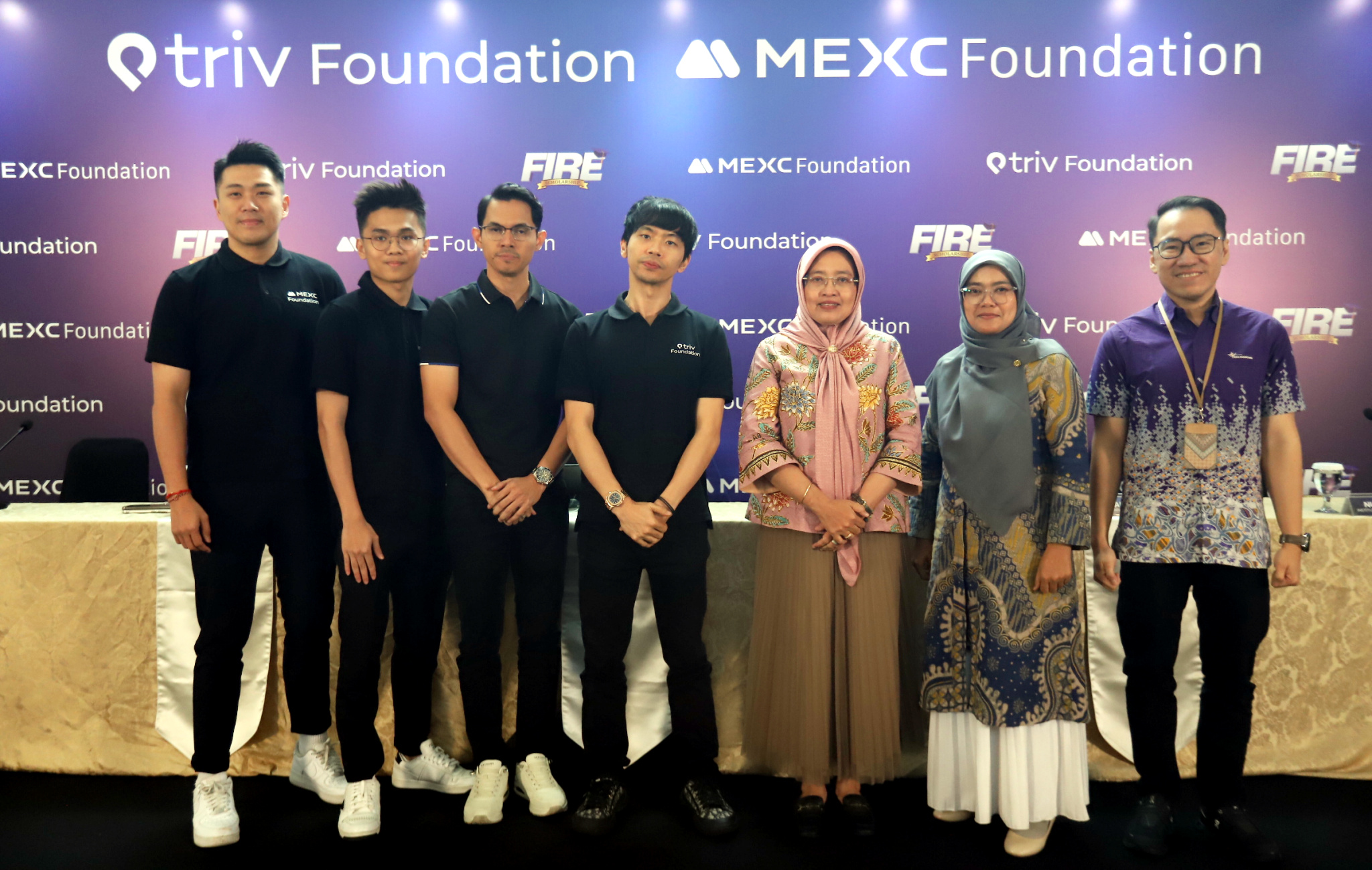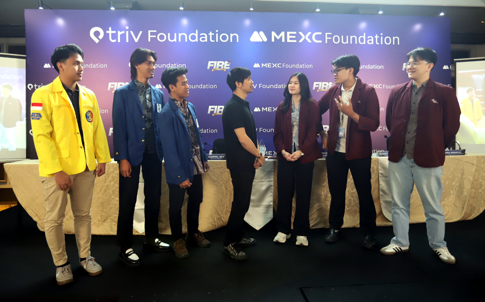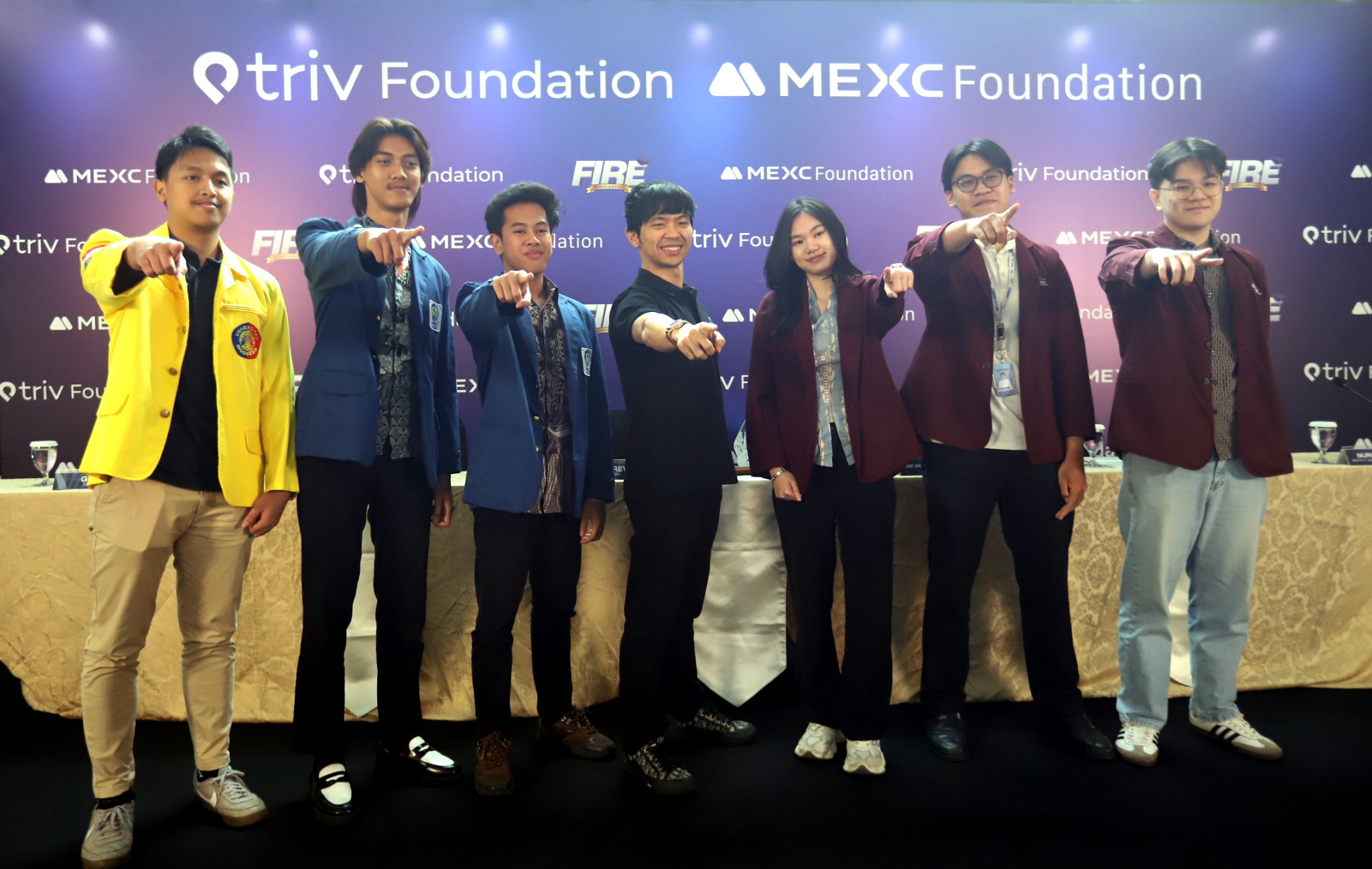 Dari kiri ke kanan, Indonesia Country Manager Mexc Foundation Excelsior, CEO Cryptowave Goldwin, CMO TRIV Jordan Simanjutak, CEO & Founder TRIV Foundation Gabriel Rey, Wakil Rektor 1 Institut Sepuluh Nopember (ITS) Nurul Widiastuti, Kasubdit Beasiswa Universitas Indonesia Rosmalita, dan Vice Rector Student Affairs BINUS University Yohannes Kurniawan berfoto usai jumpa pers F.I.R.E Scholarship, di Jakarta, Kamis (15/1/2026). Program Beasiswa F.I.R.E (Future Innovators in Rising Economy) yang diusung Triv Foundation berkolaborasi dengan MEXC Foundation mendapatkan