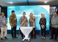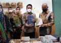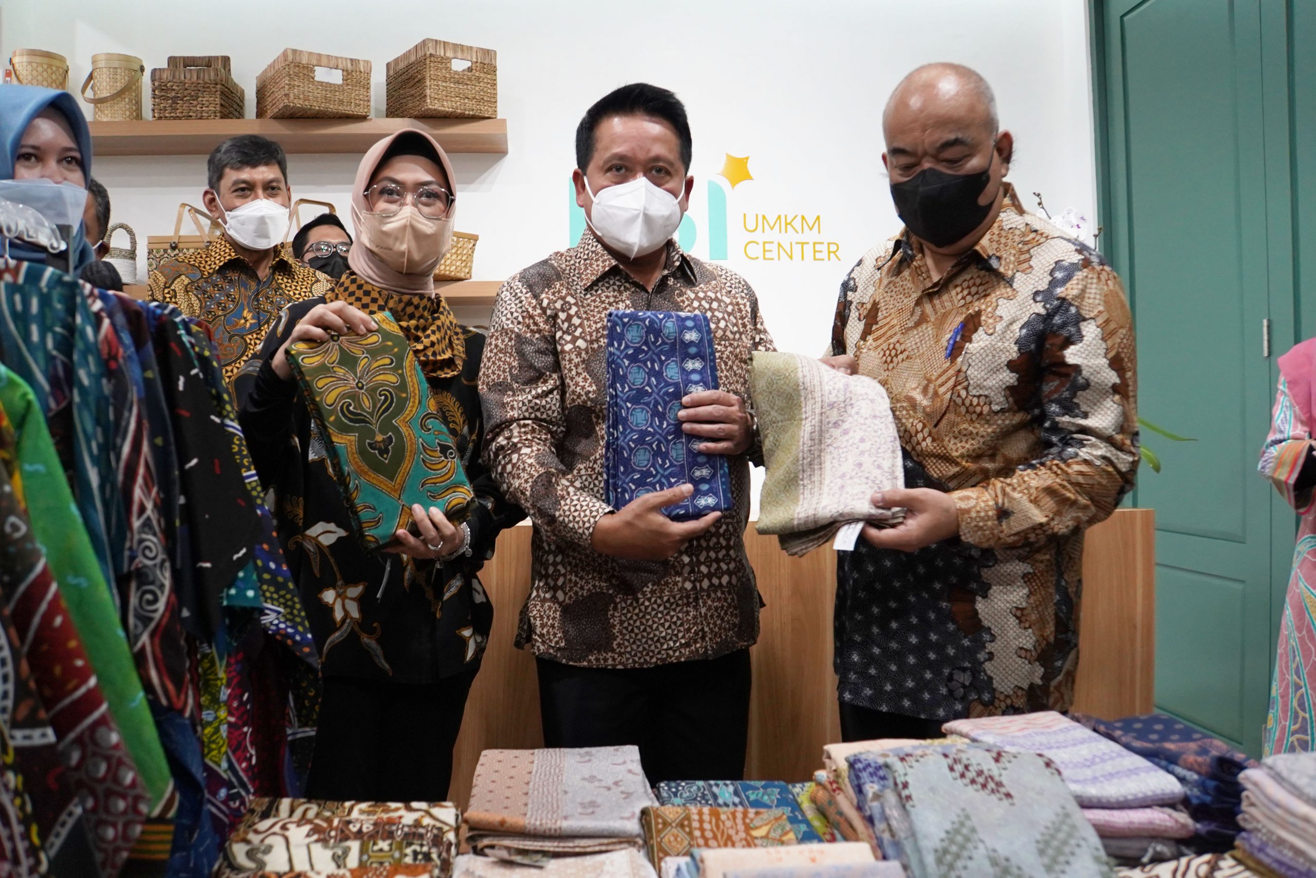 Direktur Utama BSI Hery Gunardi (kanan), Wakil Gubernur DIY Sri Paduka Paku Alam X (tengah), dan Direktur Compliance & Human Capital BSI Tribuana Tunggadewi (kiri) menunjukan kain batik salah satu produksi UMKM rekanan BSI Yogyakarta saat kunjungan di BSI UMKM Center Yogyakarta (9/6).
